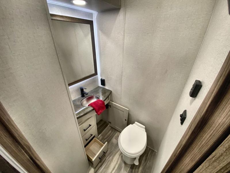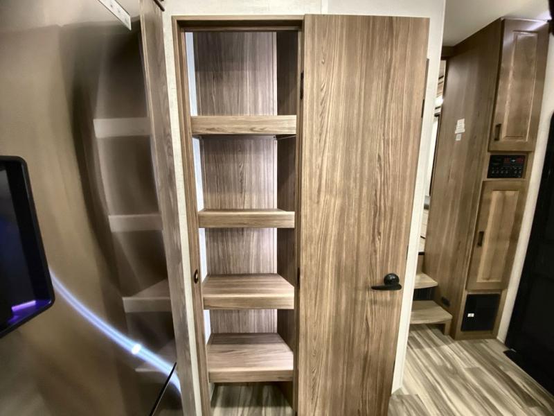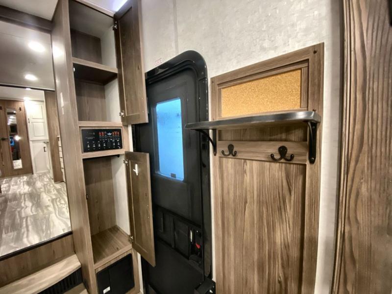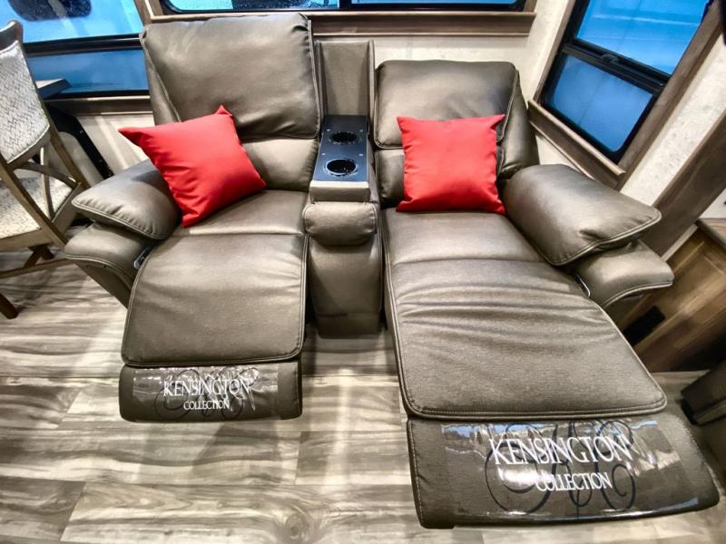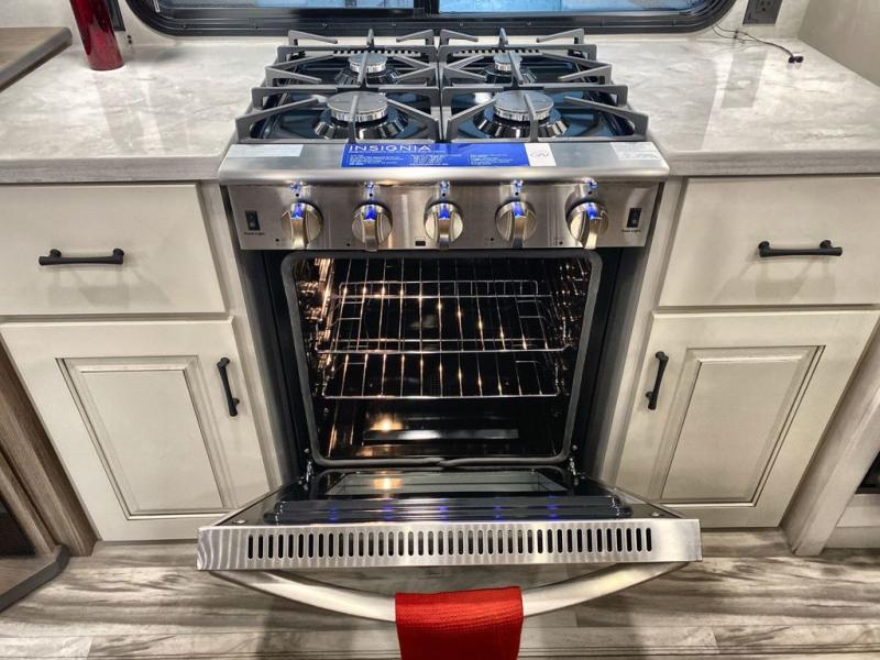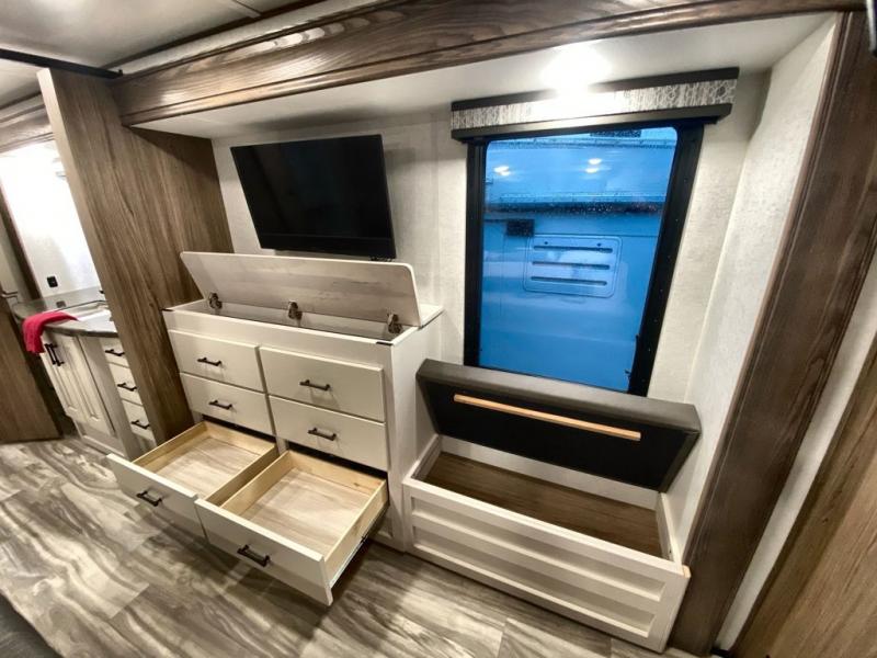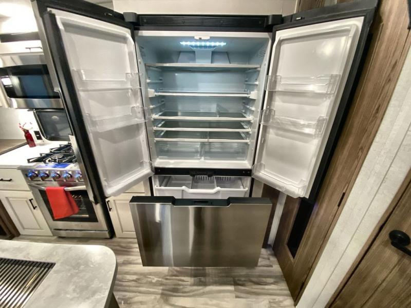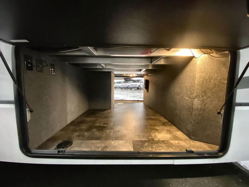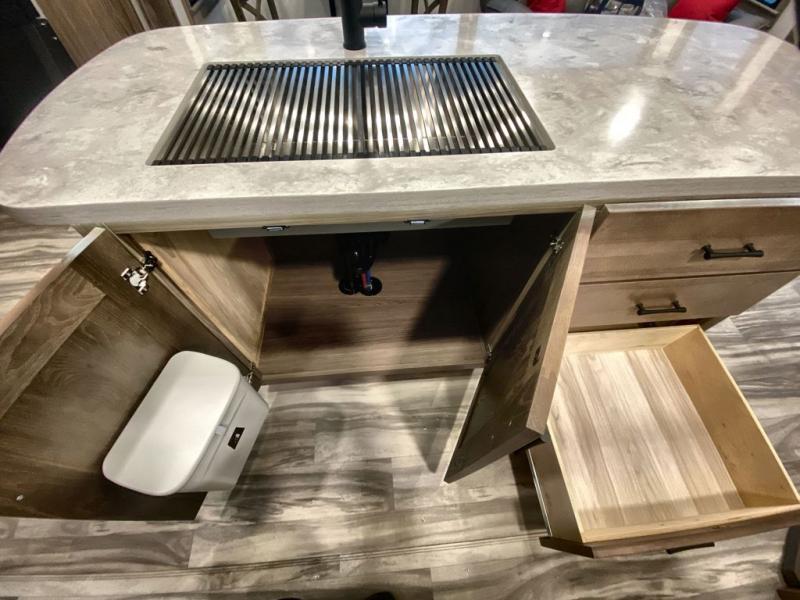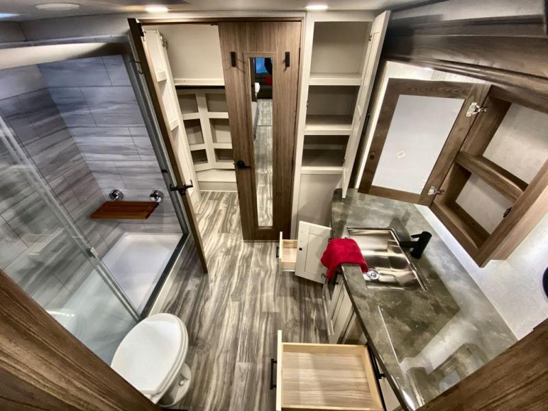 Whether you decide to be a full-timer or a long-trip traveler, this Paradigm offers so many comforts and conveniences you will love! The large full bathroom might be the reason you decide to be a new owner because you will have a large 61" x 30" shower to get cleaned up in, linen storage, and a walk-in closet with a hamper, shelves, and a space prepped for an optional washer/dryer. The bedroom allows you to sleep like a king and gives you extra floor space with the two slides, and there is storage in the flip-top dresser and under the seat, plus you can watch the Smart TV. The space saving sliding doors offer style as well. The cook will love all the residential appliances, you can even choose the residential refrigerator option. The kitchen island gives you a stainless steel farm sink and a place to add a dishwasher option. The half bath is super convenient just like the entry sitting bench/coat rack and closet. And you can relax on the sleeper sofa or the dual recliner love seat. There is so much more to see!