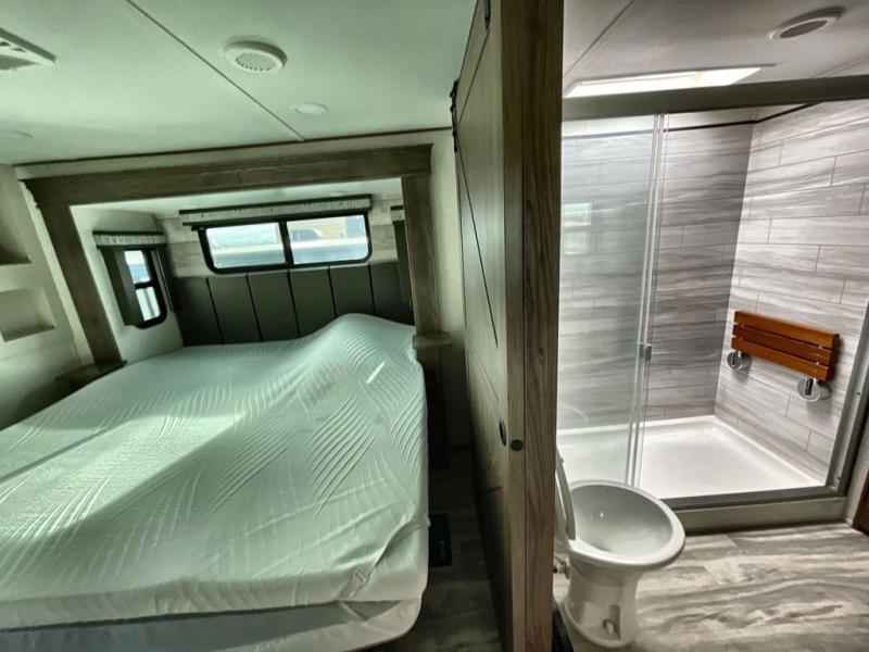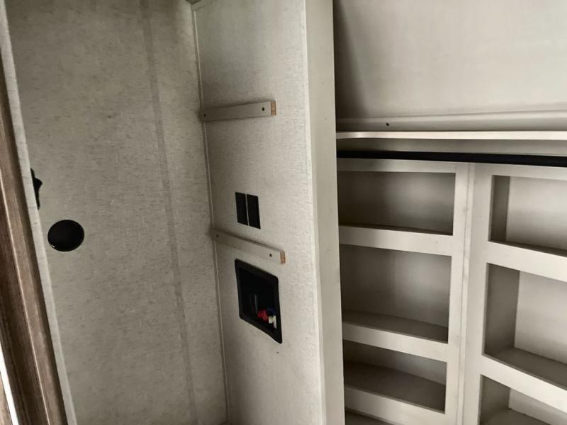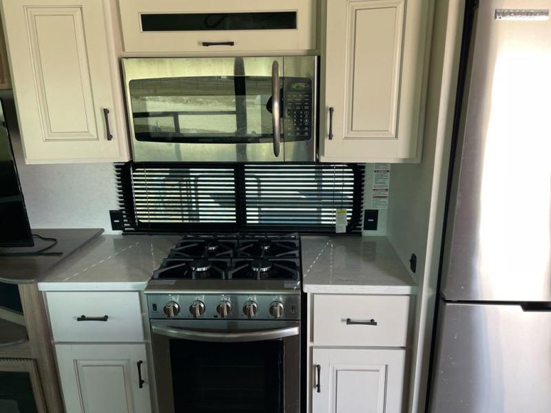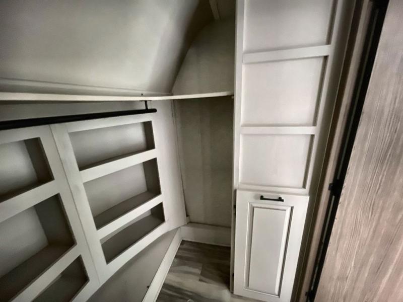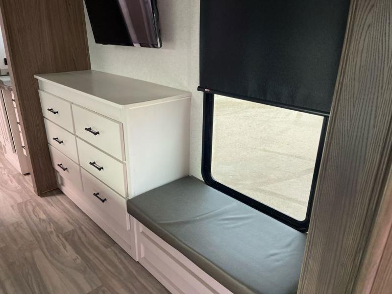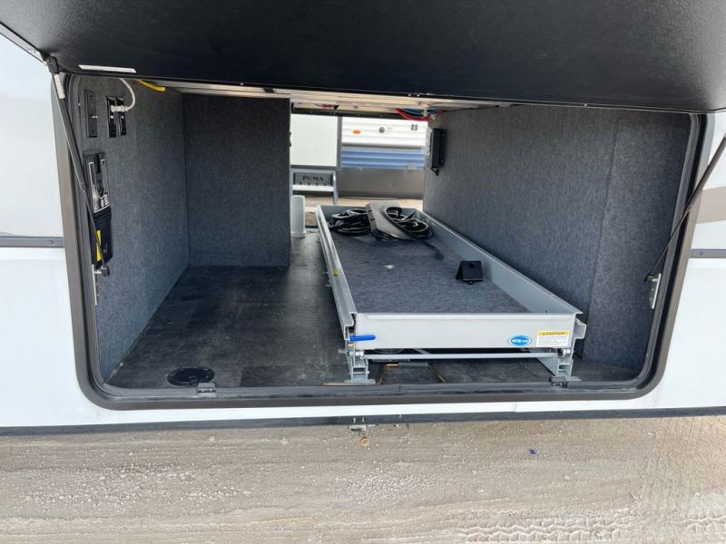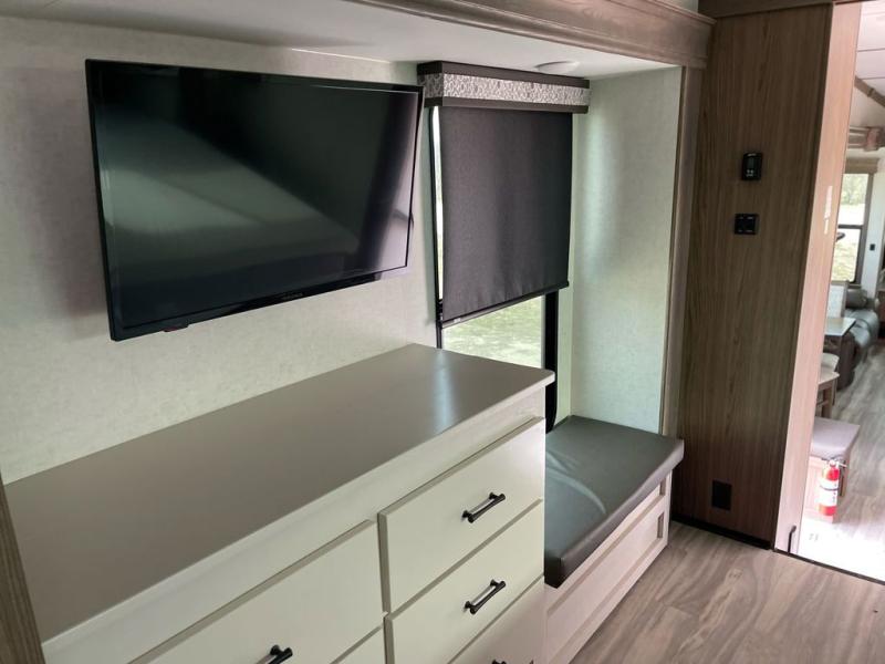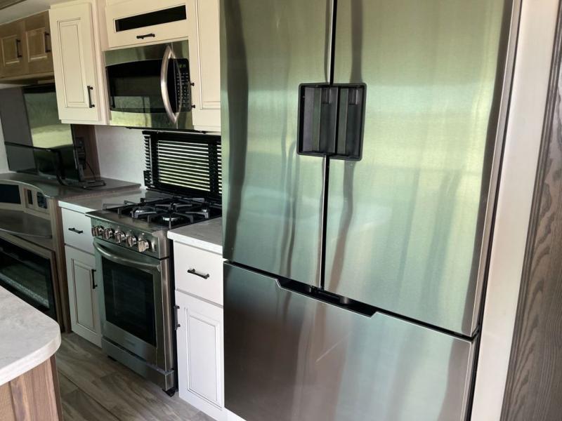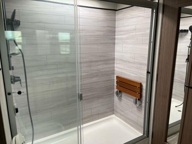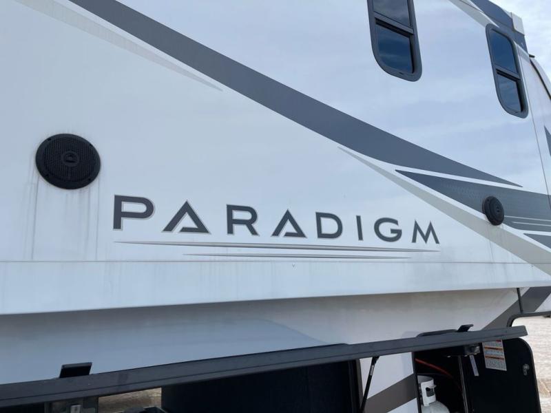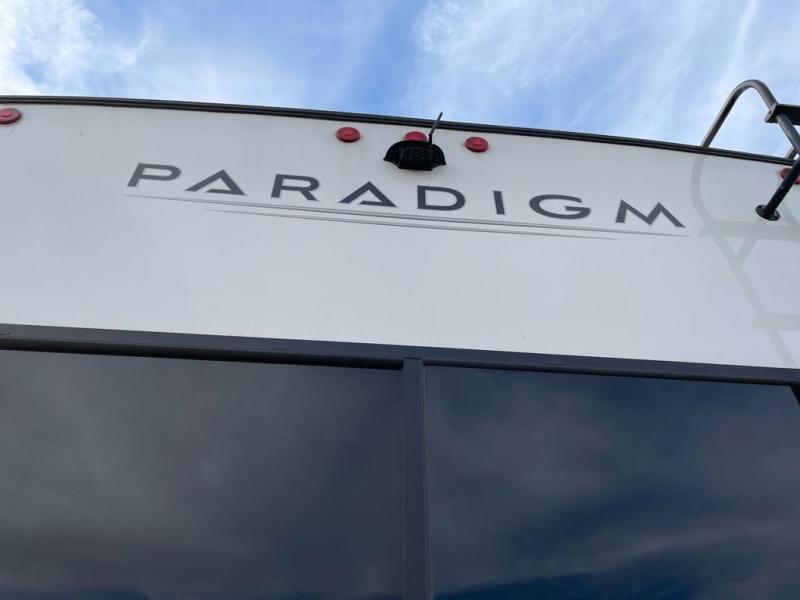 Whether you decide to be a full-timer or a long-trip traveler, this Paradigm offers so many comforts and conveniences you will love! The large full bathroom might be the reason you decide to be a new owner because you will have a large 61" x 30" shower to get cleaned up in, linen storage, and a walk-in closet with a hamper, shelves, and a space prepped for an optional washer/dryer. The bedroom allows you to sleep like a king and gives you extra floor space with the two slides, and there is storage in the flip-top dresser and under the seat, plus you can watch the Smart TV. The space saving sliding doors offer style as well. The cook will love all the residential appliances, you can even choose the residential refrigerator option. The kitchen island gives you a stainless steel farm sink and a place to add a dishwasher option. The half bath is super convenient just like the entry sitting bench/coat rack and closet. And you can relax on the sleeper sofa or the dual recliner love seat. There is so much more to see!