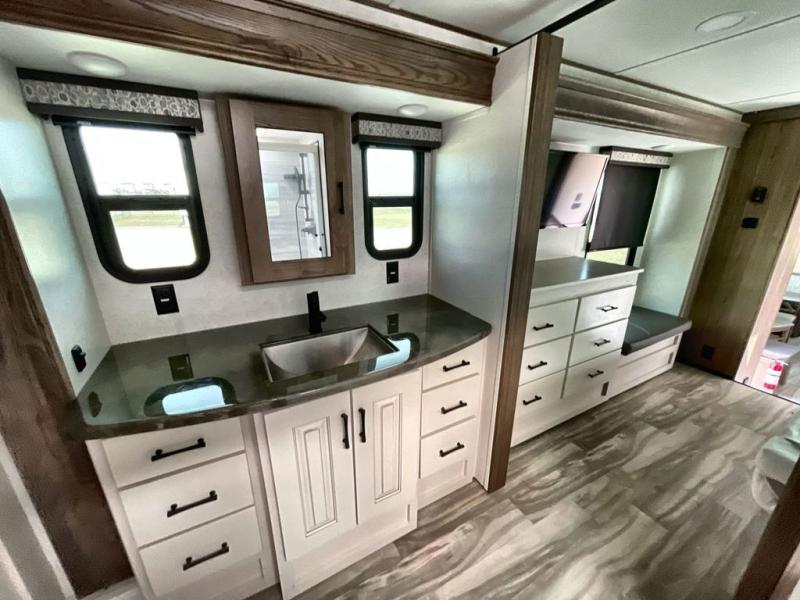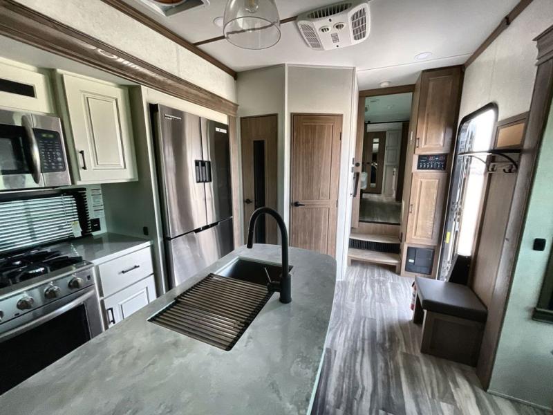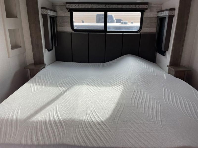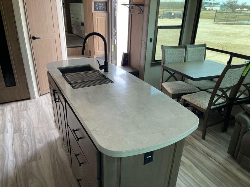 The Paradigm fifth wheels by Alliance RV are functional, high-quality, and luxurious for an unforgettable camping experience. There are three A/C units and a 40K BTU furnace to keep you comfortable year around, and you'll appreciate additional convenient amenities, like the all-in-one enclosed/heated utility center and the color coded and numbered wiring. A Roto-Flex pin box comes standard for hassle-free towing, along with Super-G 4,400 lb. rated tires and Dexter 7,000 lb. axles. You'll love the kitchen with its LG solid surface countertops and Insignia range, plus there is LED motion lighting in the pantry and a Maxx fan with a rain sensor to keep everything fresh when making dinner. Each model also includes an HD Smart TV in the living room and bedroom, plus a Winegard Air 360 antenna to keep you connected to the outside world. And of course there are a variety of options you can choose from to further customize your fifth wheel; dual pane windows, Super Solar Plus, slide out awning toppers, and generator prep or a generator to name a few!