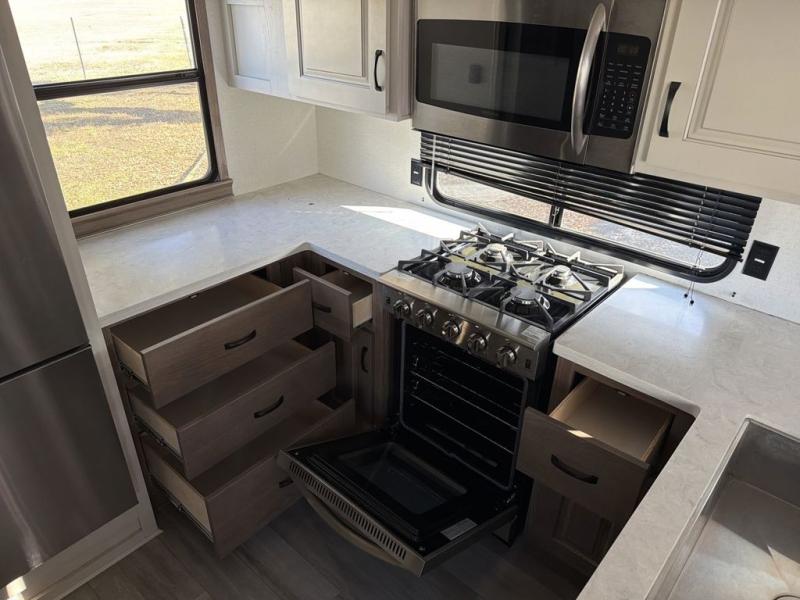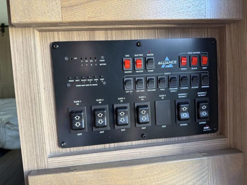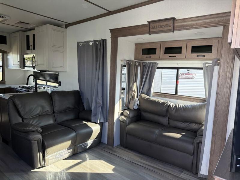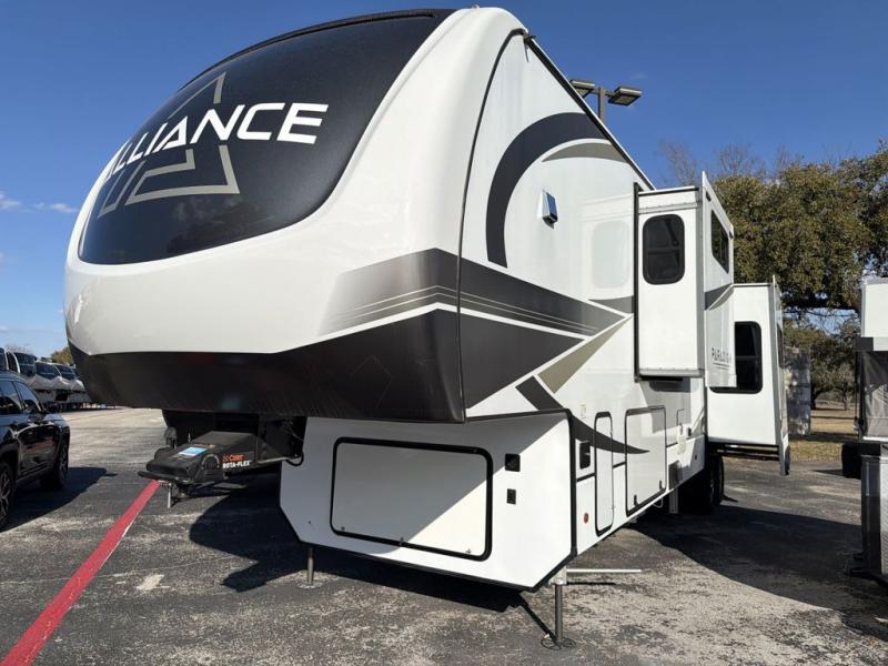 The Paradigm fifth wheels by Alliance RV are functional, high-quality, and luxurious for an unforgettable camping experience. There are three A/C units and a 40K BTU furnace to keep you comfortable year around, and you'll appreciate additional convenient amenities, like the all-in-one enclosed/heated utility center and the color coded and numbered wiring. A Roto-Flex pin box comes standard for hassle-free towing, along with Super-G 4,400 lb. rated tires and Dexter 7,000 lb. axles. You'll love the kitchen with its LG solid surface countertops and Insignia range, plus there is LED motion lighting in the pantry and a Maxx fan with a rain sensor to keep everything fresh when making dinner. Each model also includes an HD Smart TV in the living room and bedroom, plus a Winegard Air 360 antenna to keep you connected to the outside world. And of course there are a variety of options you can choose from to further customize your fifth wheel; dual pane windows, Super Solar Plus, slide out awning toppers, and generator prep or a generator to name a few!