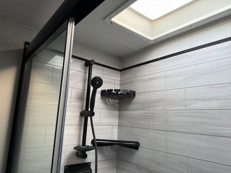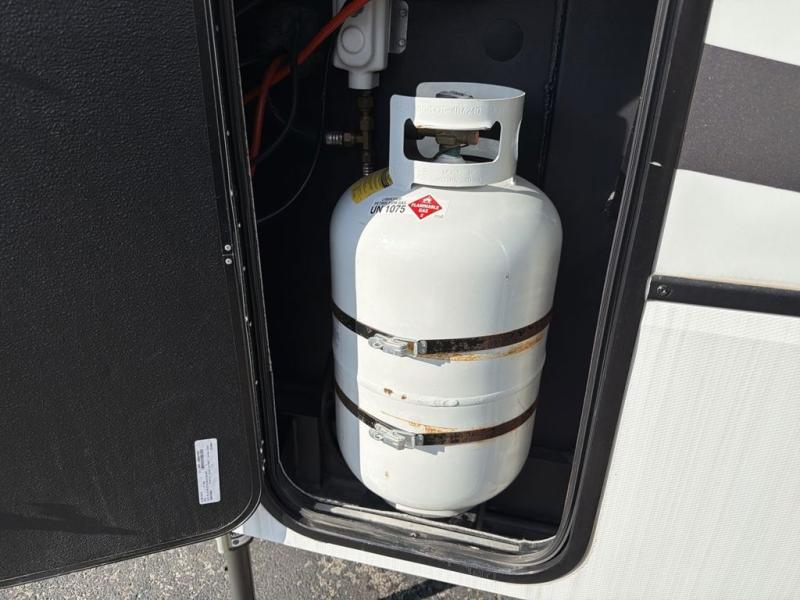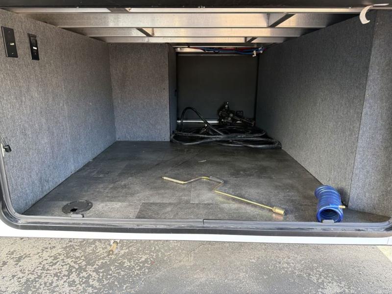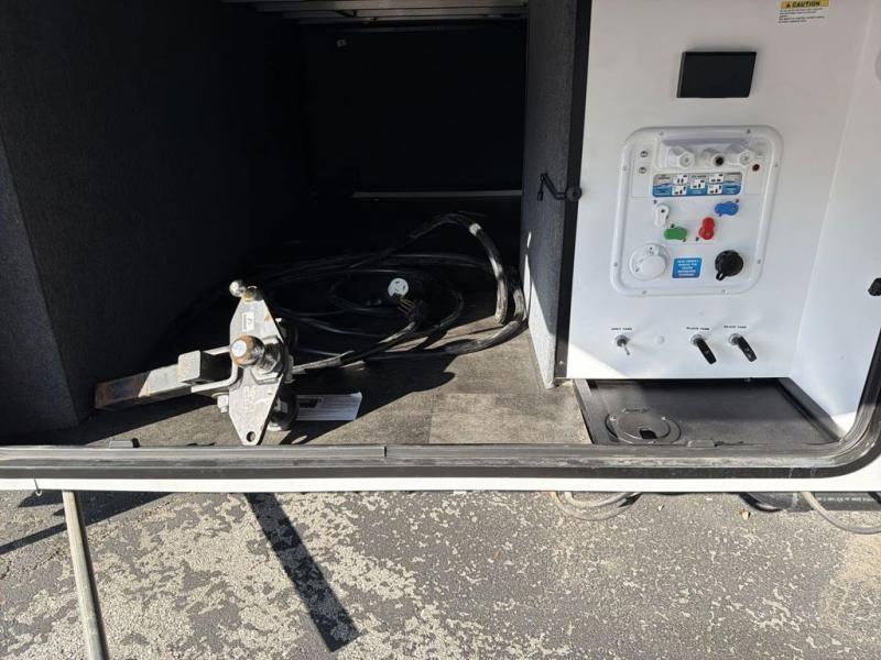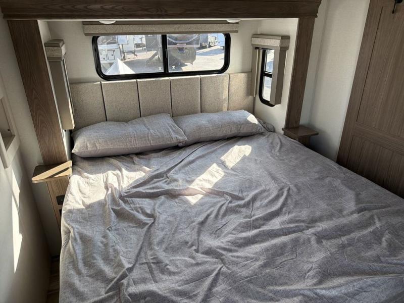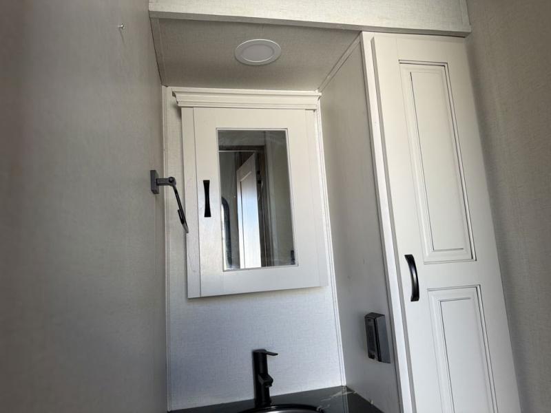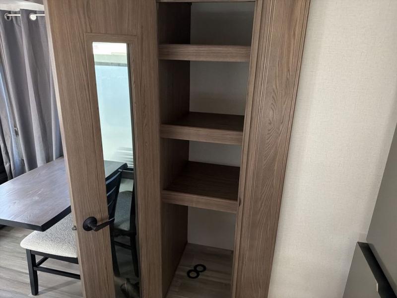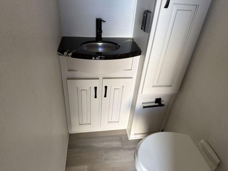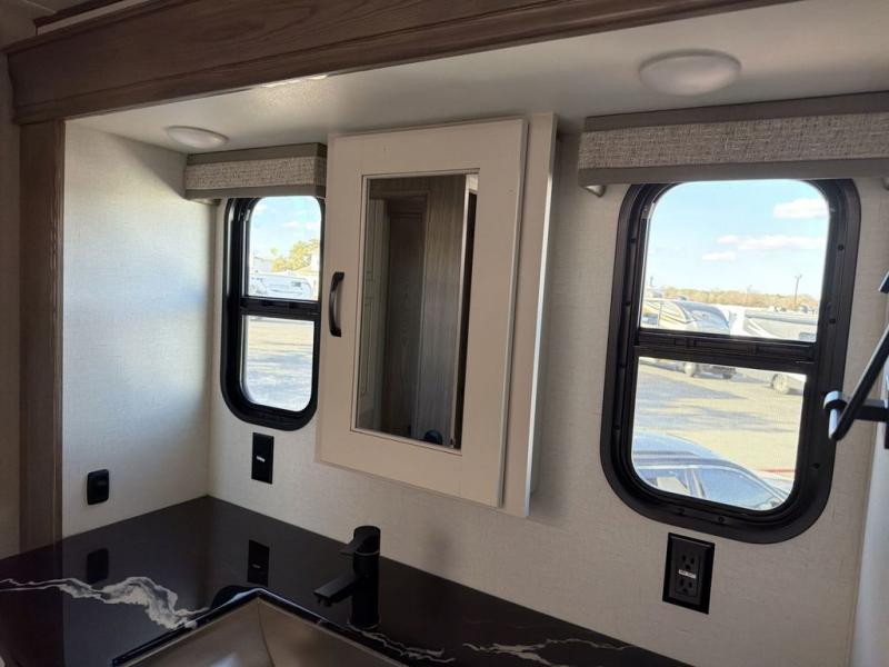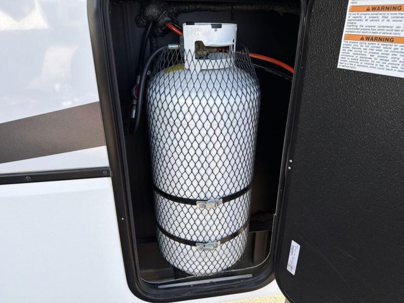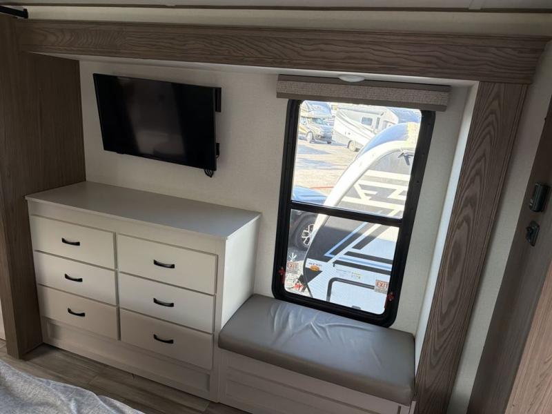 You won't want to camp any other way once you step inside this travel trailer! the chef will enjoy all of the space in the rear kitchen with ample counter space, a 19 cu. ft. 12 volt residential refrigerator, and a pantry for snacks. Everyone will love to meet in the middle living area that includes dual sleeper sofas and a dual recliner loveseat across from the 50" Smart TV and fireplace. The half bathroom is nearby for quick bathroom breaks too. You will feel right at home in the master suite with a king bed slide to lay your head on at night, a flip top dresser with a Smart TV above it to watch your movies in true comfort, and a seat with storage, plus access to the front full bathroom. Inside the bathroom, you will find a 61" x 30" shower to freshen up in and a walk-in closet with a hamper, shelves, and an area prepped to add an optional washer and dryer for clean clothes throughout your entire trip!
