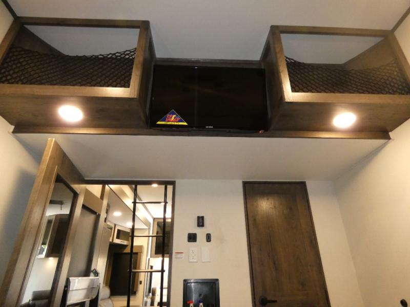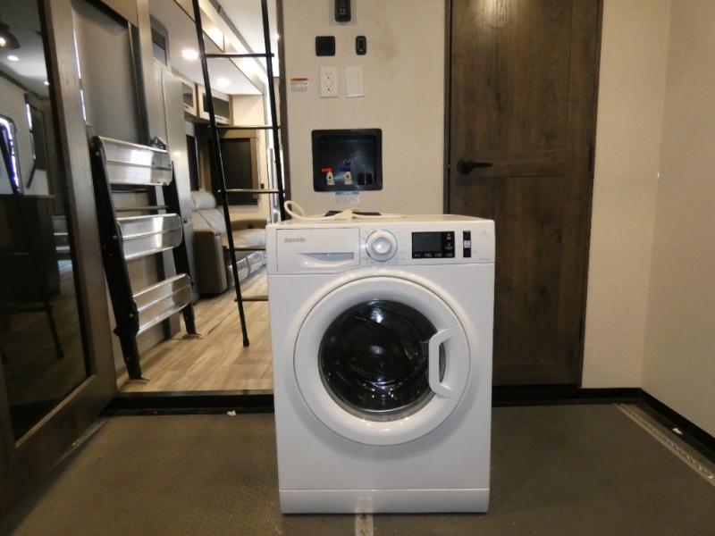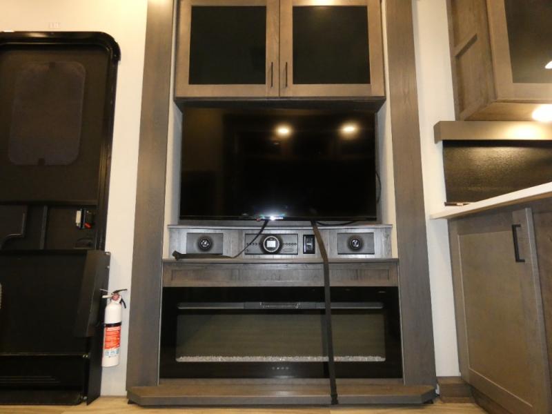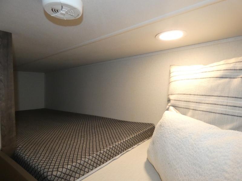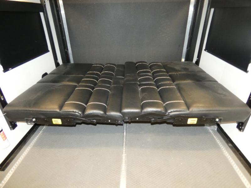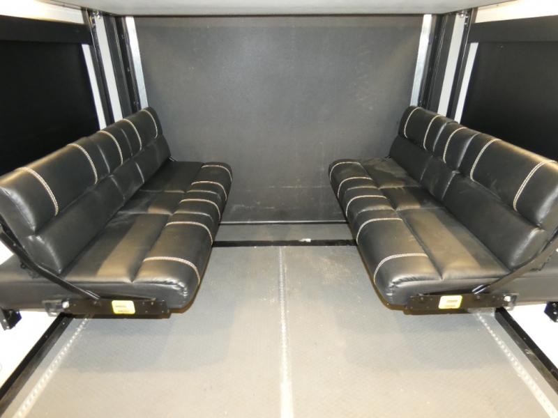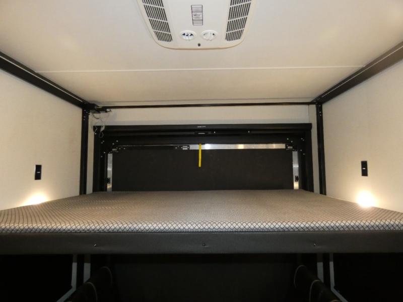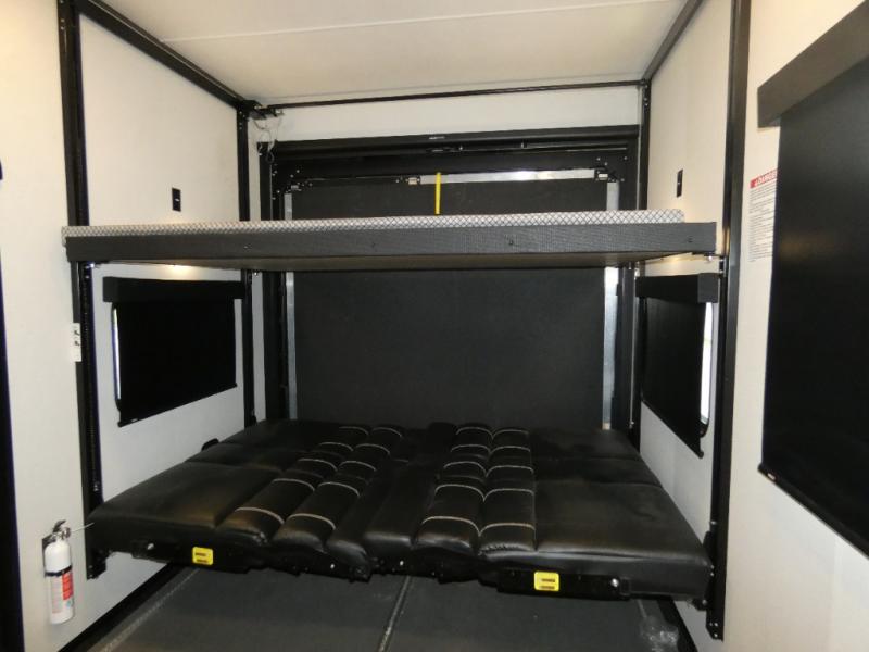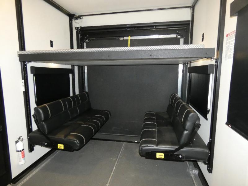 There is room for your off-road toys and the whole family in this toy hauler! The bath and a half makes life more convenient and the dual entry doors create a smooth flow of traffic in and out of the unit. Aside from 13' of garage space, an air compressor, and an entrance/exit door there are also opposing HappiJac sofas with a queen bed above them, a loft that opens to the living room, and a half bathroom. The chef can prepare their best meals with the four burner cooktop while two others sit at the flip up counter with two bar stools. After a fun day on the trails, wash up in the full bathroom with the 48" x 30" shower, grab your pajamas from the front wardrobe or flip top dresser in the front private bedroom then relax on one of the two sofas by the fireplace and Smart TV!