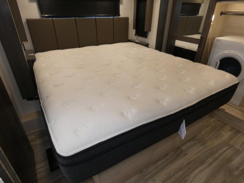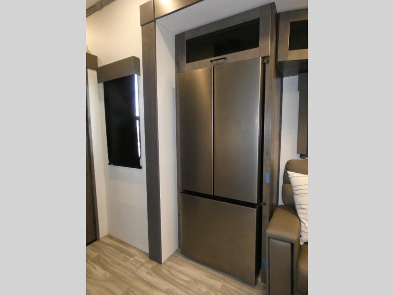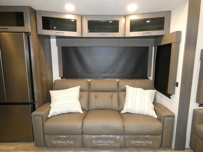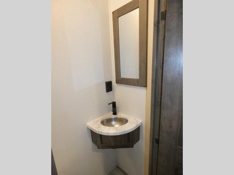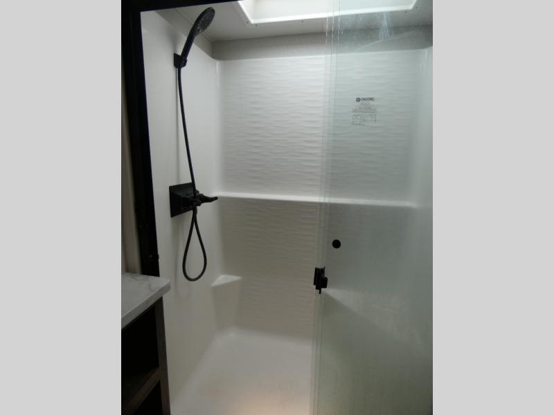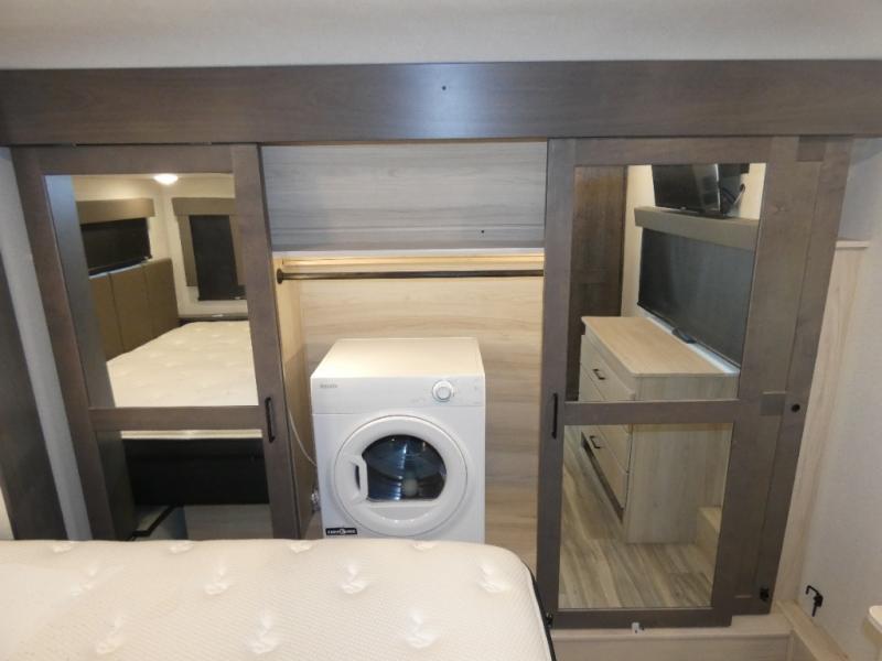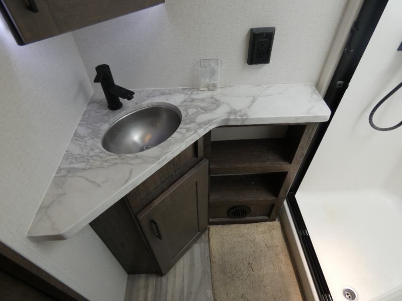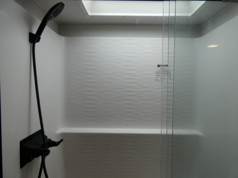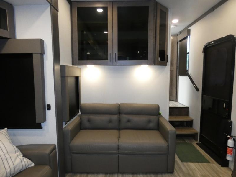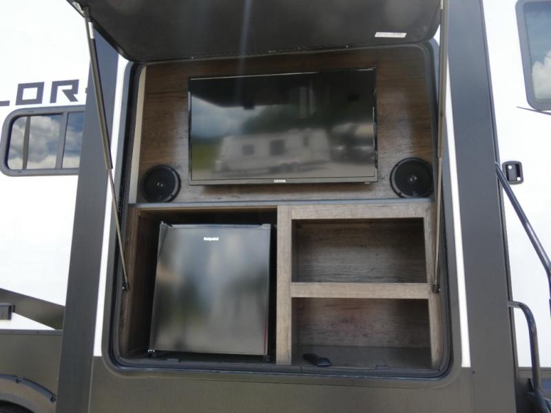 There is room for your off-road toys and the whole family in this toy hauler! The bath and a half makes life more convenient and the dual entry doors create a smooth flow of traffic in and out of the unit. Aside from 13' of garage space, an air compressor, and an entrance/exit door there are also opposing HappiJac sofas with a queen bed above them, a loft that opens to the living room, and a half bathroom. The chef can prepare their best meals with the four burner cooktop while two others sit at the flip up counter with two bar stools. After a fun day on the trails, wash up in the full bathroom with the 48" x 30" shower, grab your pajamas from the front wardrobe or flip top dresser in the front private bedroom then relax on one of the two sofas by the fireplace and Smart TV!