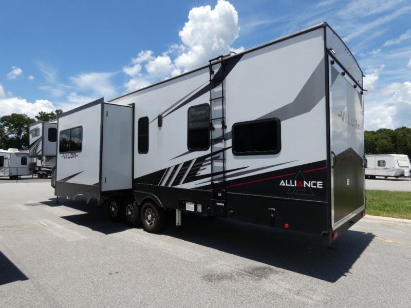 You can bring your toys with you wherever you go with any one of these Alliance RV Valor toy haulers! They are adventure-ready with a quality build from the walk on roof with seamless PVC roof covering to the commercial grade vinyl flooring and MorRyde CRE3000 suspension system. The Performance Running Gear package comes with a 101" wide-body benchmark chassis platform, 7,000 lb. Dexter axles, and a pass-through basement storage with an additional front compartment for all your gear. You can even go off-gridding thanks to the Off the Grid Pack that has two 320 watt solar panels, generator prep, a 40 amp charge controller, and a 100 amp hour lithium iron phosphate battery, plus a battery monitor system. Come find the right one for you today!