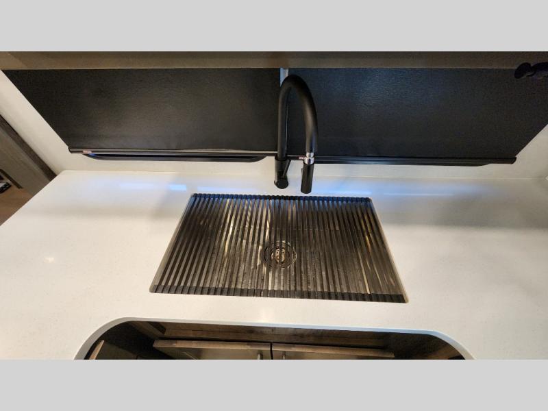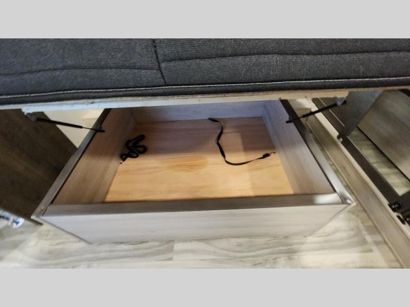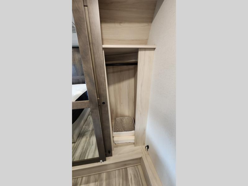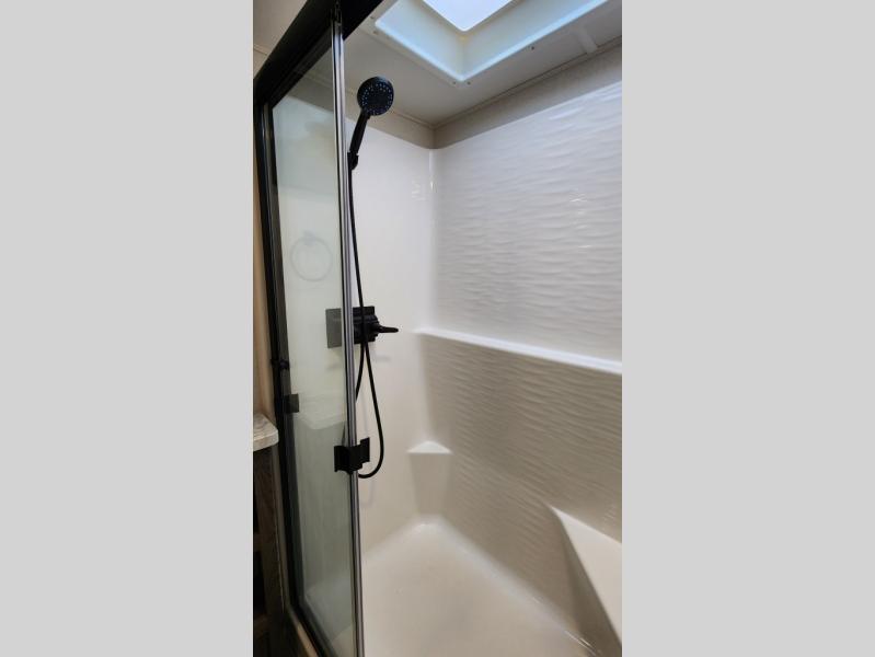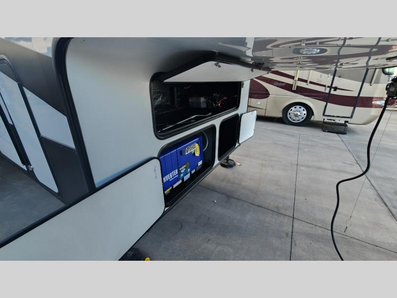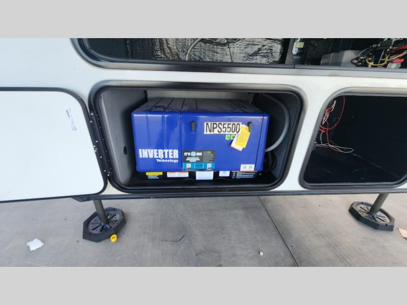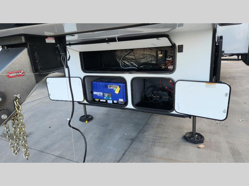 There is room for your off-road toys and the whole family in this toy hauler! The bath and a half makes life more convenient and the dual entry doors create a smooth flow of traffic in and out of the unit. Aside from 13' of garage space, an air compressor, and an entrance/exit door there are also opposing HappiJac sofas with a queen bed above them, a loft that opens to the living room, and a half bathroom. The chef can prepare their best meals with the four burner cooktop while two others sit at the flip up counter with two bar stools. After a fun day on the trails, wash up in the full bathroom with the 48" x 30" shower, grab your pajamas from the front wardrobe or flip top dresser in the front private bedroom then relax on one of the two sofas by the fireplace and Smart TV!