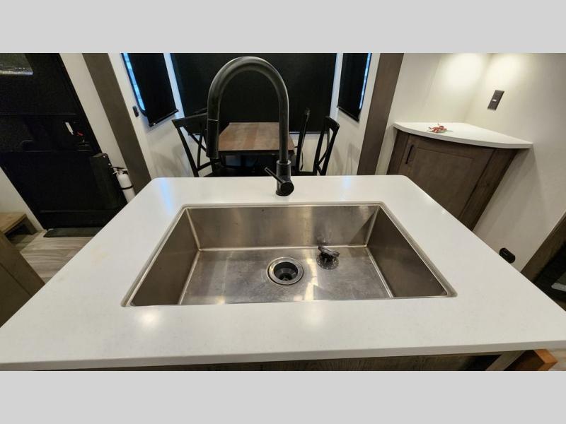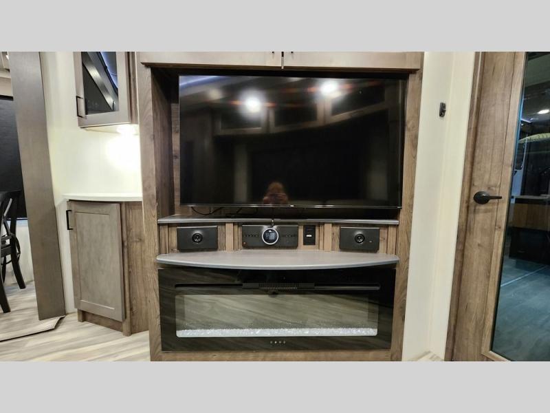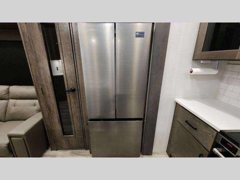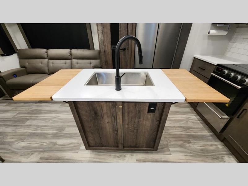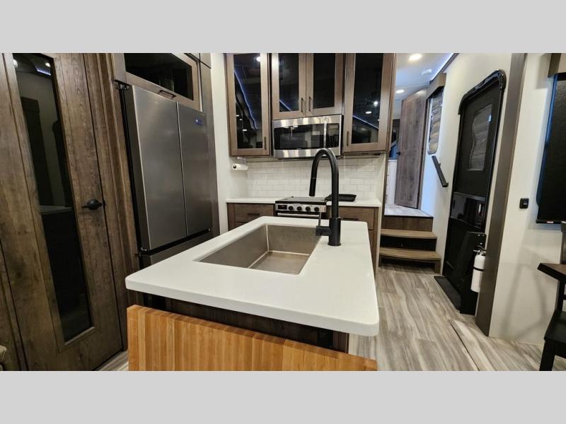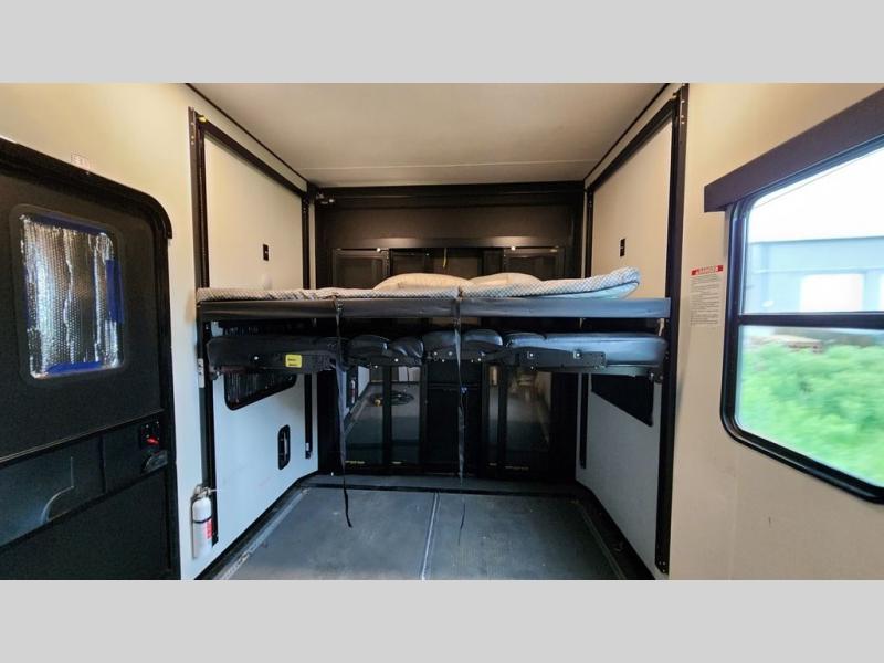 The whole gang will love camping in this toy hauler! There is 13' of garage space to store your off-road toys and once you have arrived at your destination you can set up the HappiJac roll-over sofas with a queen bed above them and the loft which opens to the living area. With two full bathrooms, everyone will stay squeaky clean. The chef can prepare their best meals with the kitchen island, three burner cooktop, and 17 cu. ft. stainless steel refrigerator while others play games at the table and chairs or relax by the fireplace on the sofa. The front private bedroom has a king bed slide for more walking around space, a flip top dresser, and a front wardrobe that is prepped to add an optional washer and dryer, plus it has an entrance into the dual entry bathroom!