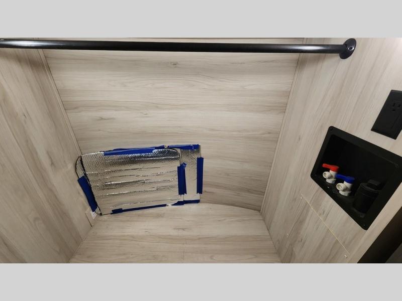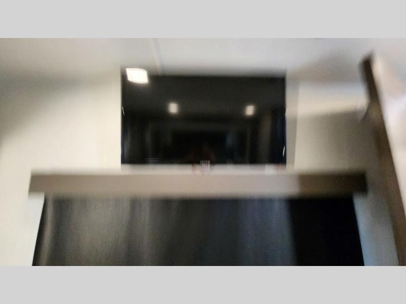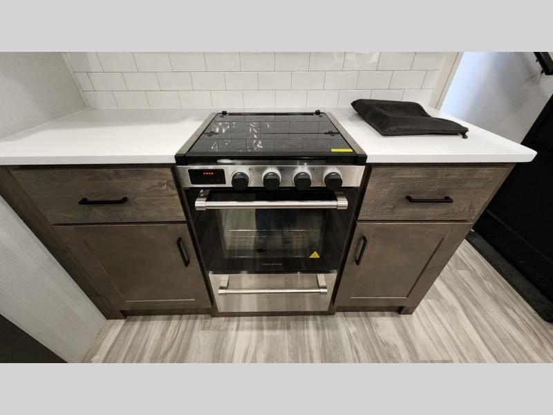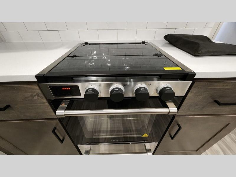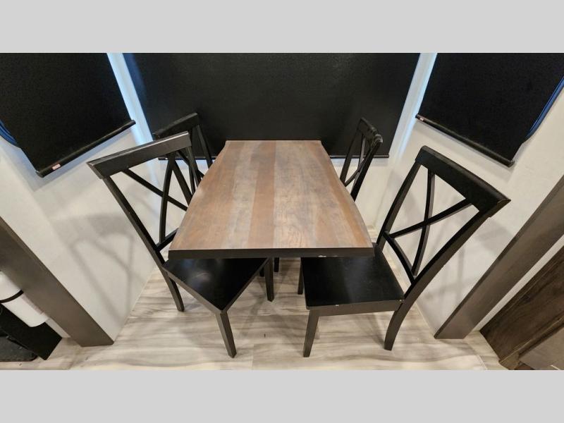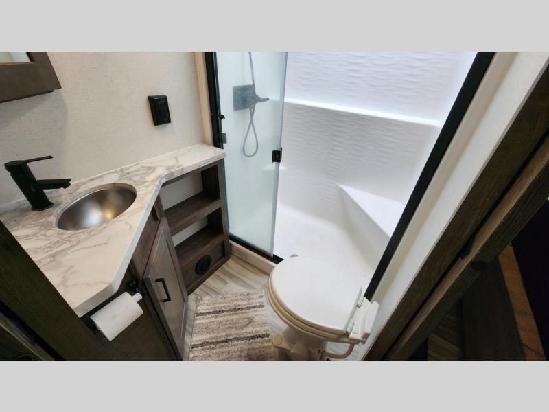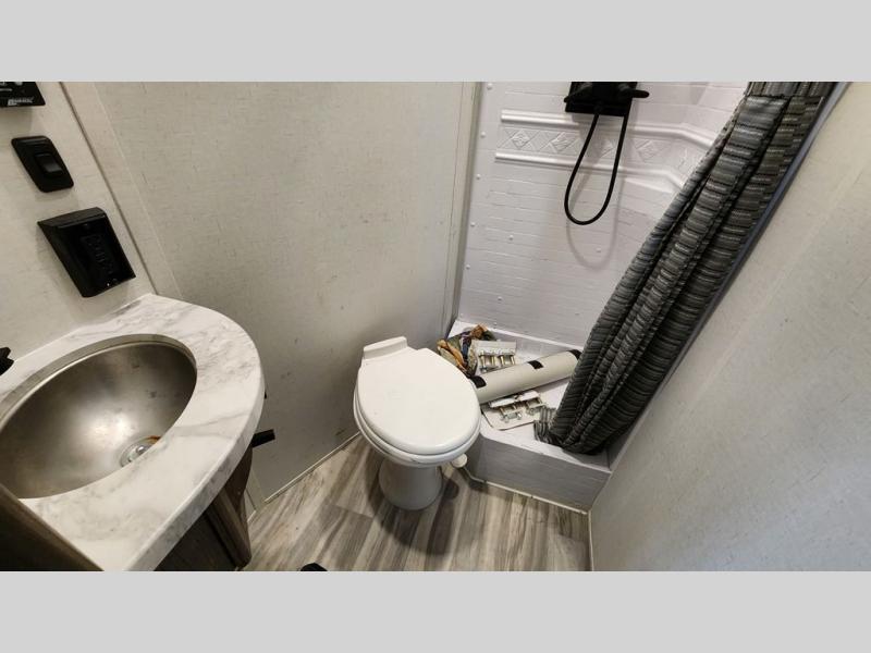 The whole gang will love camping in this toy hauler! There is 13' of garage space to store your off-road toys and once you have arrived at your destination you can set up the HappiJac roll-over sofas with a queen bed above them and the loft which opens to the living area. With two full bathrooms, everyone will stay squeaky clean. The chef can prepare their best meals with the kitchen island, three burner cooktop, and 17 cu. ft. stainless steel refrigerator while others play games at the table and chairs or relax by the fireplace on the sofa. The front private bedroom has a king bed slide for more walking around space, a flip top dresser, and a front wardrobe that is prepped to add an optional washer and dryer, plus it has an entrance into the dual entry bathroom!