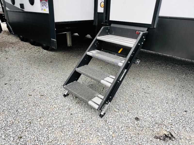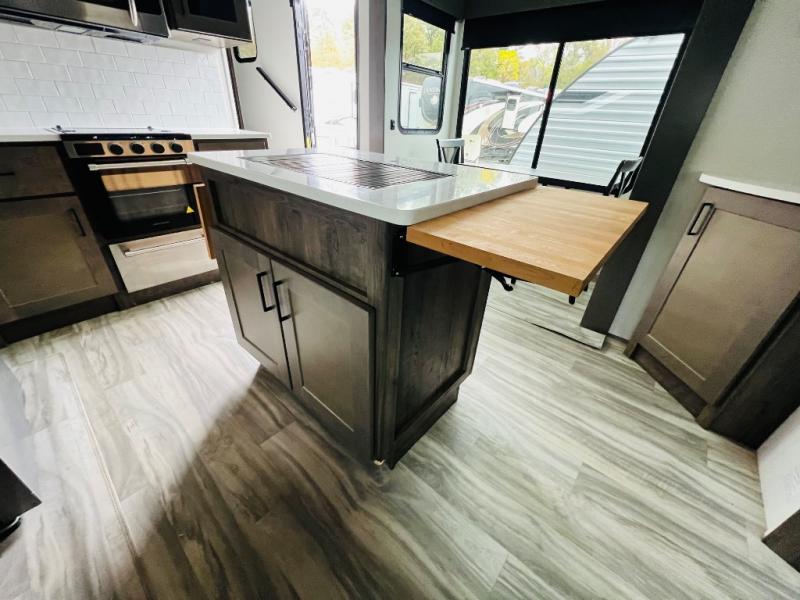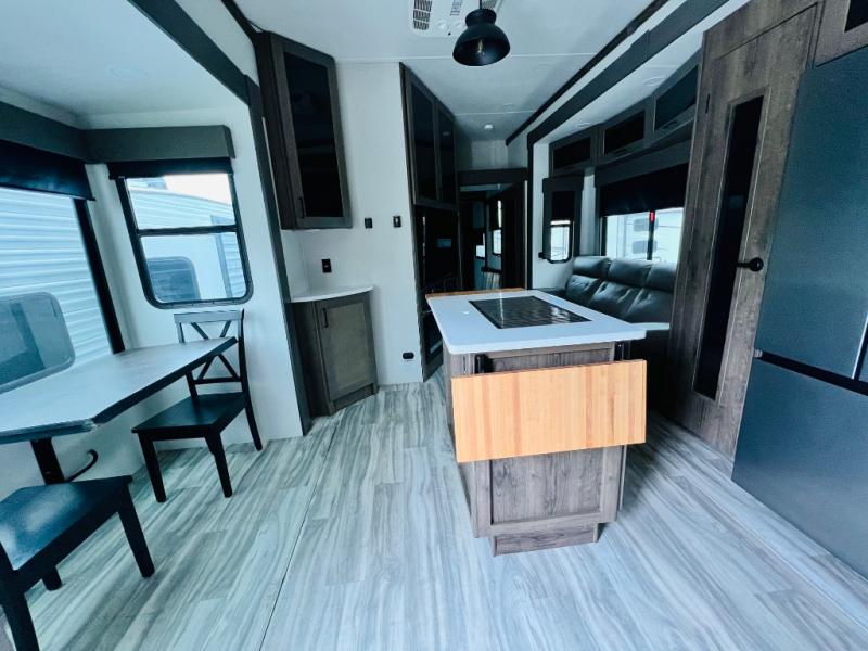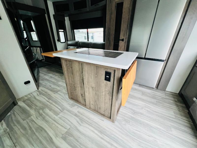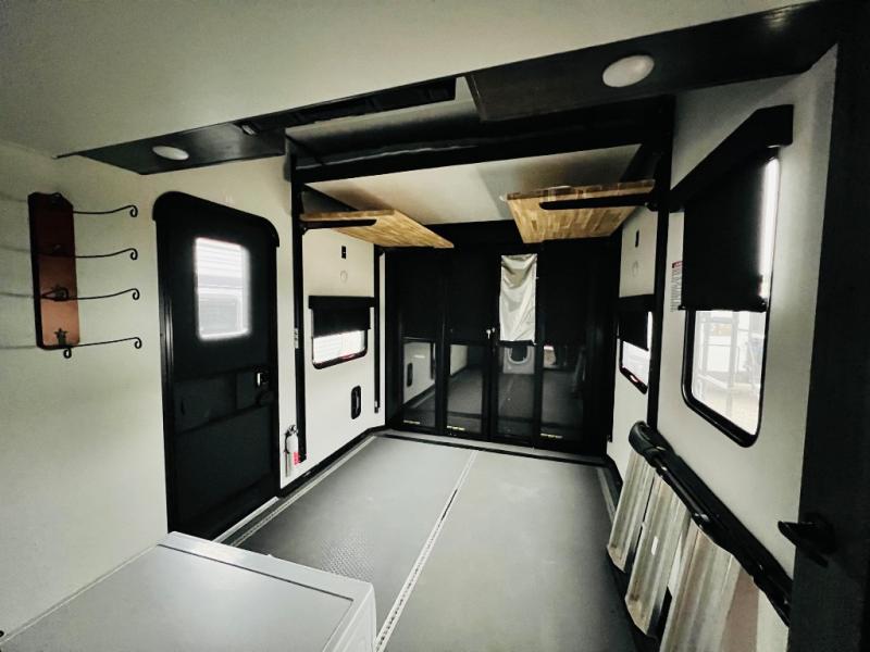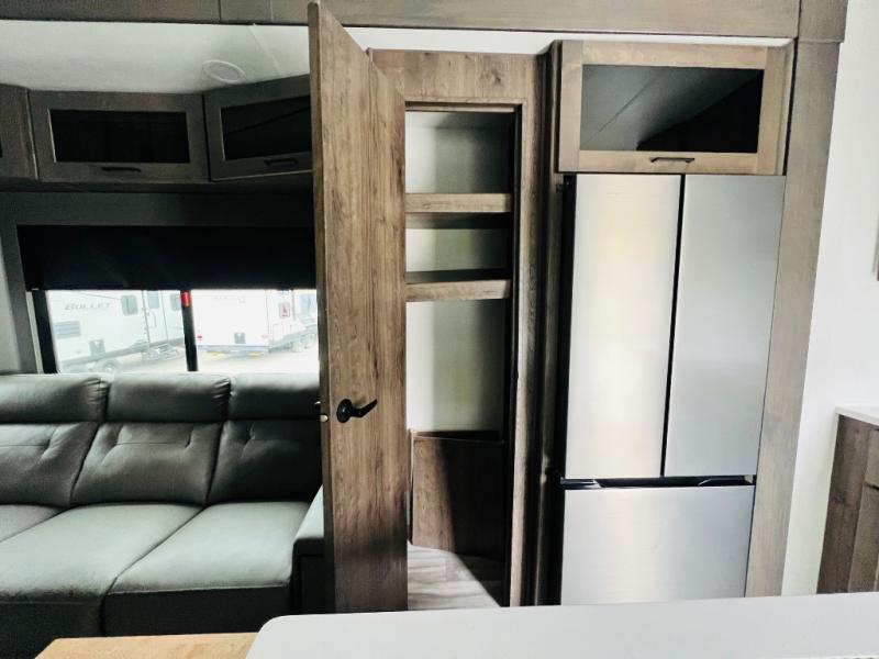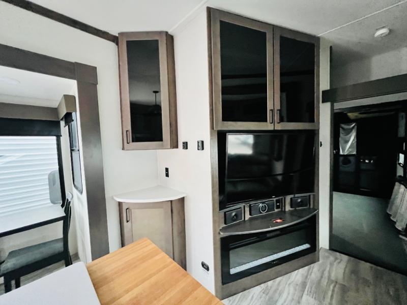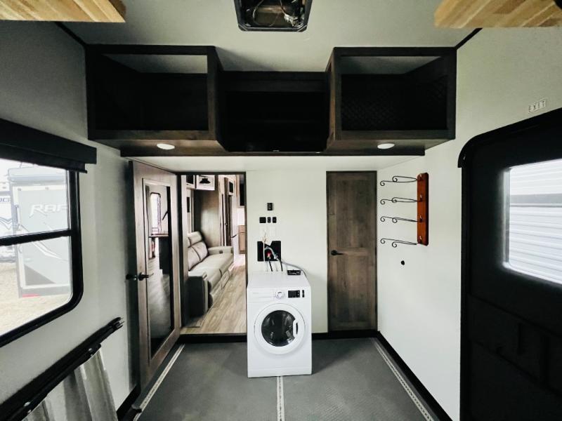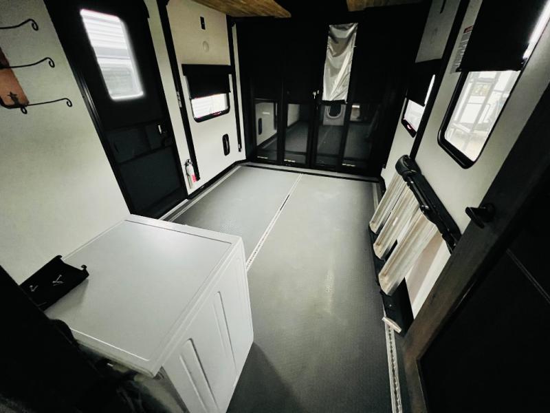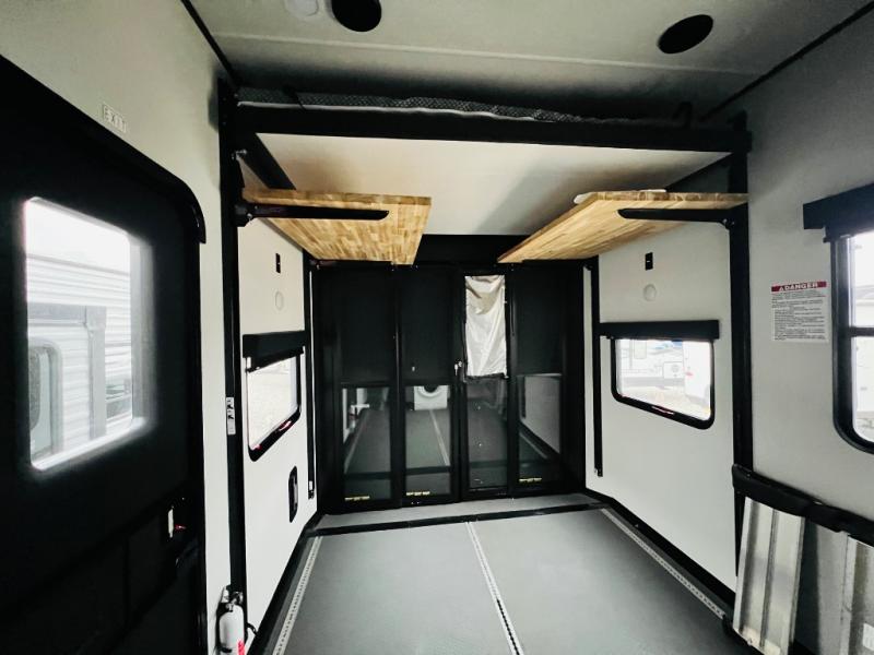 The whole gang will love camping in this toy hauler! There is 13' of garage space to store your off-road toys and once you have arrived at your destination you can set up the HappiJac roll-over sofas with a queen bed above them and the loft which opens to the living area. With two full bathrooms, everyone will stay squeaky clean. The chef can prepare their best meals with the kitchen island, three burner cooktop, and 17 cu. ft. stainless steel refrigerator while others play games at the table and chairs or relax by the fireplace on the sofa. The front private bedroom has a king bed slide for more walking around space, a flip top dresser, and a front wardrobe that is prepped to add an optional washer and dryer, plus it has an entrance into the dual entry bathroom!
