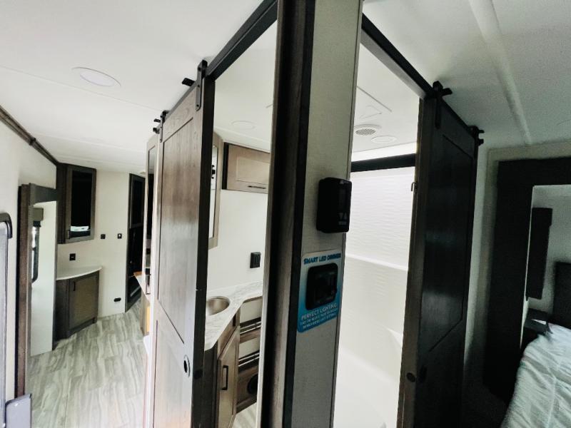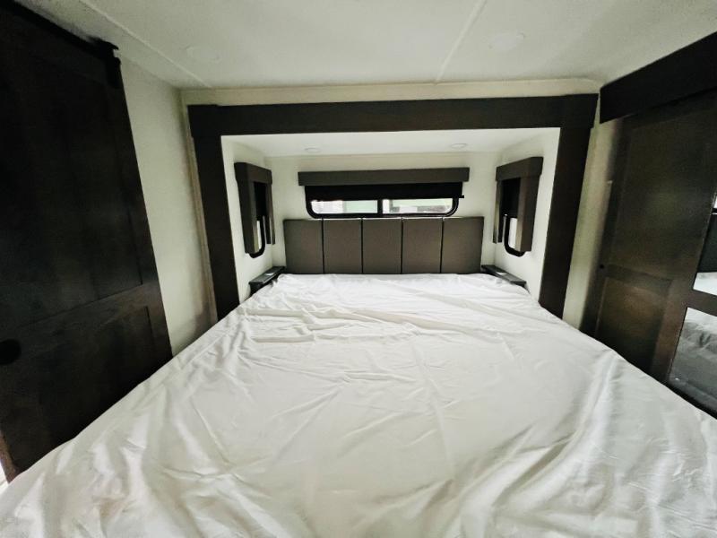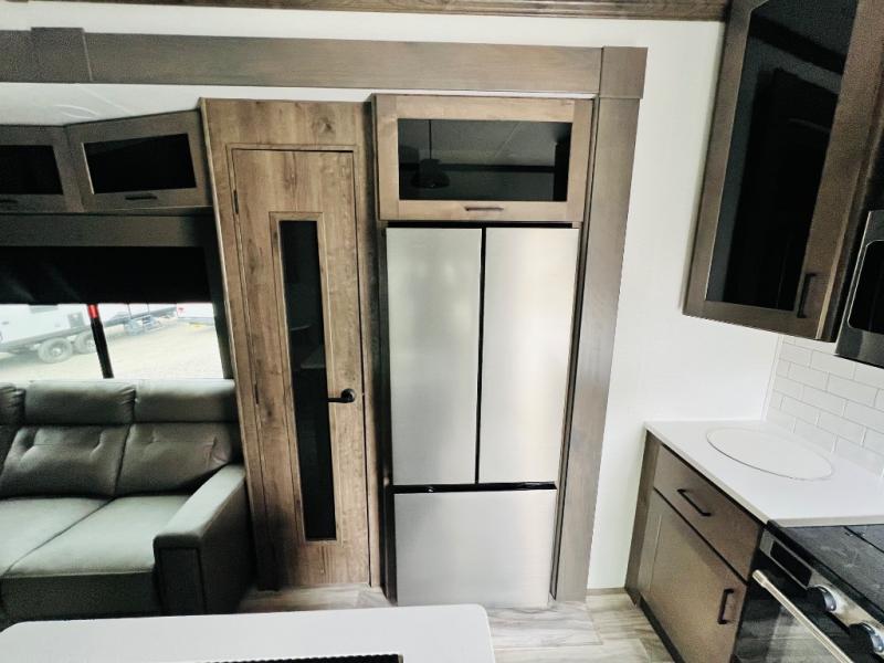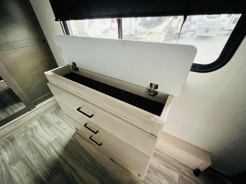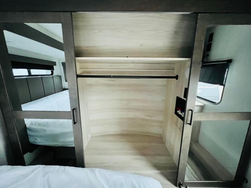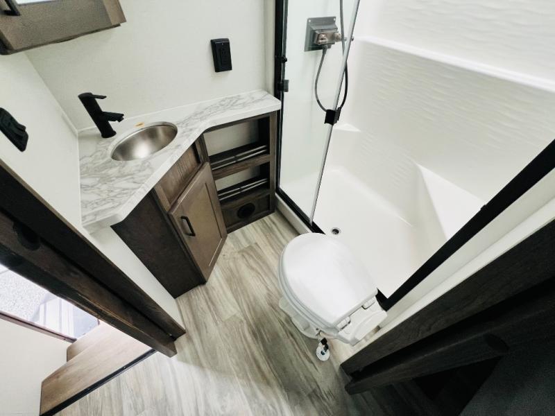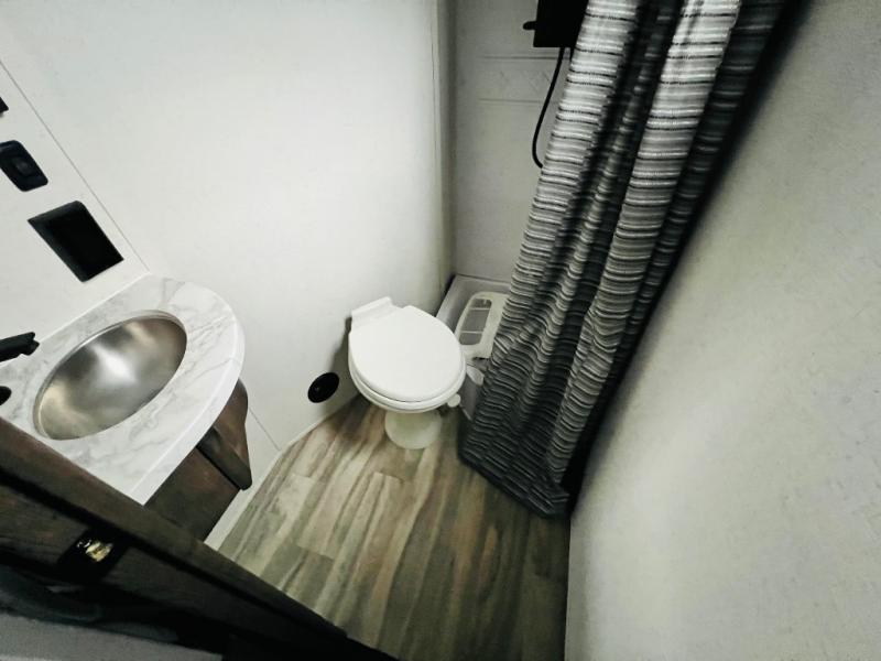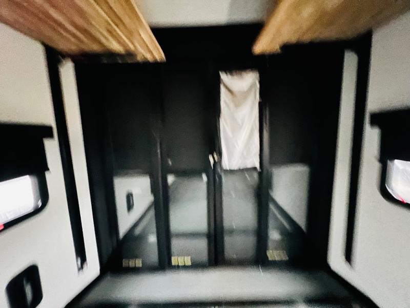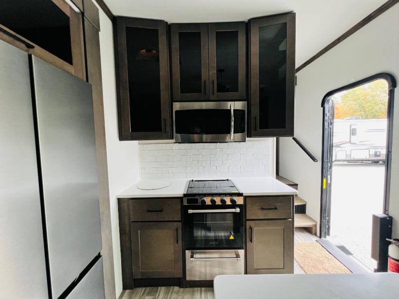 The whole gang will love camping in this toy hauler! There is 13' of garage space to store your off-road toys and once you have arrived at your destination you can set up the HappiJac roll-over sofas with a queen bed above them and the loft which opens to the living area. With two full bathrooms, everyone will stay squeaky clean. The chef can prepare their best meals with the kitchen island, three burner cooktop, and 17 cu. ft. stainless steel refrigerator while others play games at the table and chairs or relax by the fireplace on the sofa. The front private bedroom has a king bed slide for more walking around space, a flip top dresser, and a front wardrobe that is prepped to add an optional washer and dryer, plus it has an entrance into the dual entry bathroom!