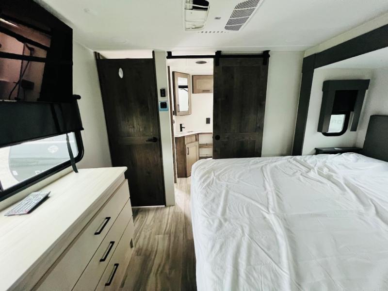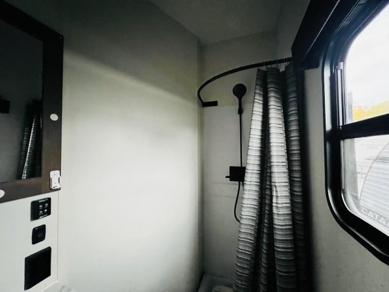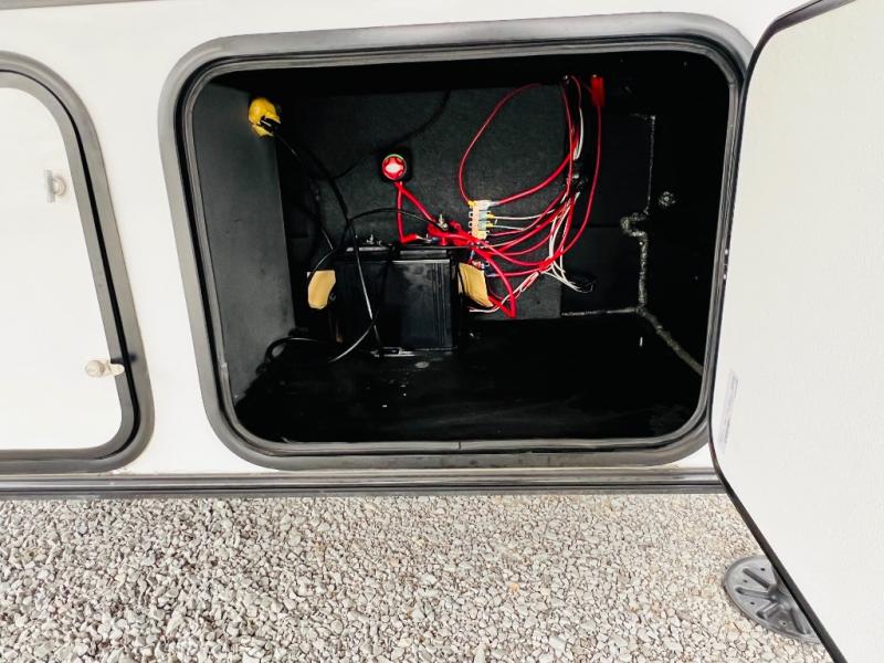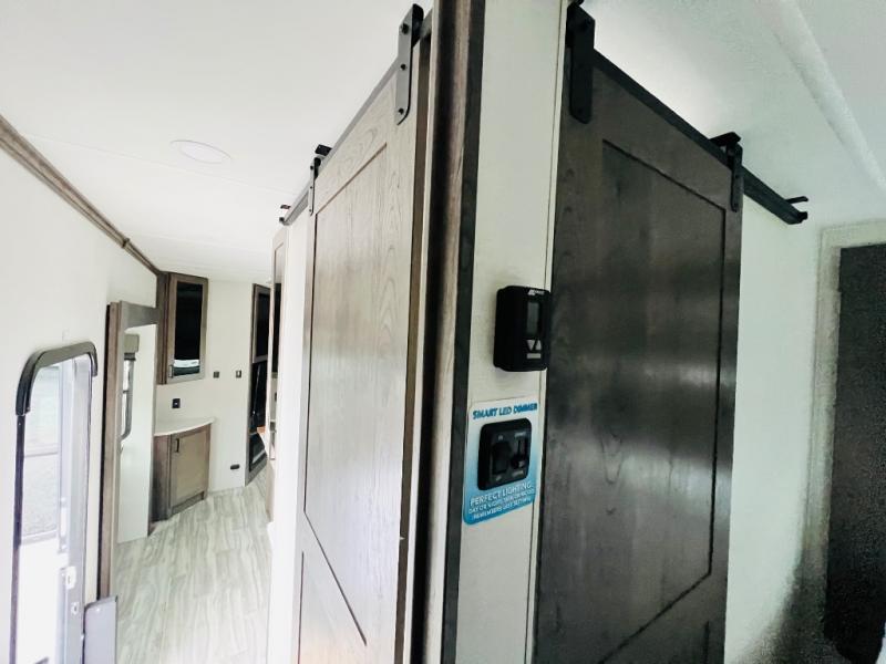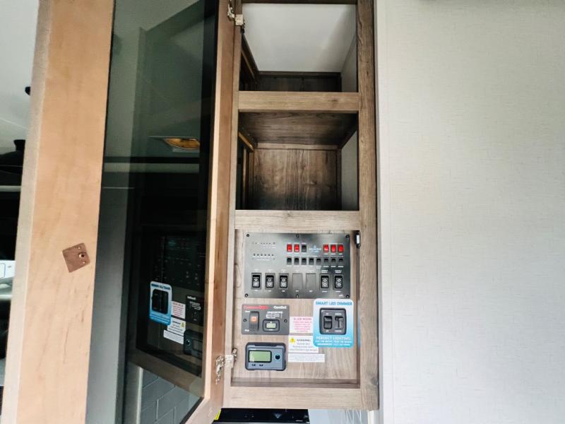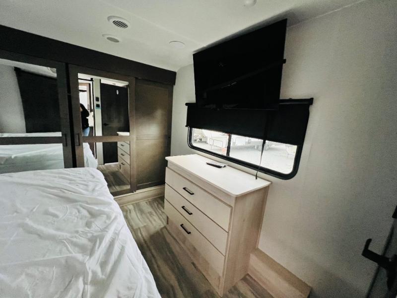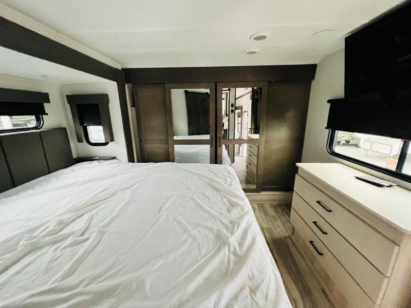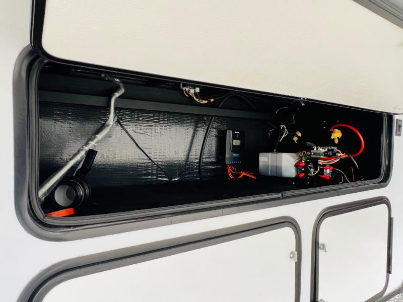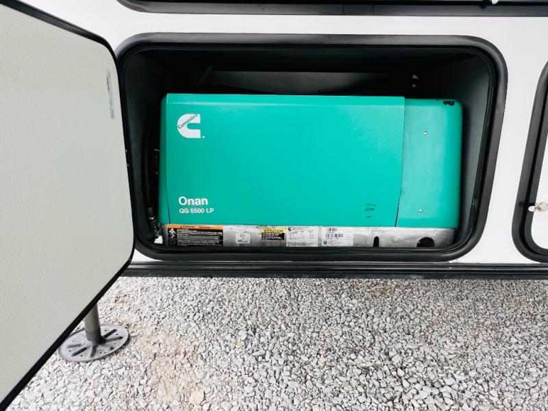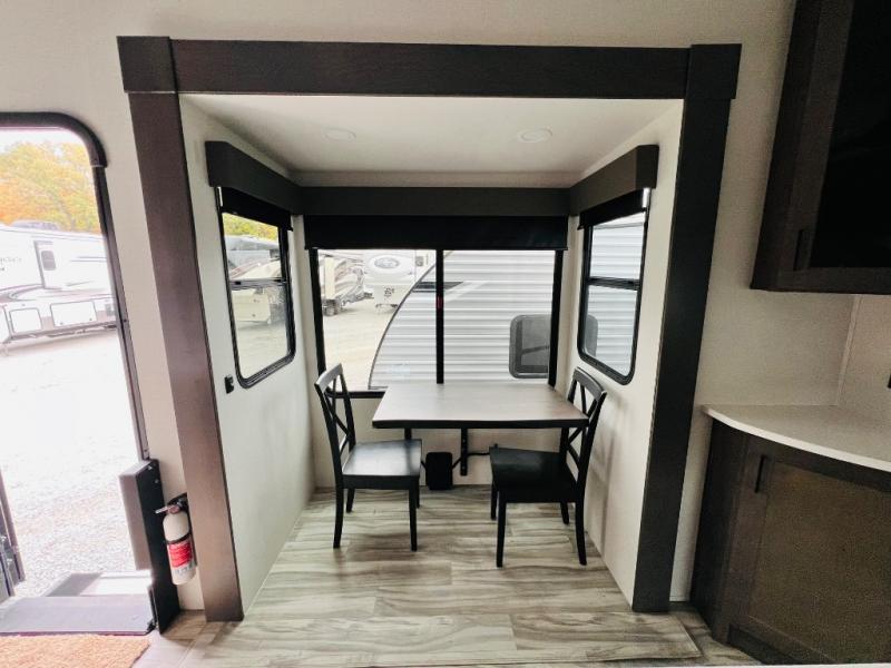 The whole gang will love camping in this toy hauler! There is 13' of garage space to store your off-road toys and once you have arrived at your destination you can set up the HappiJac roll-over sofas with a queen bed above them and the loft which opens to the living area. With two full bathrooms, everyone will stay squeaky clean. The chef can prepare their best meals with the kitchen island, three burner cooktop, and 17 cu. ft. stainless steel refrigerator while others play games at the table and chairs or relax by the fireplace on the sofa. The front private bedroom has a king bed slide for more walking around space, a flip top dresser, and a front wardrobe that is prepped to add an optional washer and dryer, plus it has an entrance into the dual entry bathroom!