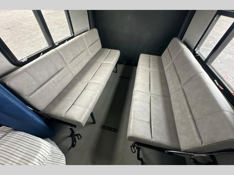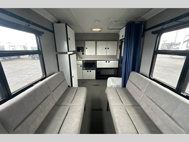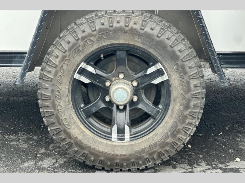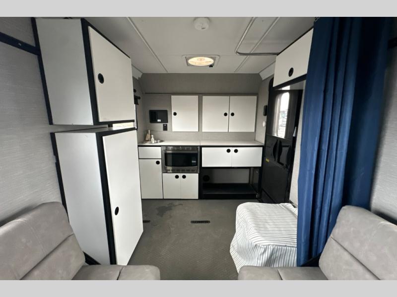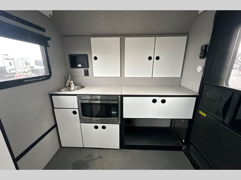 If you enjoy the simplicity of camping with your off-road toys, then you have come to the right place with this toy hauler! The 6' 6" interior height provides plenty of space to freely move about the inside. You can easily load and unload your toys with the 270 degree upper and lower modular track system, and store all of your outdoor gear in the side and front exterior storage access doors. The radius wall module with upper cabinets and lower provide space for your living essentials, and you can prepare your meals with the HDPE solid surface counters then clean up with the stainless steel sink that has a 12V water pump with 5 gallons of fresh and 5 gallons of grey water.