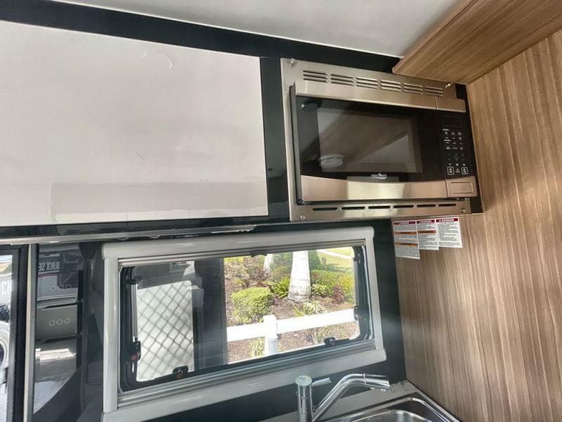 Get out there and explore with this Black Series Camper travel trailer! Because of the lounge dinette and double-size bed, this trailer can sleep three people, and the full bathroom in the back of this unit will allow everyone to wash up comfortably each morning. You will also be able to prepare a quick breakfast before heading out to the trails with the three-burner range and microwave in the kitchen.