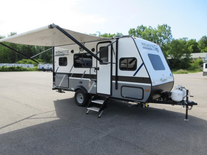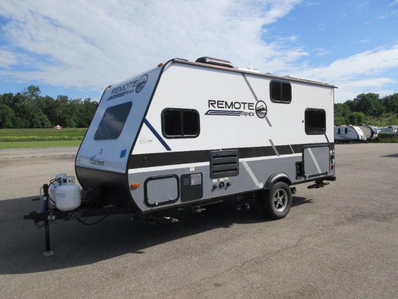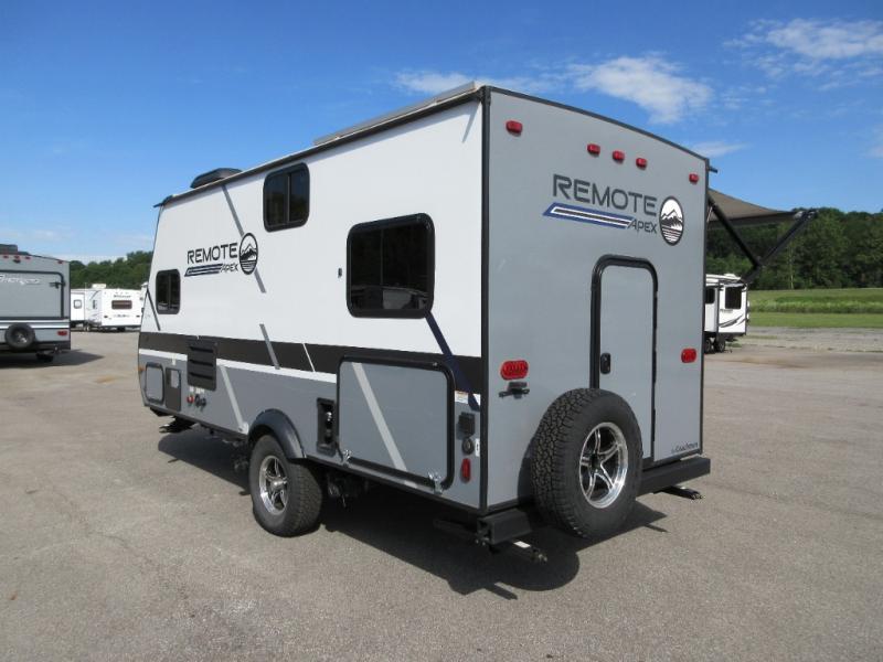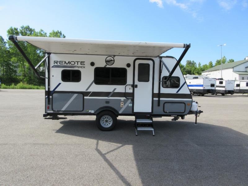 Leave the world behind you in the Apex Remote travel trailer by Coachmen RV. You will find the same comfort, convenience, and sturdy construction on this model just as you do with the Apex Nano models. There are vacuum-bonded Azdel fiberglass walls, an I-beam chassis, plus a powder coated frame that is corrosion resistant. This 7' wide travel trailer is easily towable and includes the Remote Wilderness Package with 15" all-terrain tires, a front bike rack, 12V heat pads, and much more. You will also enjoy an AM/FM stereo with Bluetooth, a hot and cold outside shower, four stabilizer jacks, plus many more amenities to make camping easier than ever!
