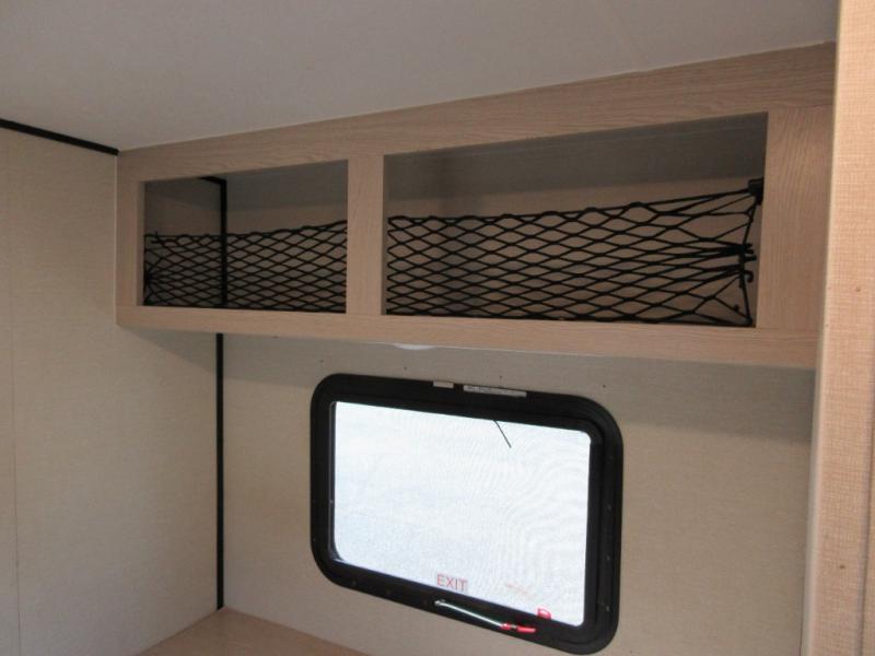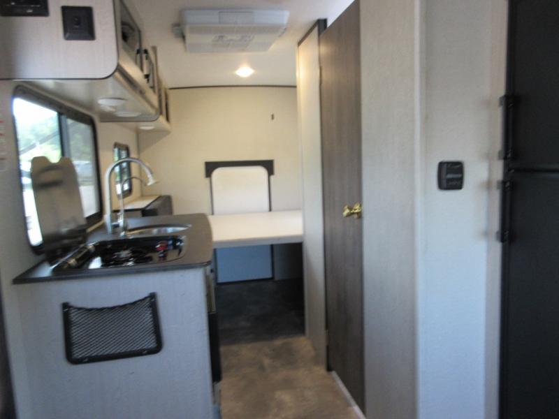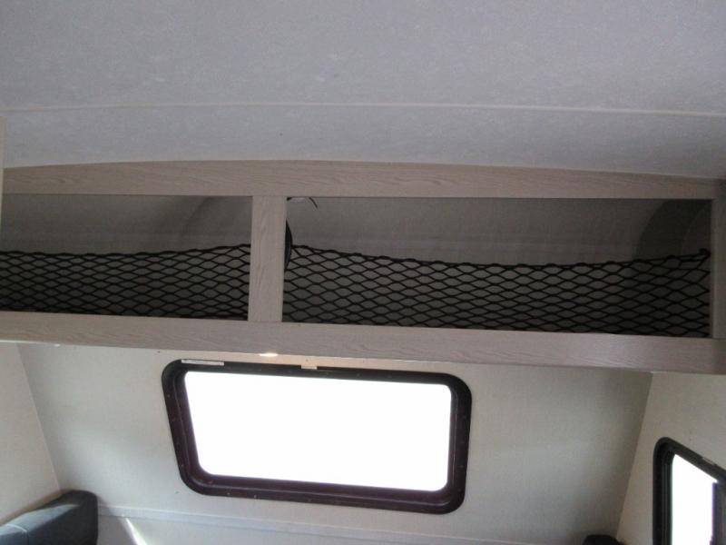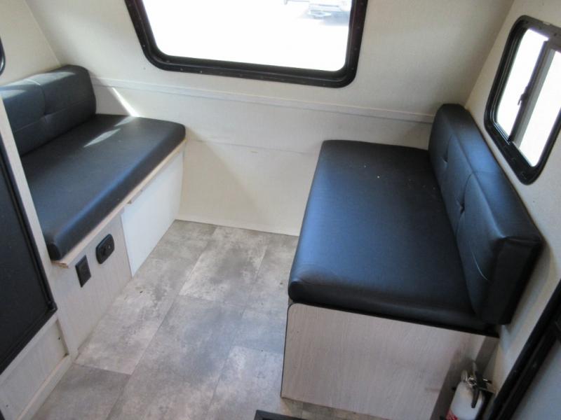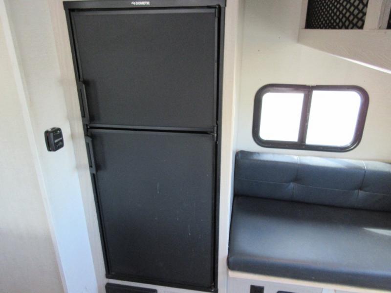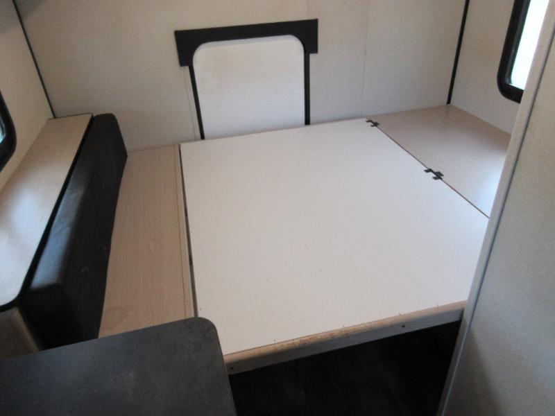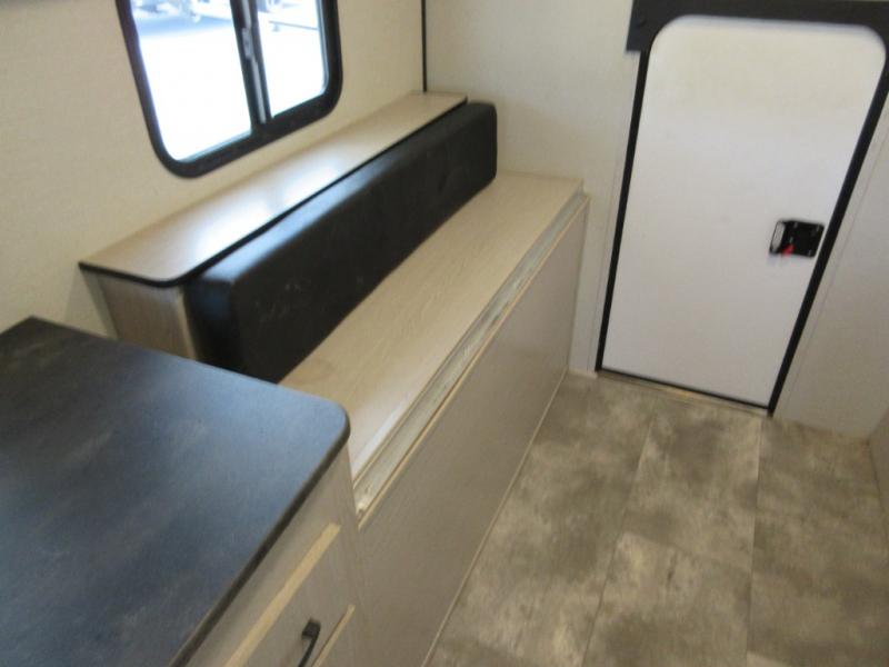 When you are ready to camp, this trailer is easy to load and tow to your favorite sites. The rear storage door allows you to carry items inside the trailer and you can leave the lifting section securely up or down depending on the space you need. There is more storage along the exterior, and you will find overhead cabinets inside, linen space in the full bathroom and your cold food can be placed in the 6 cu. ft. refrigerator. The cook will have a two burner cooktop plus a microwave inside, and a camp kitchen outside to keep everyone fed. Plus you can dine at the booth dinette which also provides sleeping space.