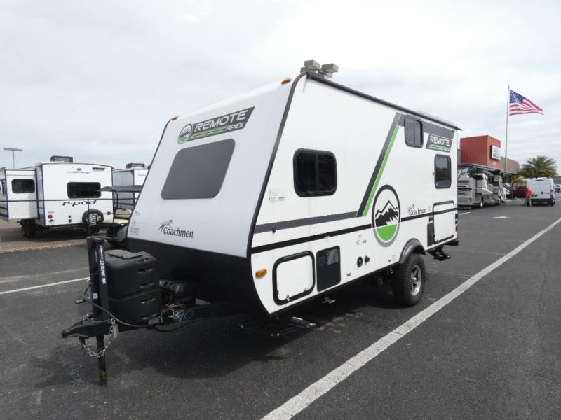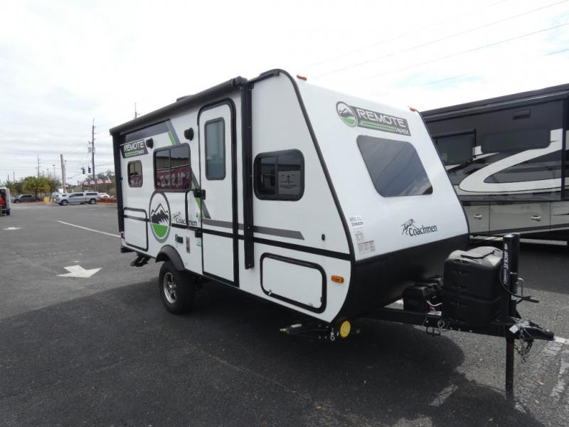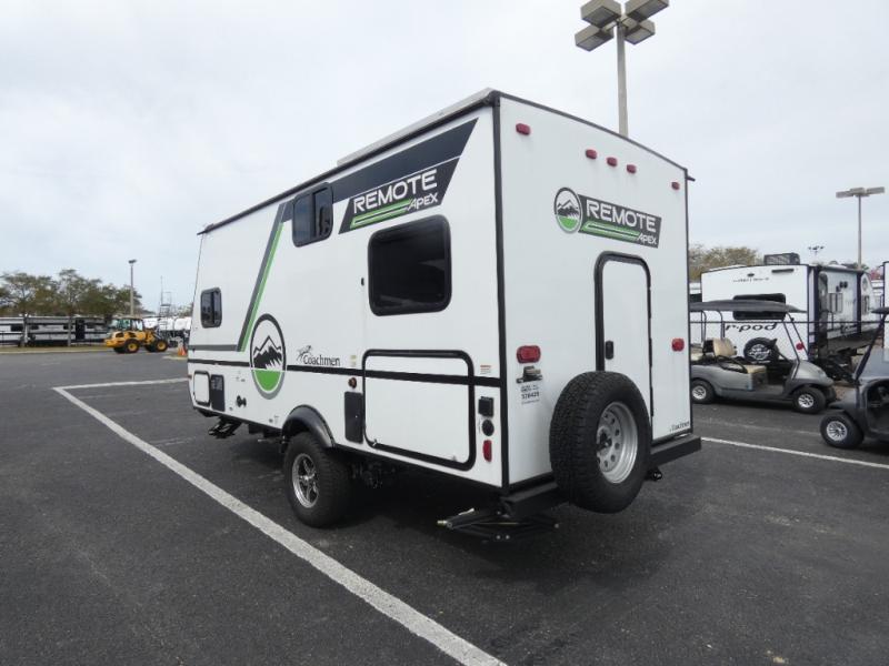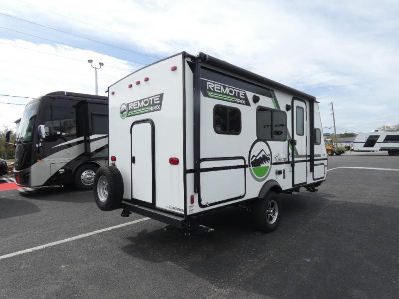 Leave the world behind you in the Apex Remote travel trailer by Coachmen RV. You will find the same comfort, convenience, and sturdy construction on this model just as you do with the Apex Nano models. There are vacuum-bonded Azdel fiberglass walls, an I-beam chassis, plus a powder coated frame that is corrosion resistant. This 7' wide travel trailer is easily towable and includes the Remote Wilderness Package with 15" all-terrain tires, a front bike rack, 12V heat pads, and much more. You will also enjoy an AM/FM stereo with Bluetooth, a hot and cold outside shower, four stabilizer jacks, plus many more amenities to make camping easier than ever!