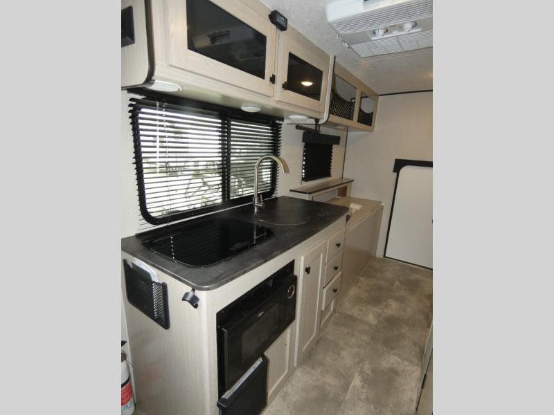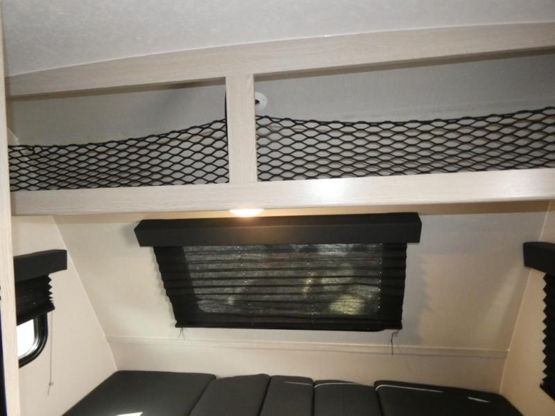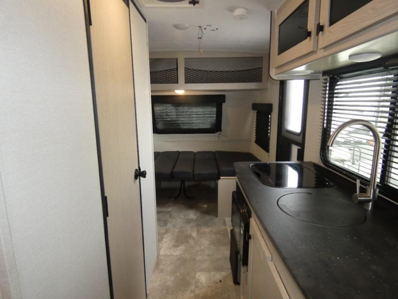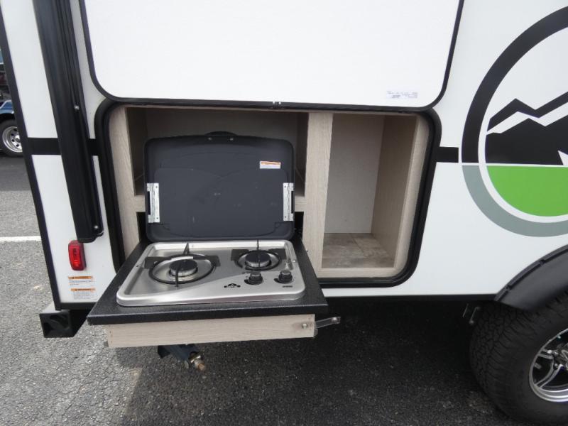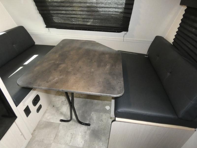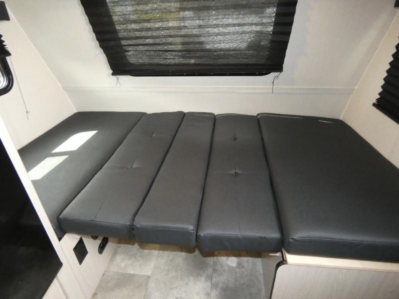 When you are ready to camp, this trailer is easy to load and tow to your favorite sites. The rear storage door allows you to carry items inside the trailer and you can leave the lifting section securely up or down depending on the space you need. There is more storage along the exterior, and you will find overhead cabinets inside, linen space in the full bathroom and your cold food can be placed in the 6 cu. ft. refrigerator. The cook will have a two burner cooktop plus a microwave inside, and a camp kitchen outside to keep everyone fed. Plus you can dine at the booth dinette which also provides sleeping space.