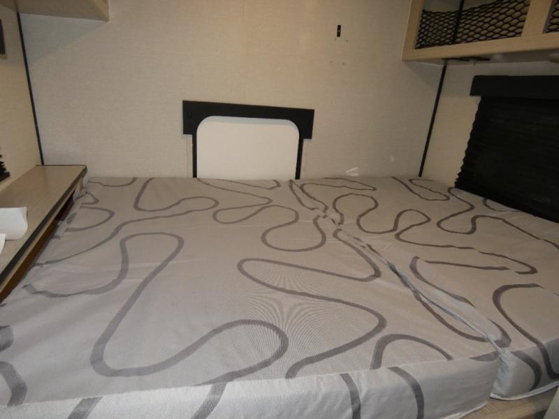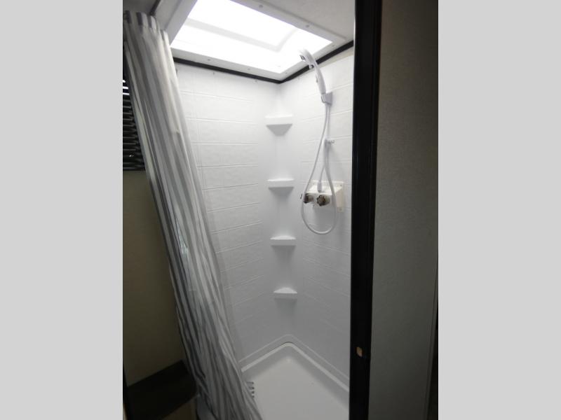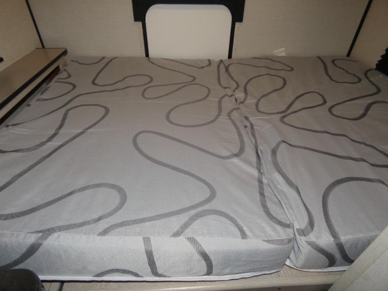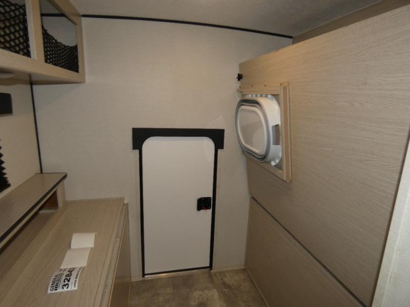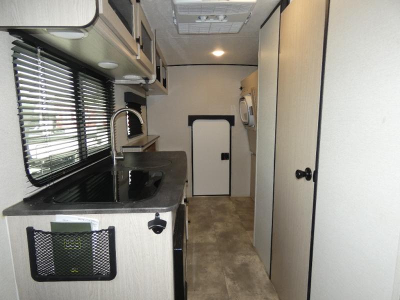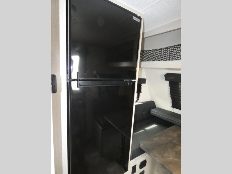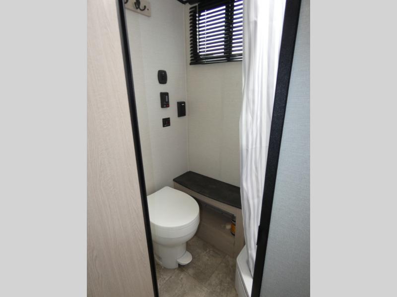 When you are ready to camp, this trailer is easy to load and tow to your favorite sites. The rear storage door allows you to carry items inside the trailer and you can leave the lifting section securely up or down depending on the space you need. There is more storage along the exterior, and you will find overhead cabinets inside, linen space in the full bathroom and your cold food can be placed in the 6 cu. ft. refrigerator. The cook will have a two burner cooktop plus a microwave inside, and a camp kitchen outside to keep everyone fed. Plus you can dine at the booth dinette which also provides sleeping space.