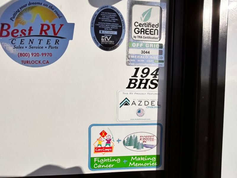 You will have more interior space with a booth dinette slide in this travel trailer! The chef will love cooking indoors with the two burner cooktop, microwave, and 6 cu. ft. gas/electric refrigerator, as well as outdoors with the exterior camp kitchen. Start each morning feeling clean and refreshed after sleeping on the front queen bed with a headboard and showering in the tub/shower inside the rear corner bathroom, plus the bathroom has a wardrobe to keep your towels close. The kids will love sleeping on the rear corner set of 30" x 74" bunk beds too!