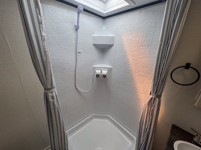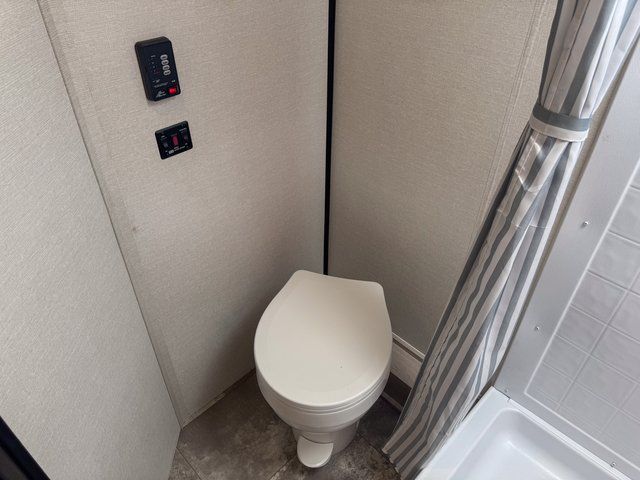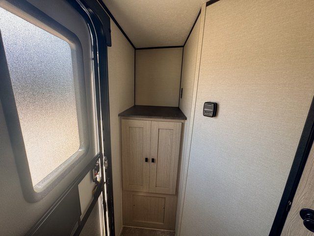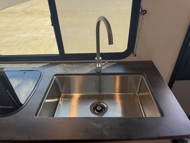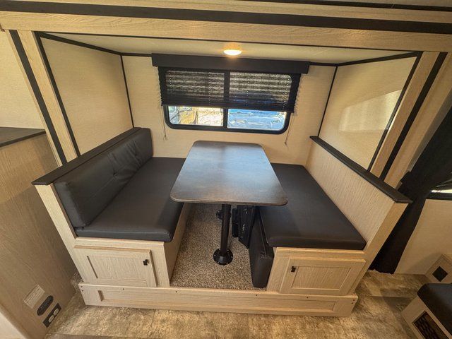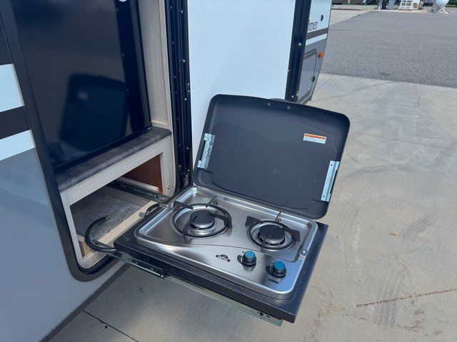 This Nano travel trailer features a Murphy bed for smart utilization of the interior space. During the day, enjoy the sofa, then at night fold down the 60" x 80" queen bed and sleep in comfort. Dual wardrobes provide plenty of storage space for your clothing. The kitchen also has tons of storage with a pantry and a wardrobe next to the entry. That's also where you'll find the wine fridge! A rear corner bath with angled shower also adds to the roomy feel. As for meals, you can use the fully equipped kitchen and eat at the dinette booth, or head outside and use the camp kitchen with a mini refrigerator and cooktop.