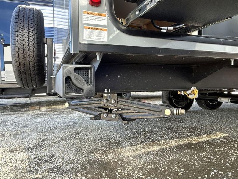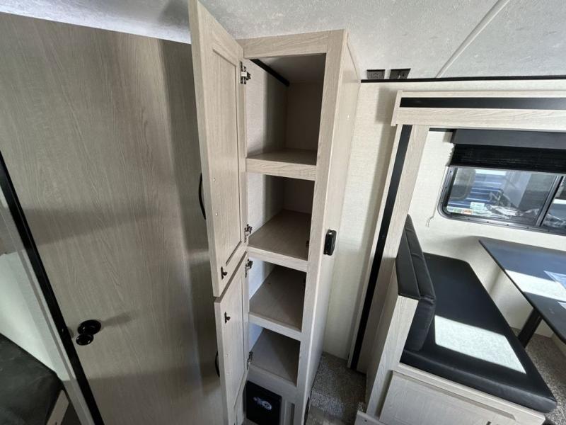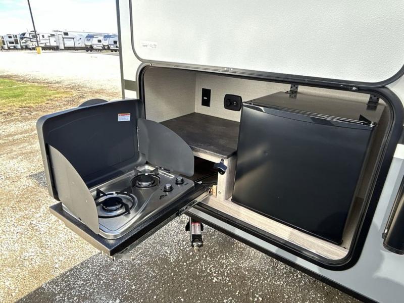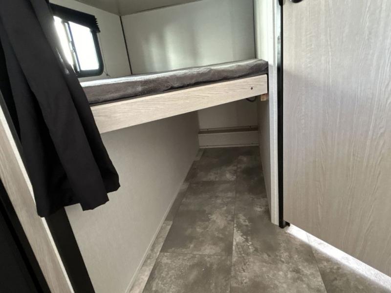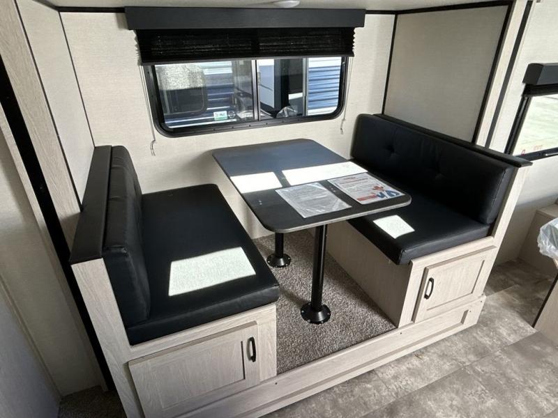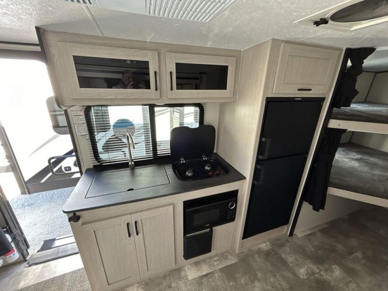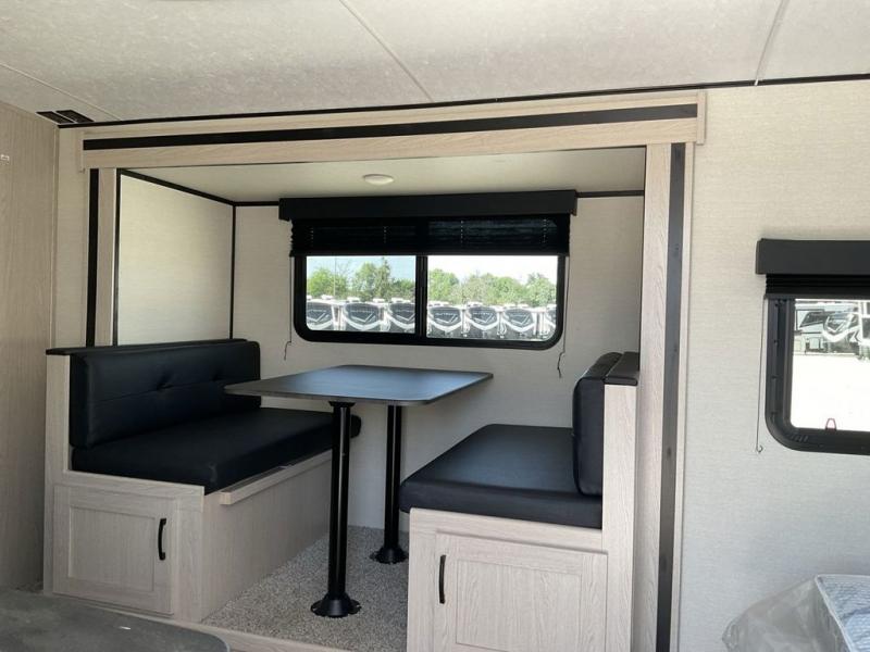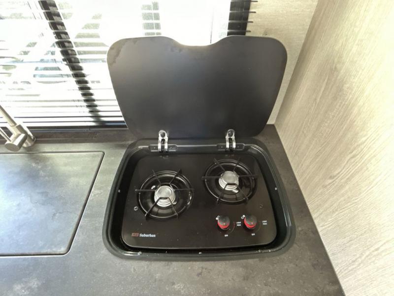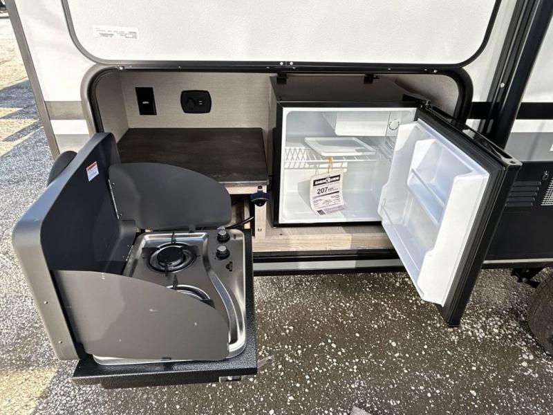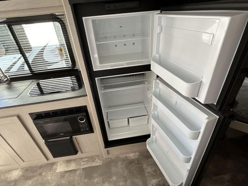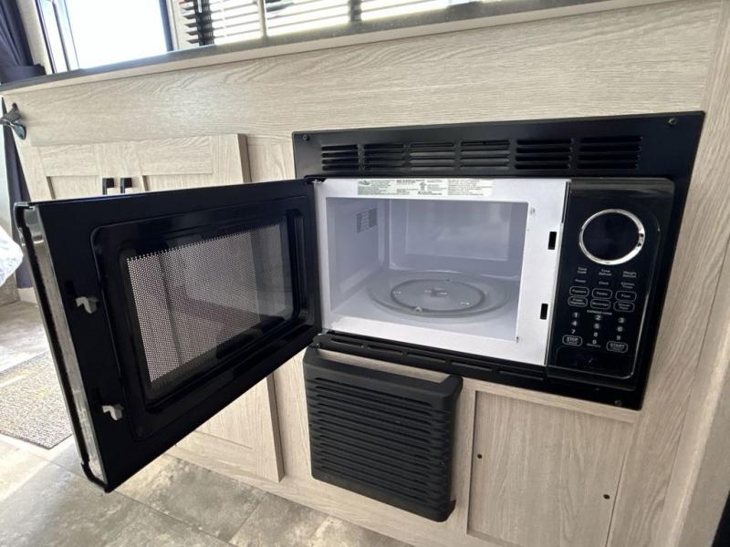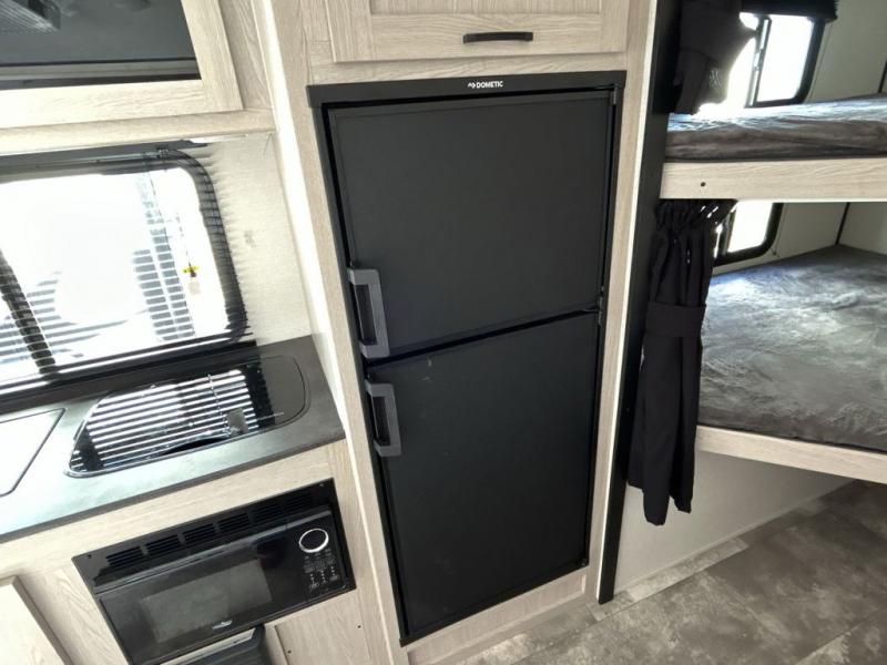 You and a few friends or family members can camp comfortably in this travel trailer! It features a front queen bed with wardrobes on either side to keep your clothes out of the way or you can switch it out for the optional Murphy bed for more versatility. Two others can sleep on the rear corner upper double bed and lower flip up double bed. After you have fried up some eggs on the two burner cooktop and heated up a piece of banana bread in the microwave, you can head to the booth dinette slide to enjoy it. There is even a pantry to store your coffee grounds and snacks. Now that your bellies are full, you can freshen up in the rear corner bathroom with the tub/shower.