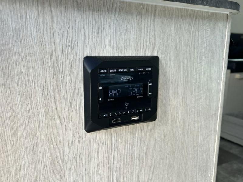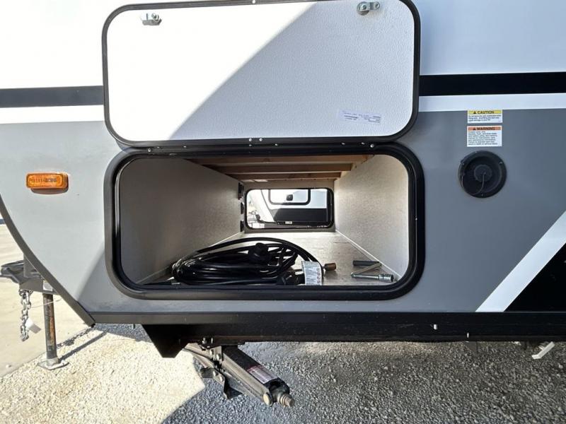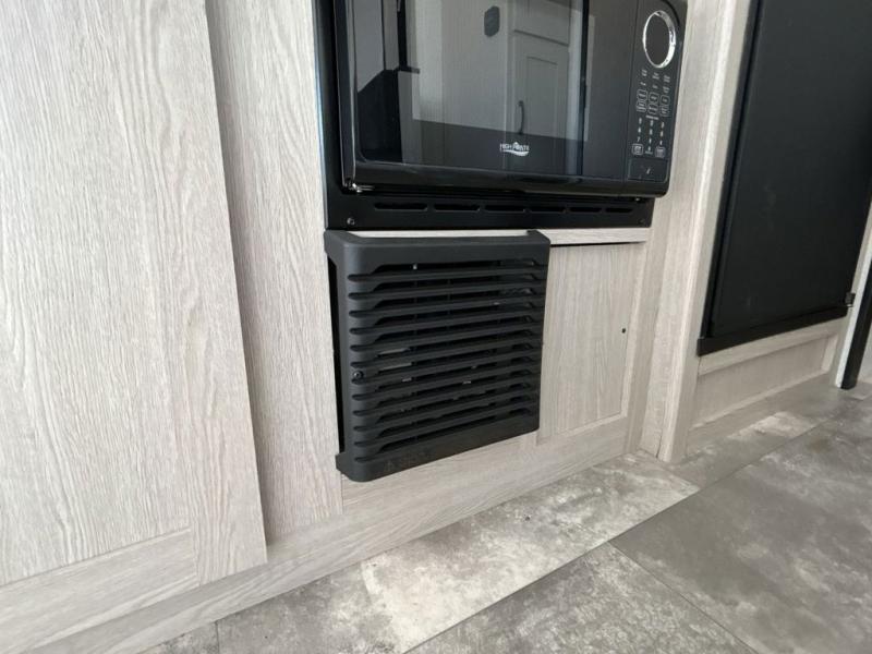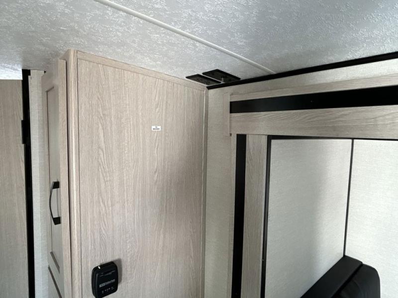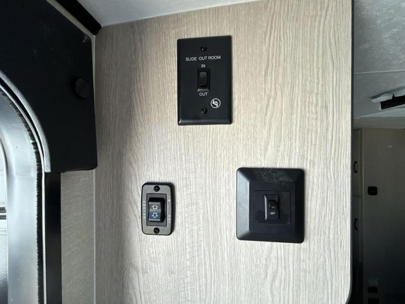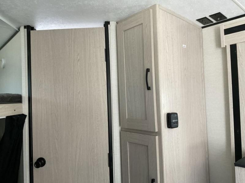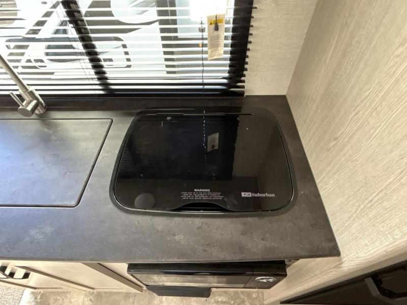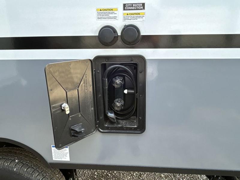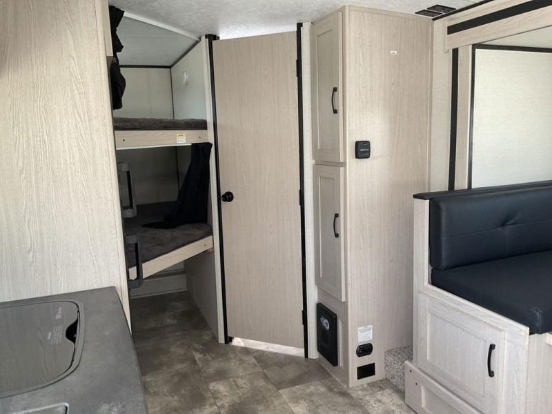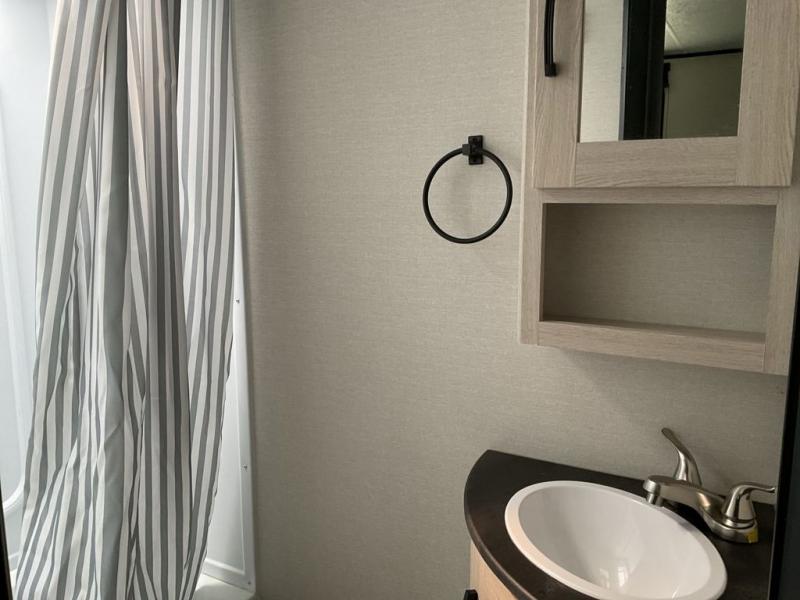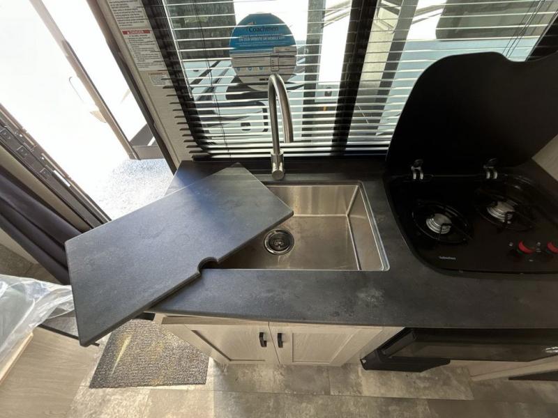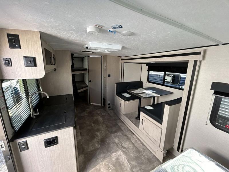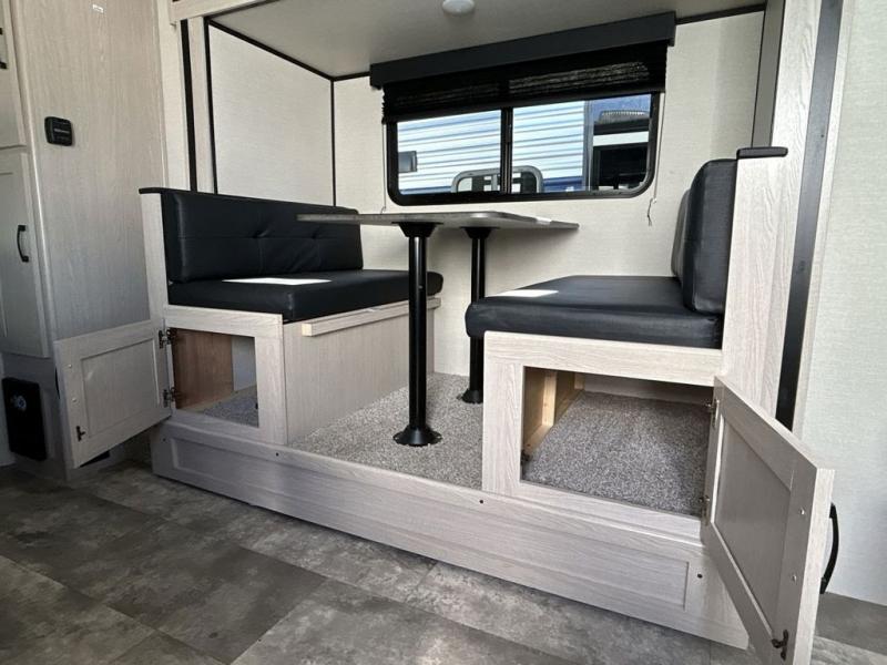 You and a few friends or family members can camp comfortably in this travel trailer! It features a front queen bed with wardrobes on either side to keep your clothes out of the way or you can switch it out for the optional Murphy bed for more versatility. Two others can sleep on the rear corner upper double bed and lower flip up double bed. After you have fried up some eggs on the two burner cooktop and heated up a piece of banana bread in the microwave, you can head to the booth dinette slide to enjoy it. There is even a pantry to store your coffee grounds and snacks. Now that your bellies are full, you can freshen up in the rear corner bathroom with the tub/shower.