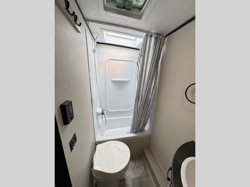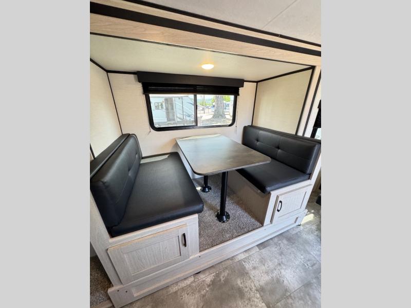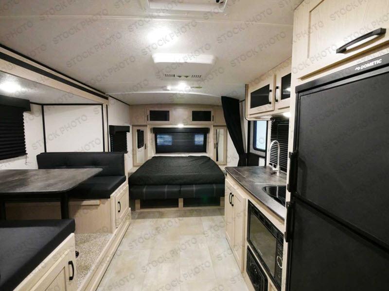 You and a few friends or family members can camp comfortably in this travel trailer! It features a front queen bed with wardrobes on either side to keep your clothes out of the way or you can switch it out for the optional Murphy bed for more versatility. Two others can sleep on the rear corner upper double bed and lower flip up double bed. After you have fried up some eggs on the two burner cooktop and heated up a piece of banana bread in the microwave, you can head to the booth dinette slide to enjoy it. There is even a pantry to store your coffee grounds and snacks. Now that your bellies are full, you can freshen up in the rear corner bathroom with the tub/shower.