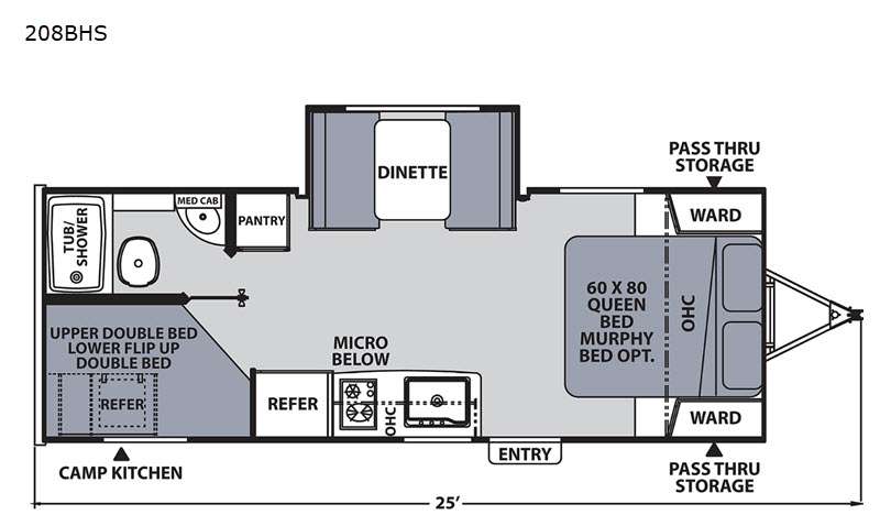 Start your mornings with a hot breakfast using the two burner cooktop or microwave, then gather around the dinette for meals, games, or planning your next adventure. With plenty of sleeping space for up to six campers, this model is perfect for families or friends who love the outdoors. The optional Murphy bed adds even more versatility to your living area.