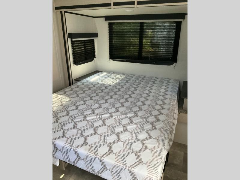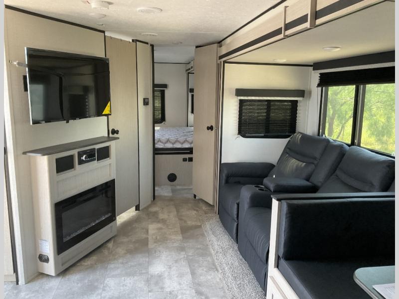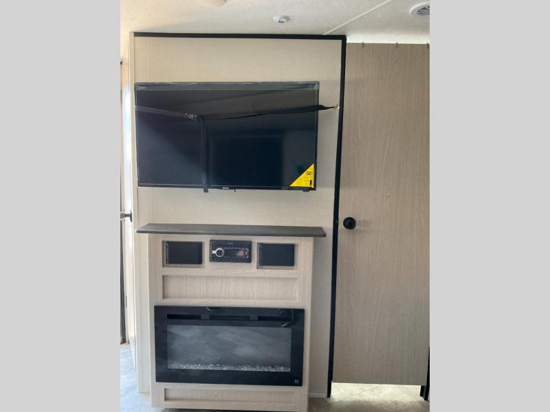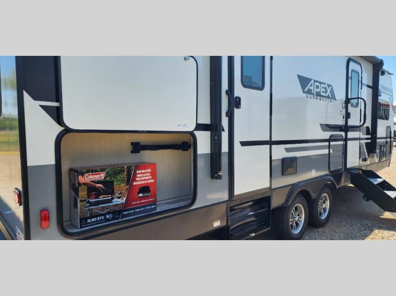 Enjoy each adventure camping in this Apex Ultra-Lite unit featuring dual entry doors. There is sleeping for up to six with the convertible dinette and sofa, plus a queen bed slide in the rear private bedroom that includes super storage beneath. This bedroom also features a large wardrobe near the private bedroom entry door. The front kitchen has everything you need to prepare hearty camp meals easily thanks to the large counter space for prepping. A booth dinette and sofa slide offer seating for everyone and all will easily be able to view the entertainment center with TV and cozy fireplace from either one. A large pantry is conveniently located just inside the main front most entry door where you can quickly grab a snack for outside, or load up groceries once you shop for your trip.
