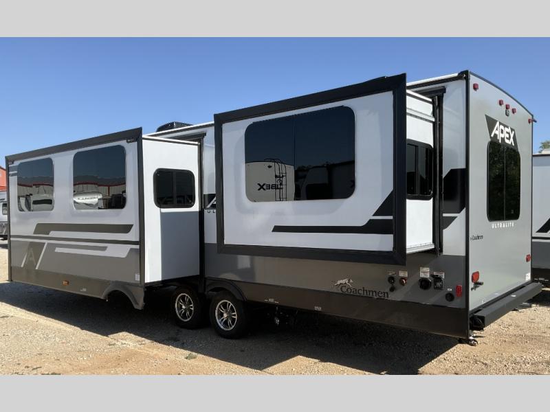Lightweight living and camping is found with the Apex Ultra-Lite travel trailers by Coachmen. These eco-friendly units are made to last thanks to the Azdel composite sidewalls, the laminated aluminum floor, and the vacuum-bonded laminated crowned roof. Lippert axles and nitrogen filled radial tires make towing easier than ever, plus there is a friction hinge entrance door, a 100-watt solar panel with a 10 Amp control charger, and slam latch baggage door catches for easy unloading. Some of the interior comforts you'll fall in love with are the one-piece seamless edge countertops, the hard valances with night shades throughout, the matte black hardware, and the residential comforter. The Apex Ultra-Lite trailers also include USB ports, a digital TV antenna with cable hook-ups and Wi-Fi capability, and an AM/FM stereo with Bluetooth to ensure you'll never be bored on rainy camp days!