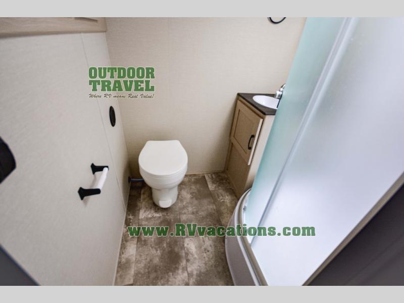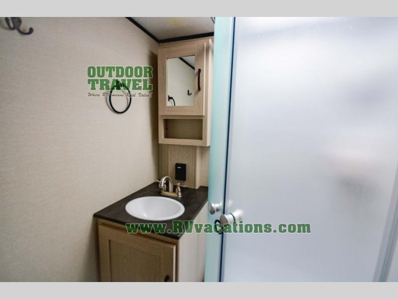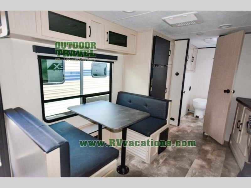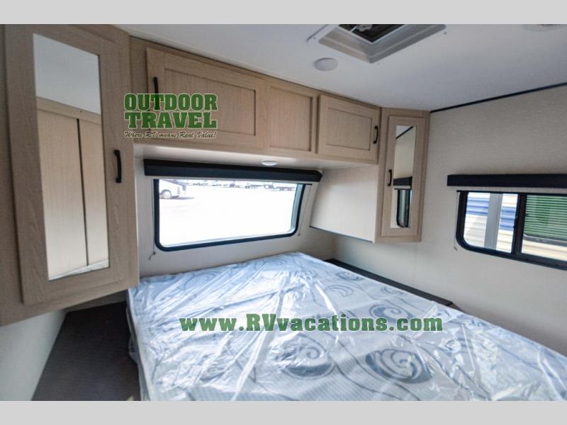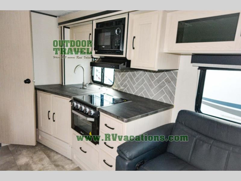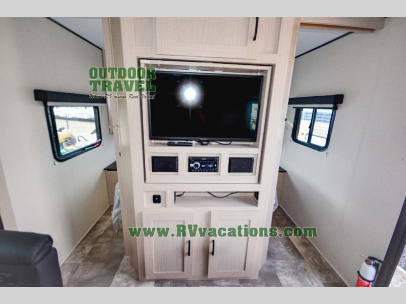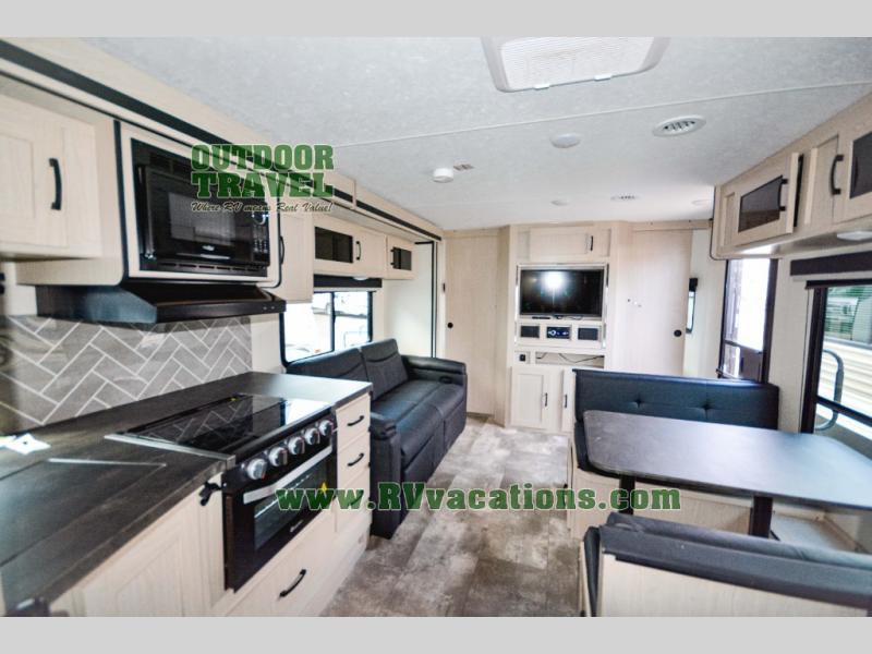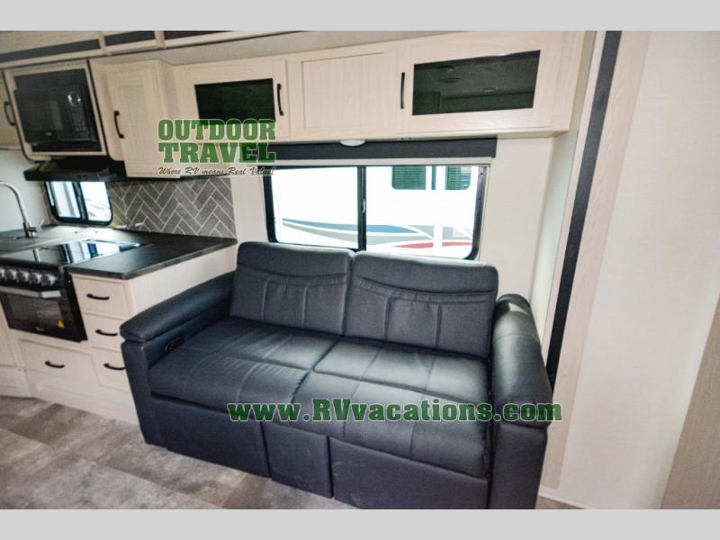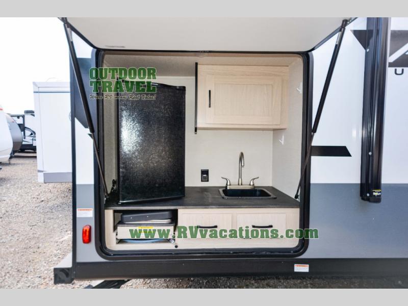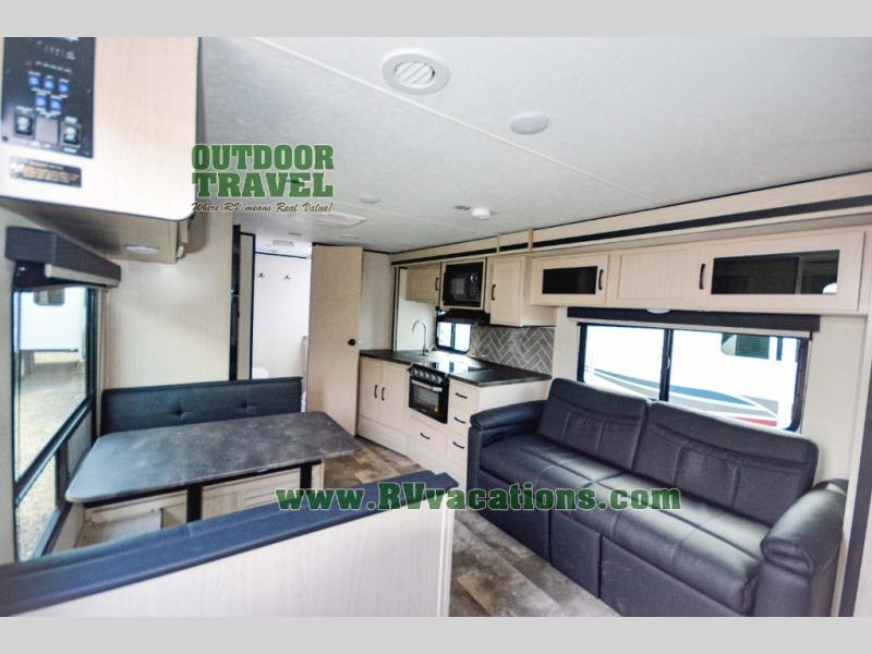 Escape the city life for relaxing weekend in this spacious travel trailer. A large slide out provides plenty of space to relax on the sofa or dine at the booth dinette. There is an entertainment center here with a 32" LED TV if you love to watch movies at night, and the full rear bath will allow you to stay clean throughout your trip. The chef can choose to cook indoors on the three burner cooktop, or head outdoors to cook on the outside kitchen! And when it's time to turn in for the night you'll have your own private bedroom up front with a queen bed and dual wardrobes, and any guests you have can sleep on the sofa and booth dinette!