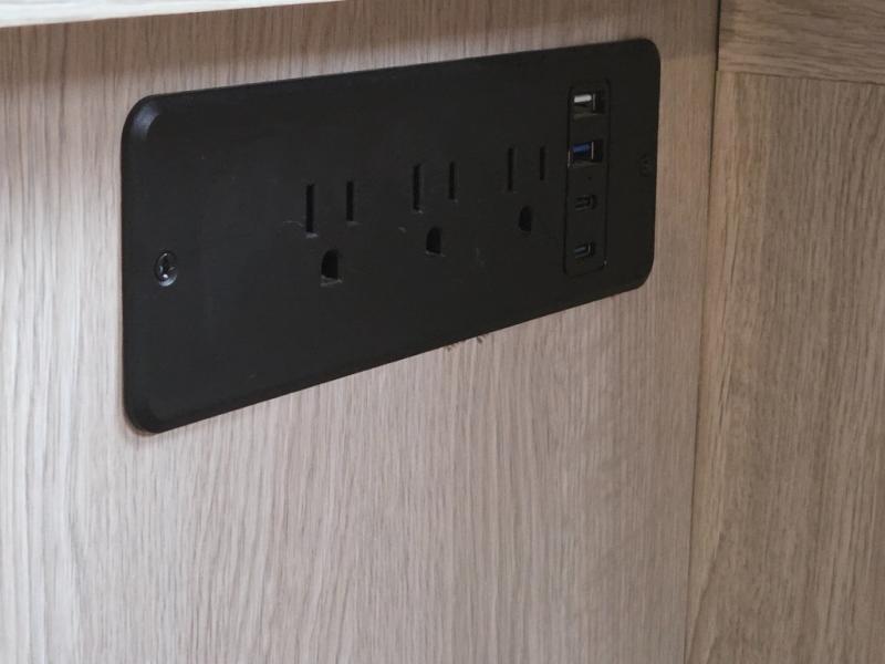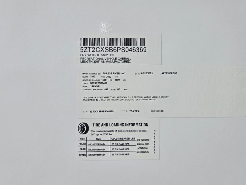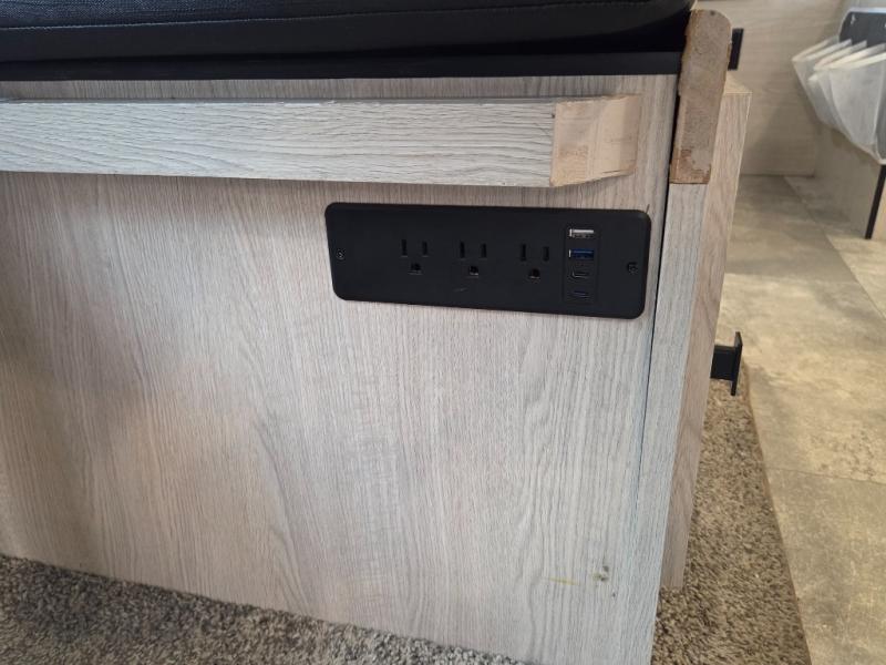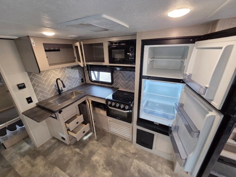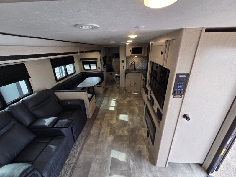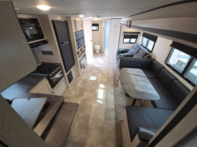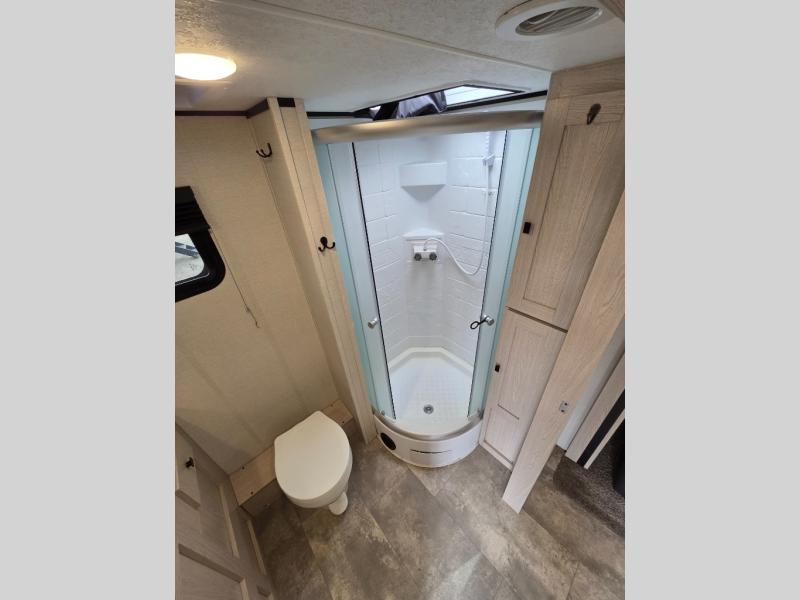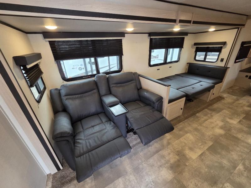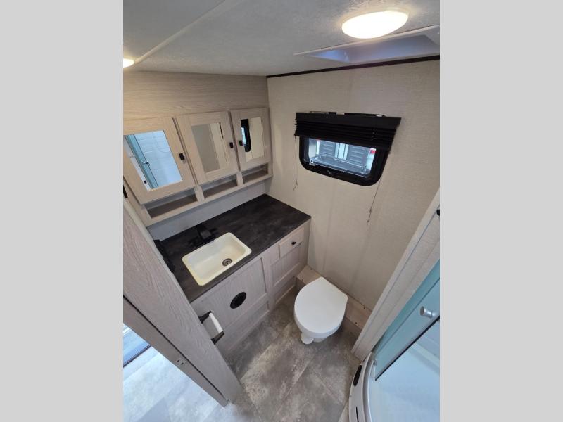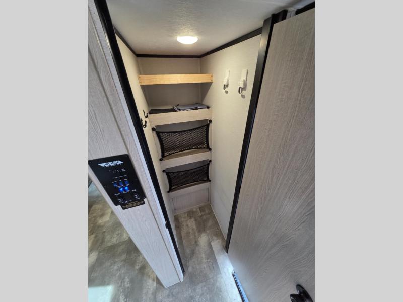 You won't be roughing it on camping trips with this spacious travel trailer. Once you arrive at the lake, make a quick lunch on the exterior camp kitchen, set up the 18' power awning, then grab the fishing poles from the pass-through storage! When you get back from fishing you can clean up in the full rear bath, then relax on the sofa or play a game around the U-shaped dinette. You will love the amount of storage space you have in this trailer with plenty of overhead cabinets, dual bedroom wardrobes, plus an entryway walk-in closet with shelves for jackets, food, and shoes!