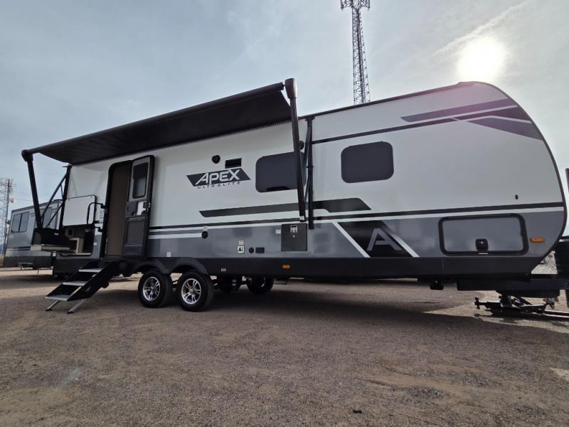 Lightweight living and camping is found with the Apex Ultra-Lite travel trailers by Coachmen. These eco-friendly units are made to last thanks to the Azdel composite sidewalls, the laminated aluminum floor, and the vacuum-bonded laminated crowned roof. Lippert axles and nitrogen filled radial tires make towing easier than ever, plus there is a friction hinge entrance door, a 100-watt solar panel with a 10 Amp control charger, and slam latch baggage door catches for easy unloading. Some of the interior comforts you'll fall in love with are the one-piece seamless edge countertops, the hard valances with night shades throughout, the matte black hardware, and the residential comforter. The Apex Ultra-Lite trailers also include USB ports, a digital TV antenna with cable hook-ups and Wi-Fi capability, and an AM/FM stereo with Bluetooth to ensure you'll never be bored on rainy camp days!