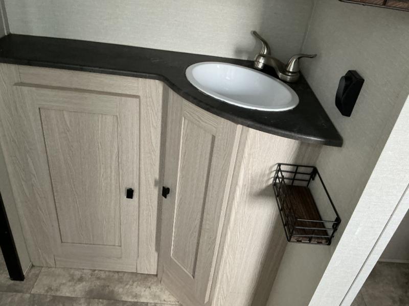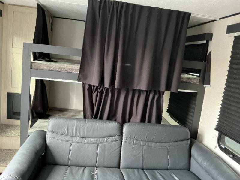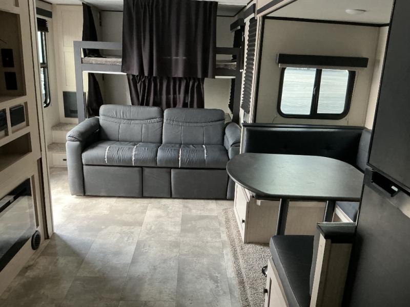 Camping with family or a larger group of friends is easier than ever in this dual entry trailer that can sleep nine people comfortably. The little ones will love the double-size bunks with storage steps, and you'll have the queen bed with super storage all to yourselves. There is also a U-shaped dinette slide and a sofa for even more sleeping space. If the weather is nice, you'll find yourselves outdoors under the 20' power awning and enjoying a snack from the exterior camp kitchen. This model also includes a 32" LED TV, and you'll find the pantry/storage behind the entertainment center for added convenience.