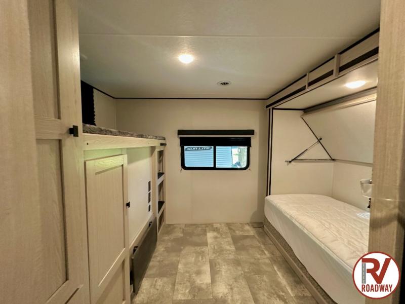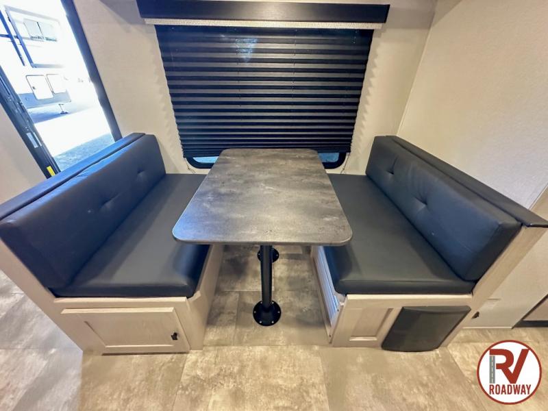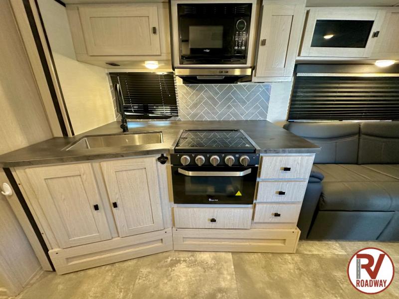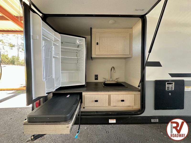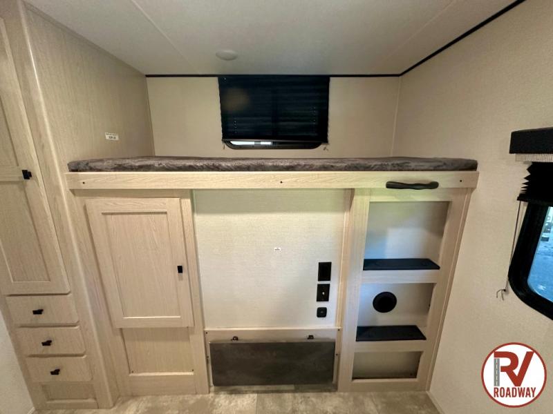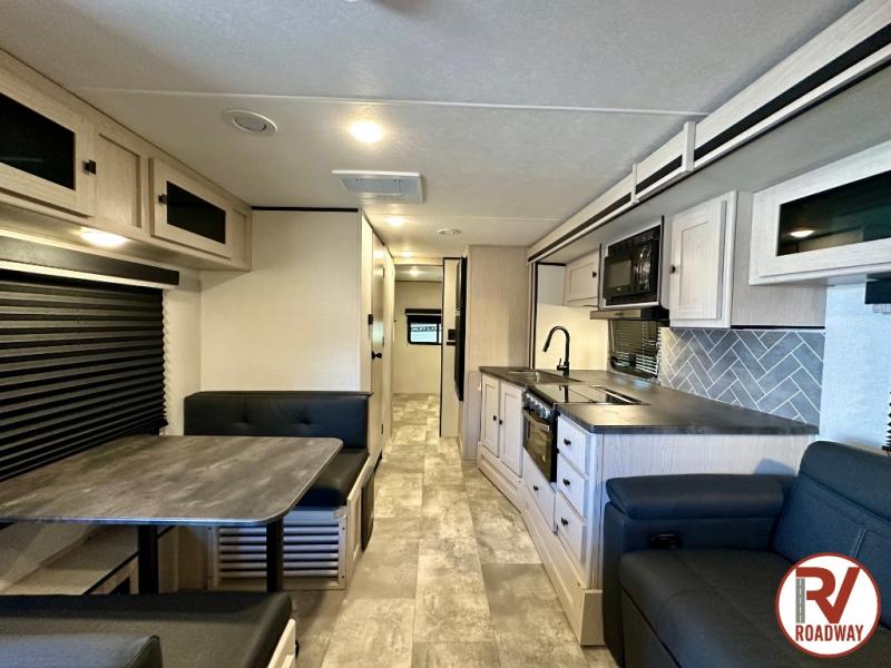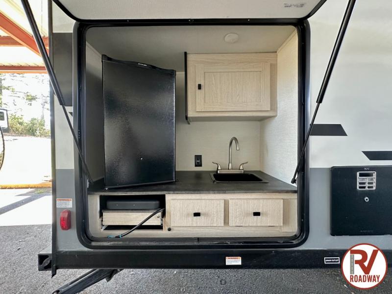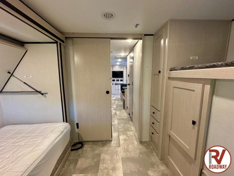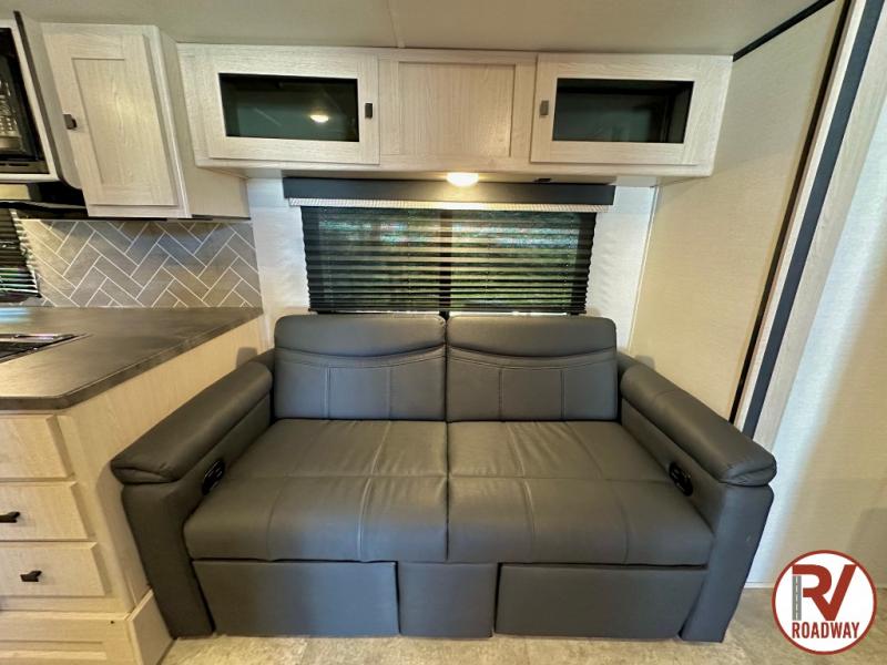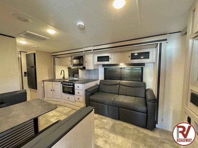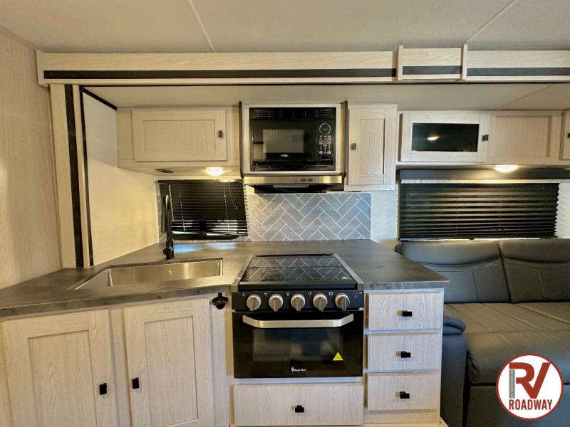 Double slides, a bunkhouse, plus a private bedroom and sleeping for nine make this model ready for anything! There is a private bunkhouse with a slide out futon and an overhead bunk, plus a second bunk with storage beneath for the kids to enjoy. Up front, a queen bed will provide two a comfortable night's rest in a private bedroom, and any other guests can sleep on the booth dinette and sofa in the main living area. The chef can cook indoors, or outdoors on the outside kitchen, and since there is an 18' power awning with LED lights, you can enjoy a bit of outdoor living space as well!