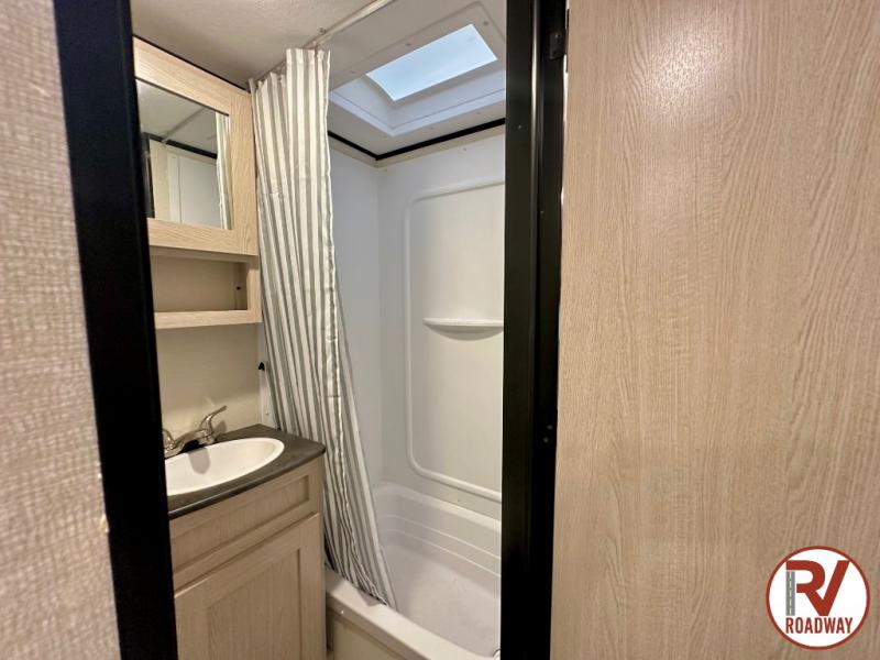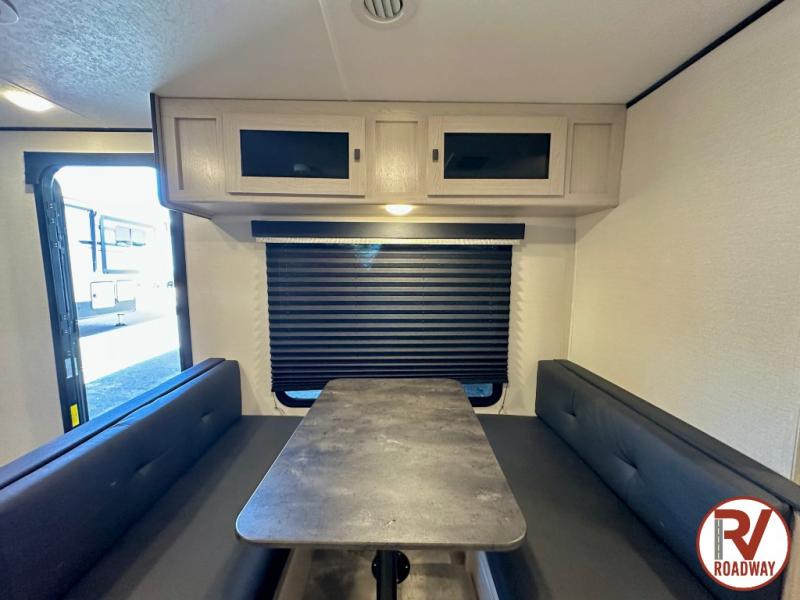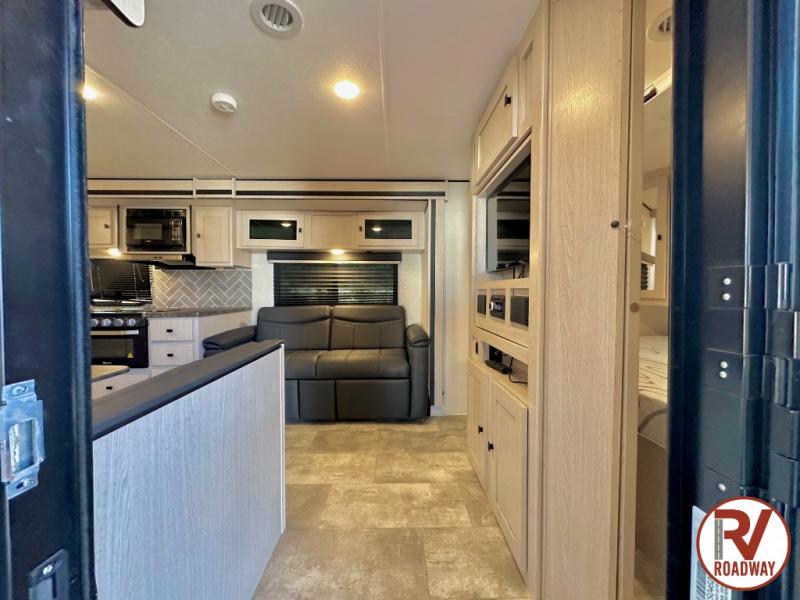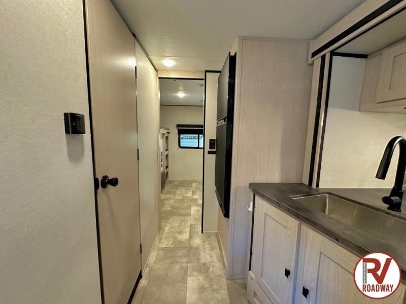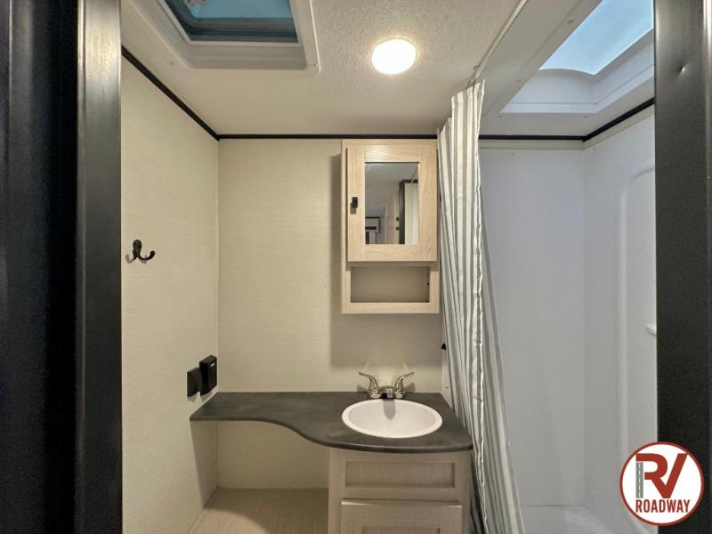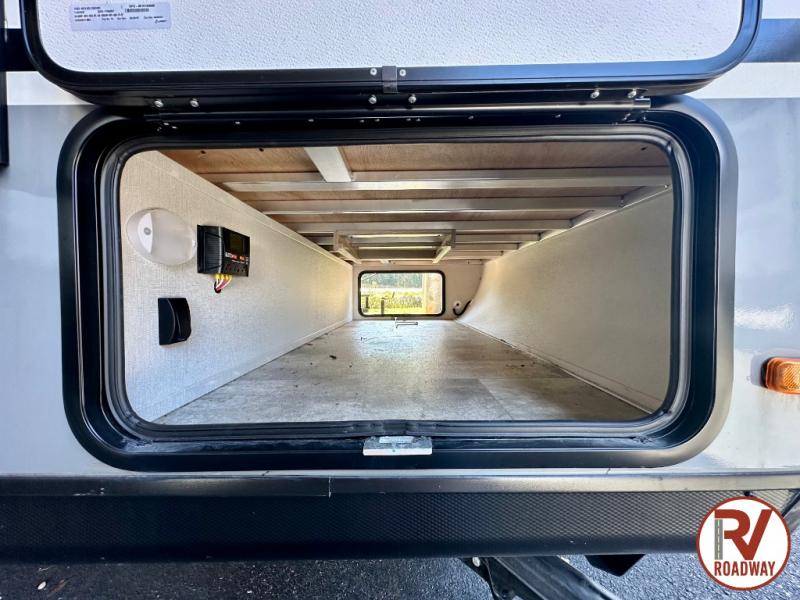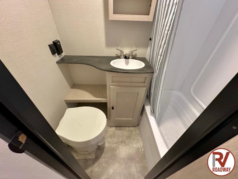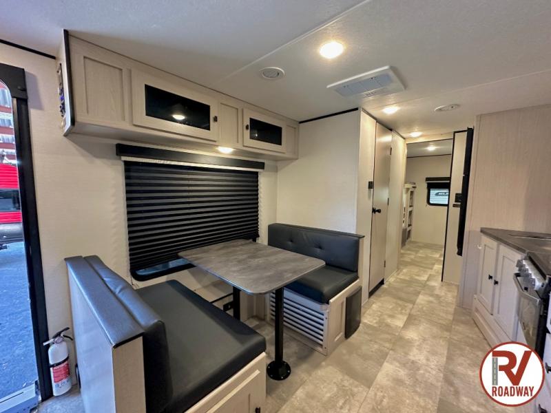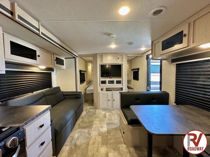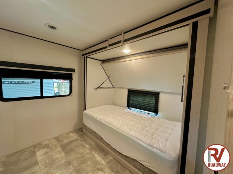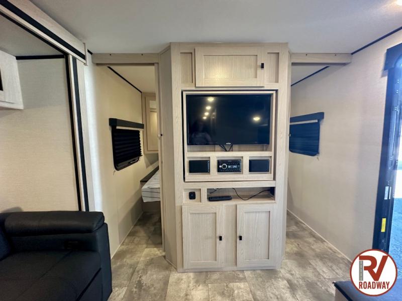 Double slides, a bunkhouse, plus a private bedroom and sleeping for nine make this model ready for anything! There is a private bunkhouse with a slide out futon and an overhead bunk, plus a second bunk with storage beneath for the kids to enjoy. Up front, a queen bed will provide two a comfortable night's rest in a private bedroom, and any other guests can sleep on the booth dinette and sofa in the main living area. The chef can cook indoors, or outdoors on the outside kitchen, and since there is an 18' power awning with LED lights, you can enjoy a bit of outdoor living space as well!