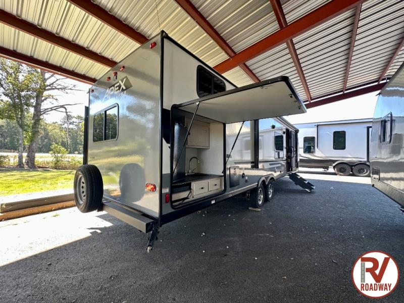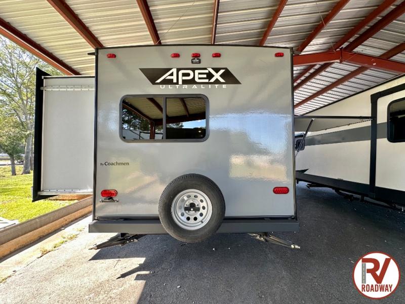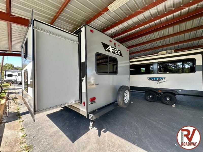 Lightweight living and camping is found with the Apex Ultra-Lite travel trailers by Coachmen. These eco-friendly units are made to last thanks to the Azdel composite sidewalls, the laminated aluminum floor, and the vacuum-bonded laminated crowned roof. Lippert axles and nitrogen filled radial tires make towing easier than ever, plus there is a friction hinge entrance door, a 100-watt solar panel with a 10 Amp control charger, and slam latch baggage door catches for easy unloading. Some of the interior comforts you'll fall in love with are the one-piece seamless edge countertops, the hard valances with night shades throughout, the matte black hardware, and the residential comforter. The Apex Ultra-Lite trailers also include USB ports, a digital TV antenna with cable hook-ups and Wi-Fi capability, and an AM/FM stereo with Bluetooth to ensure you'll never be bored on rainy camp days!