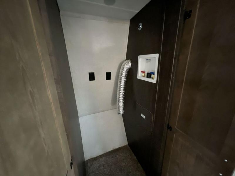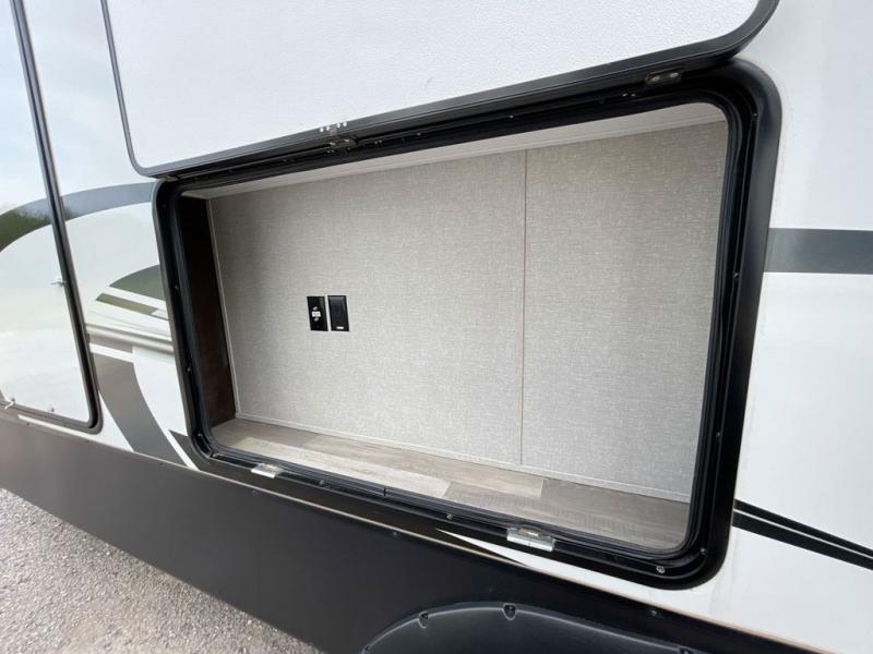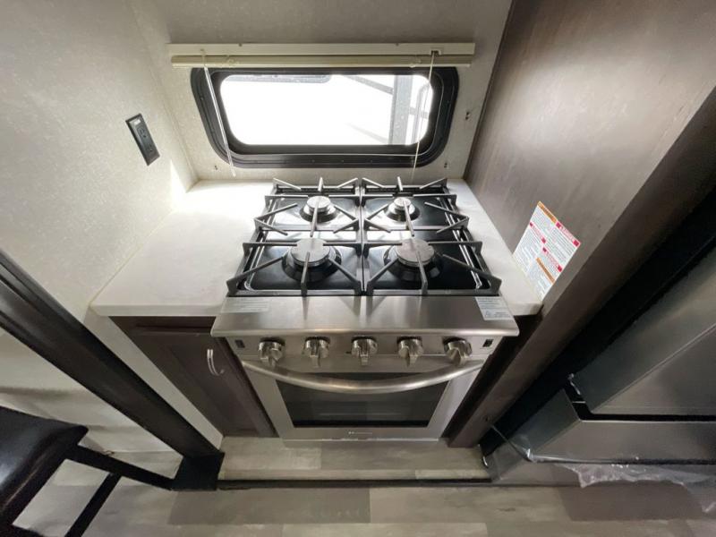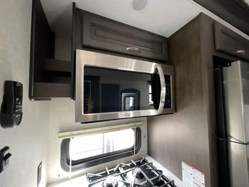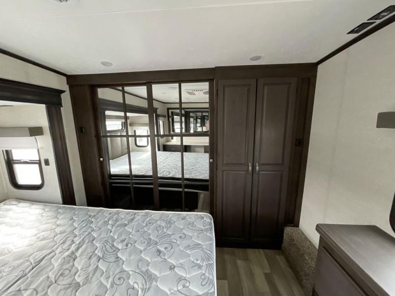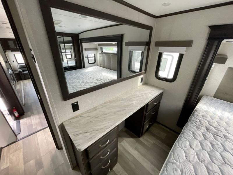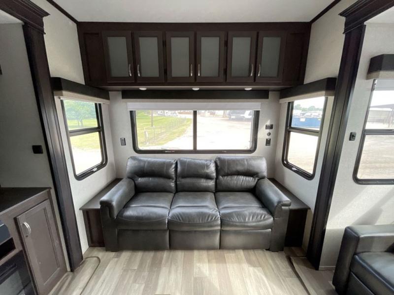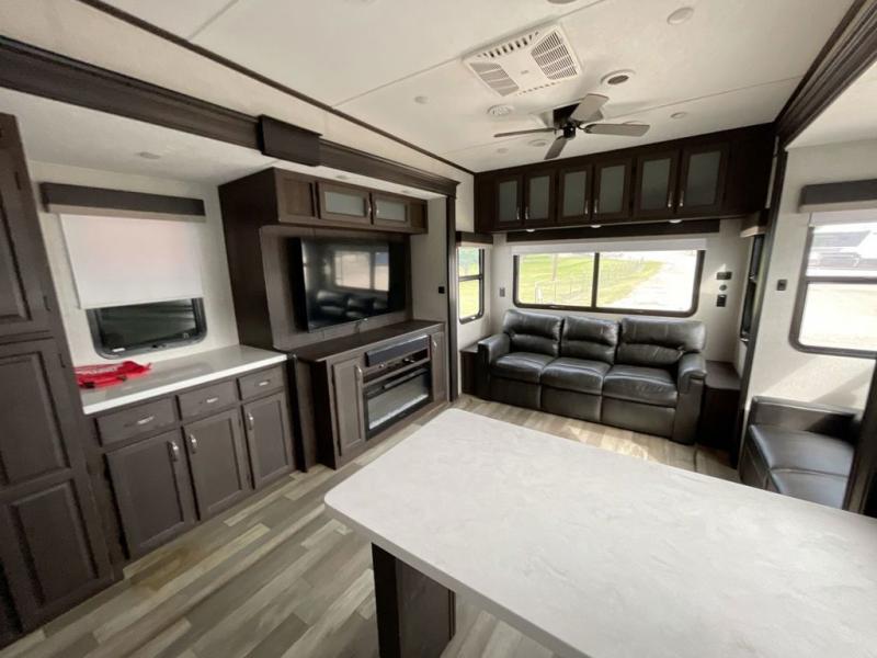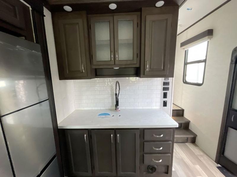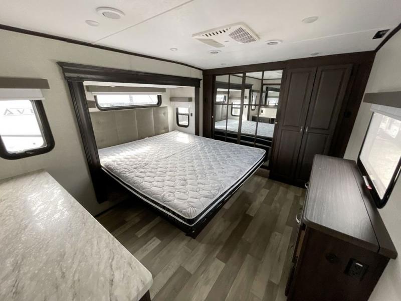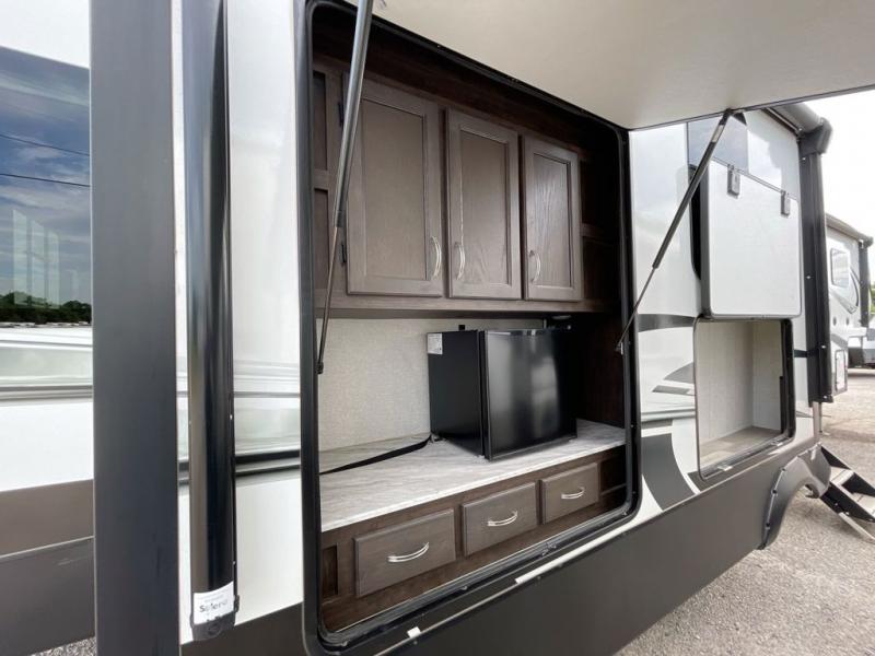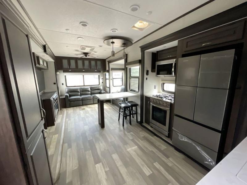 This fifth wheel is designed to make sure you enjoy every square foot! The private queen bedroom has plenty of storage, with a dresser and wardrobe, including prep for an optional washer and dryer. Plus there's a desk area with a chair so you can have a private space to set up your laptop and get some work done. In the living room, you have a variety of luxurious furniture, including a tri-fold sofa, theater seats, and an entertainment center. Step into the kitchen where you can sit at the bar top table with four bar stools. The kitchen is fully equipped with a residential cooktop and oven, microwave, and refrigerator. There's tons of storage, which also includes extra touches like a pantry with an adjacent coffee station so you can have a dedicated space to make hot drinks. Don't miss the outside amenities either, including a power awning and an exterior refrigerator.