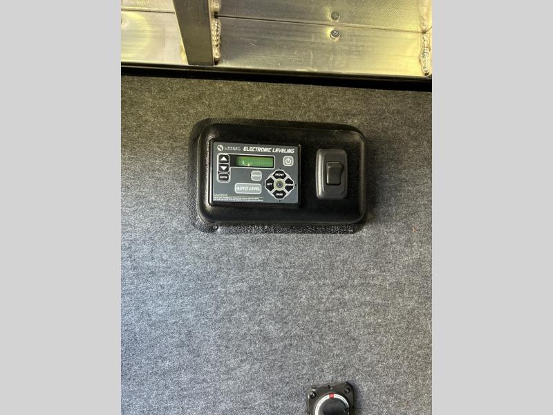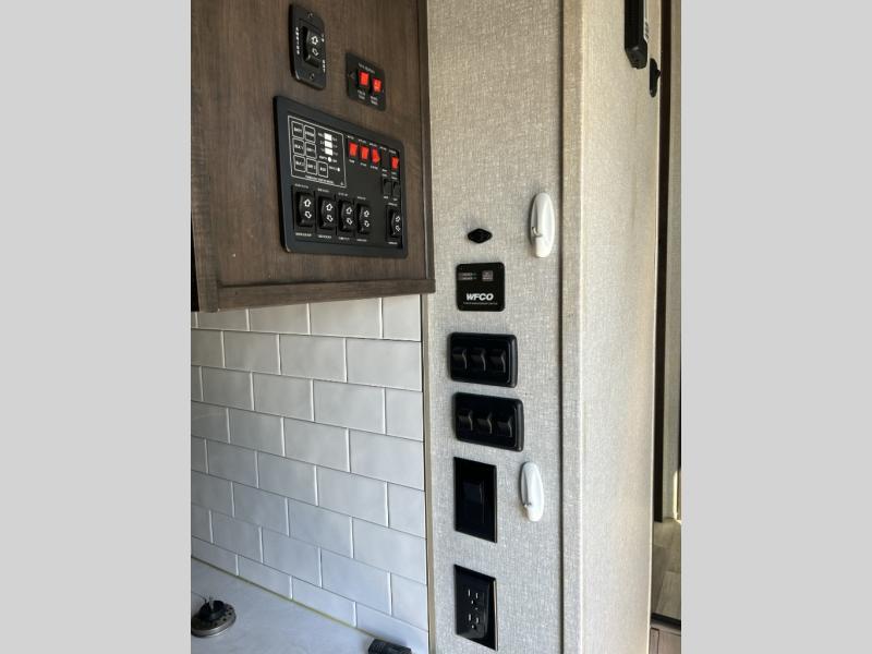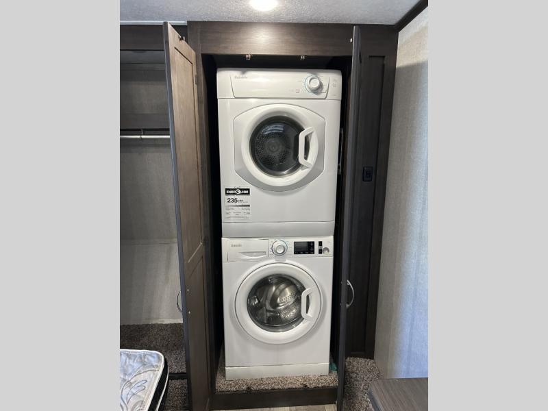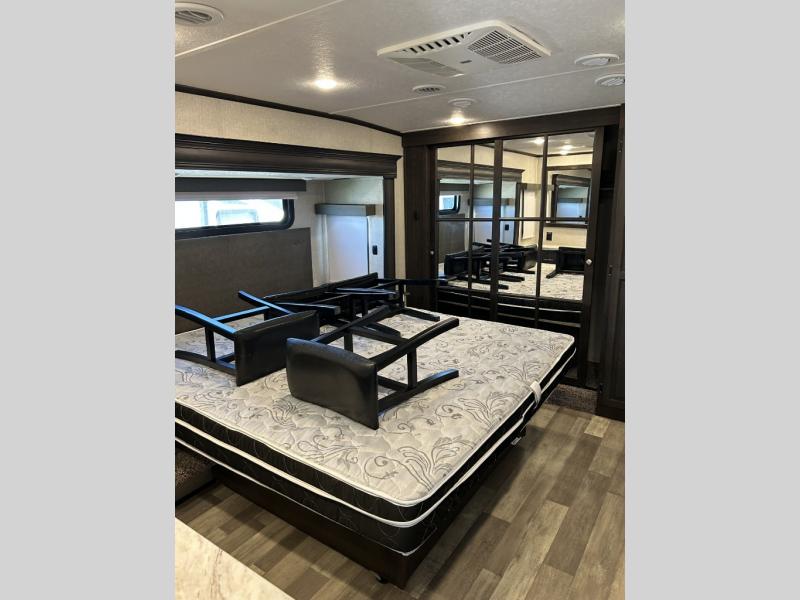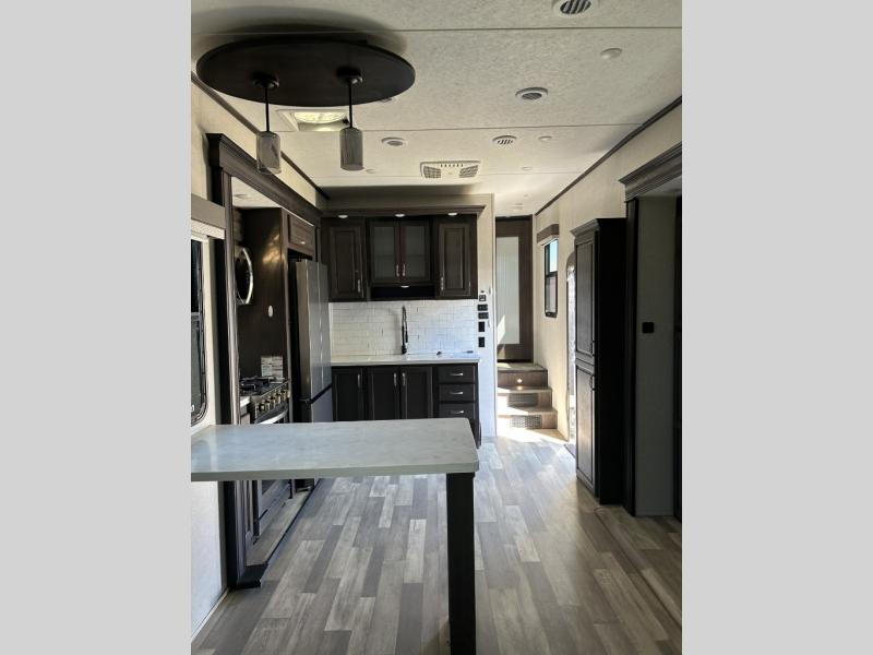 This fifth wheel is designed to make sure you enjoy every square foot! The private queen bedroom has plenty of storage, with a dresser and wardrobe, including prep for an optional washer and dryer. Plus there's a desk area with a chair so you can have a private space to set up your laptop and get some work done. In the living room, you have a variety of luxurious furniture, including a tri-fold sofa, theater seats, and an entertainment center. Step into the kitchen where you can sit at the bar top table with four bar stools. The kitchen is fully equipped with a residential cooktop and oven, microwave, and refrigerator. There's tons of storage, which also includes extra touches like a pantry with an adjacent coffee station so you can have a dedicated space to make hot drinks. Don't miss the outside amenities either, including a power awning and an exterior refrigerator.