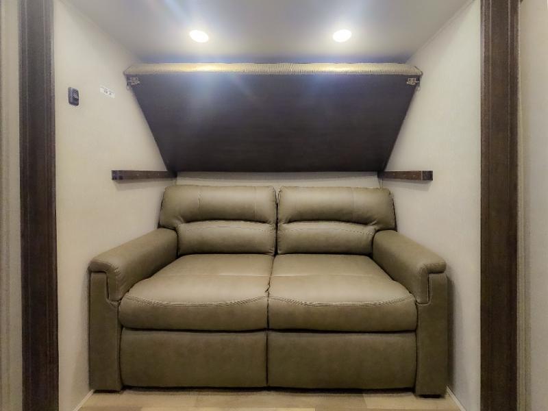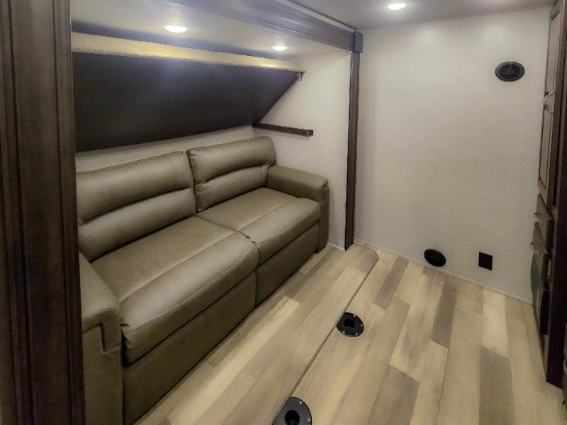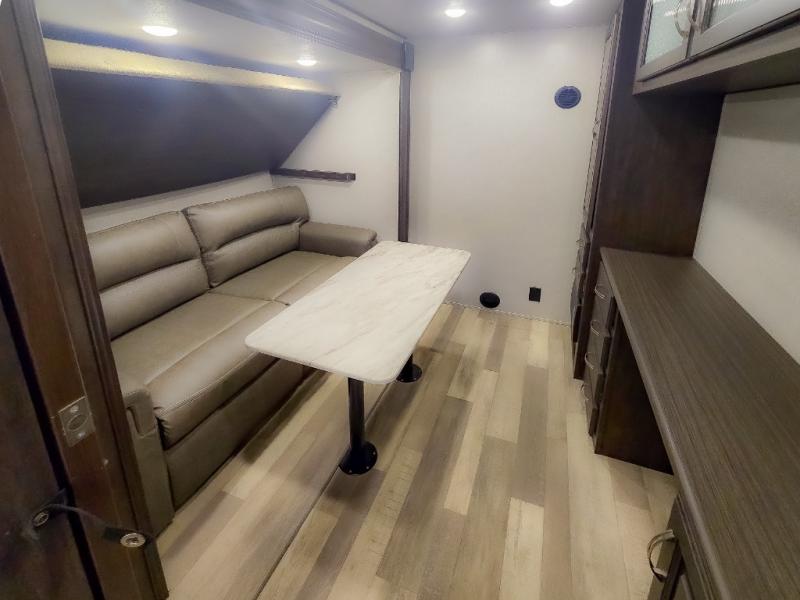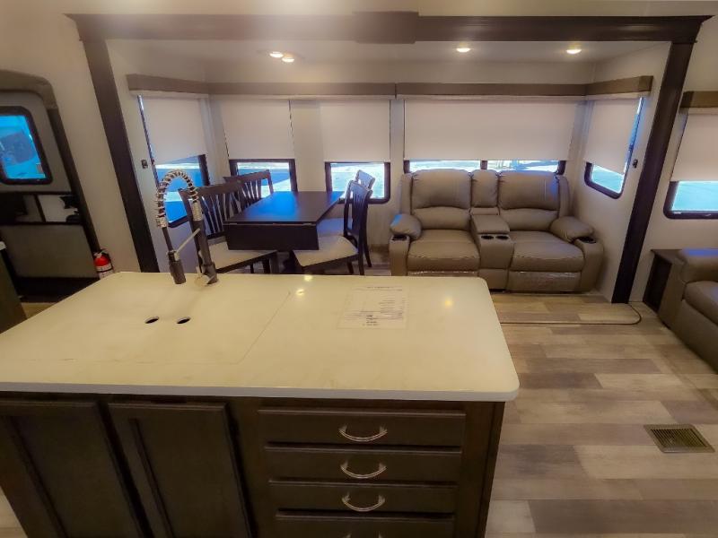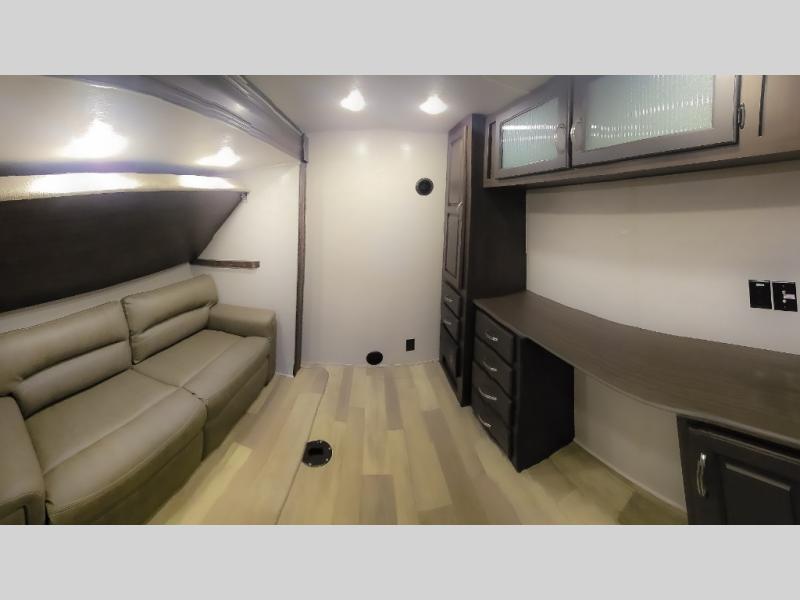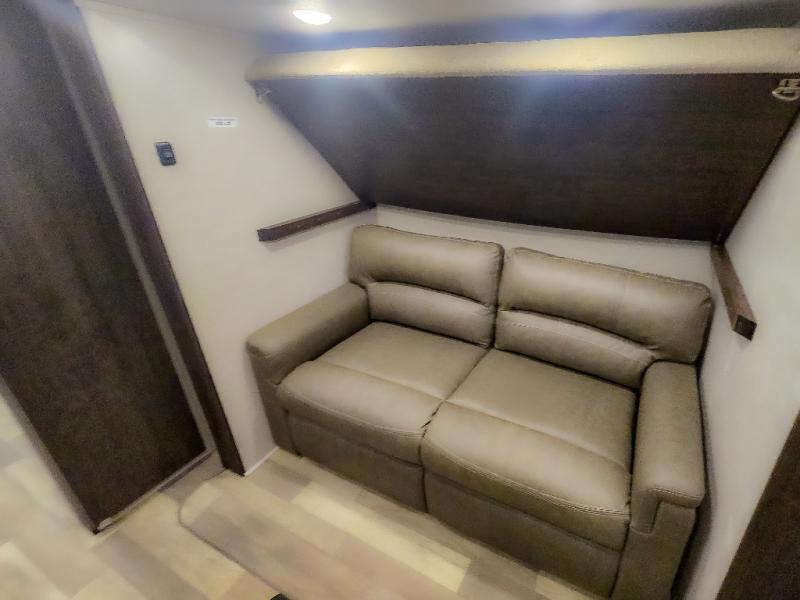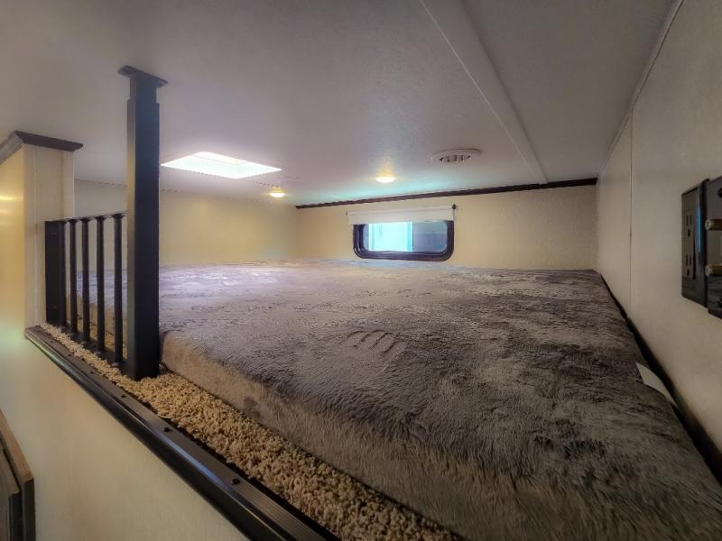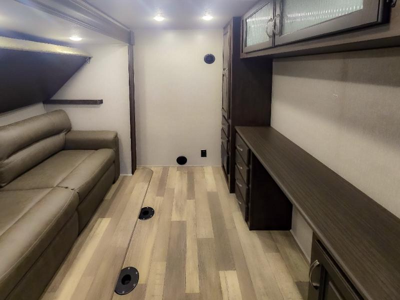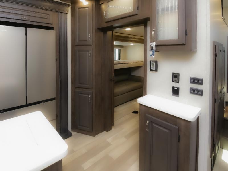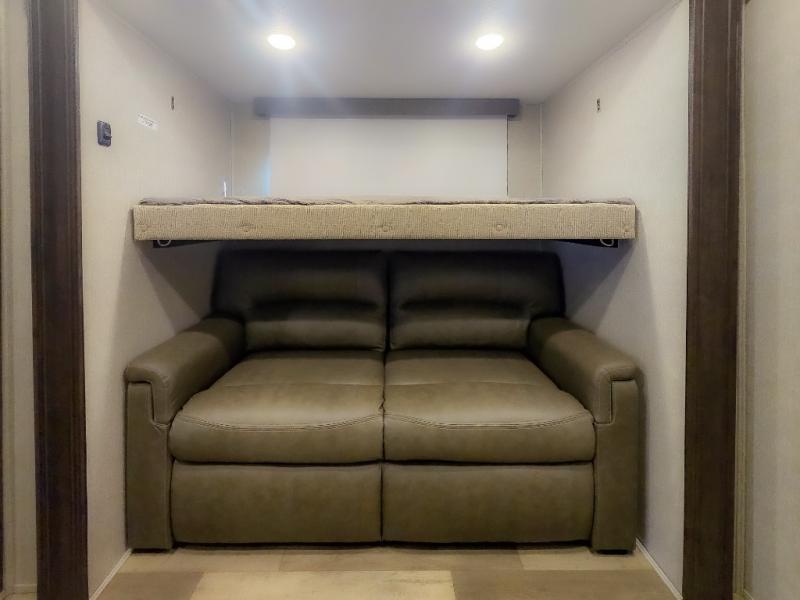 This family-friendly fifth wheel can sleep six comfortably between the queen bed, the tri-fold sofa, and the middle bunkhouse with a loft above! There is plenty of counter space in the bunkhouse, plus a sofa with a removable table and a wardrobe for clothes. The kitchen is any chef's dream with its residential cooktop, residential refrigerator, and kitchen island for more counter space. While dinner is being made, you can play a game of cards at the free-standing table, relax on the tri-fold sofa, or visit outdoors under the 20' power awning with LED lights. You won't be left wanting for storage space in this model thanks to the overhead cabinets, plus the bedroom dresser and large wardrobe. There is even a wardrobe with washer and dryer prep if you choose to go full-time!