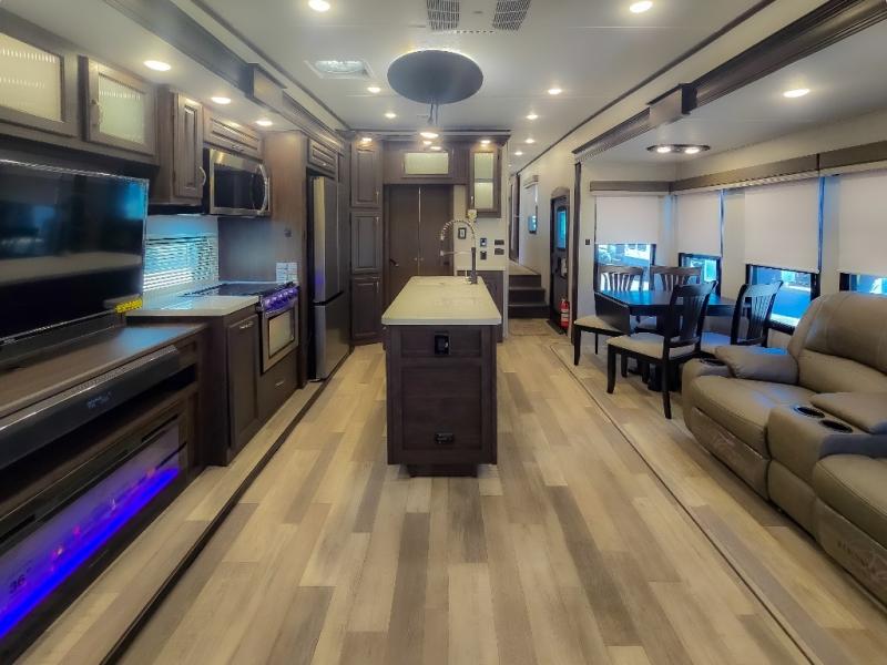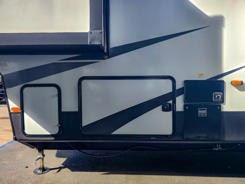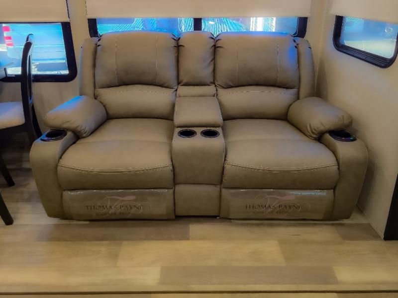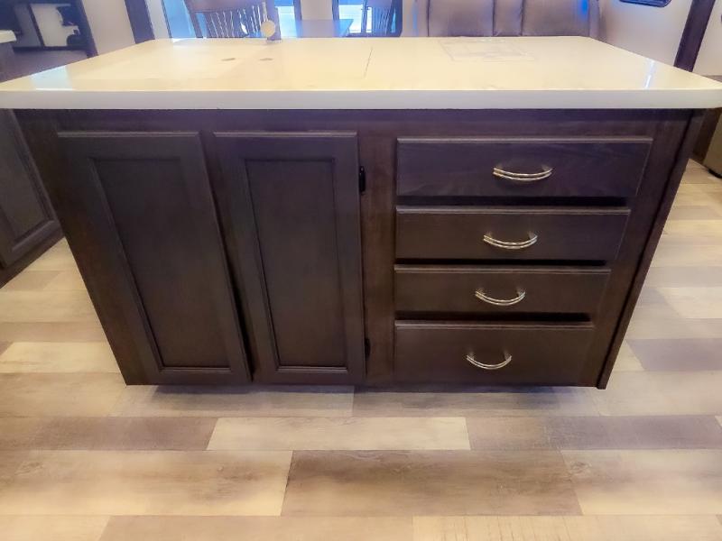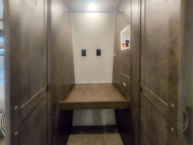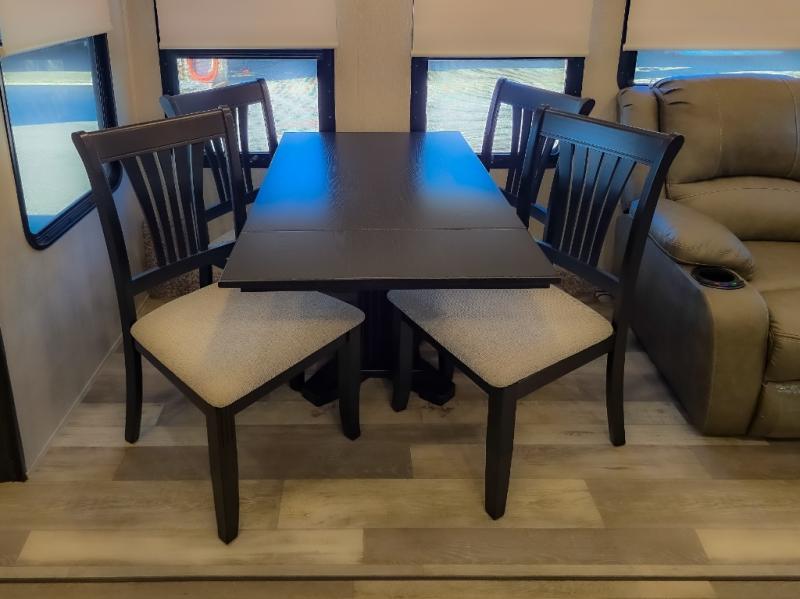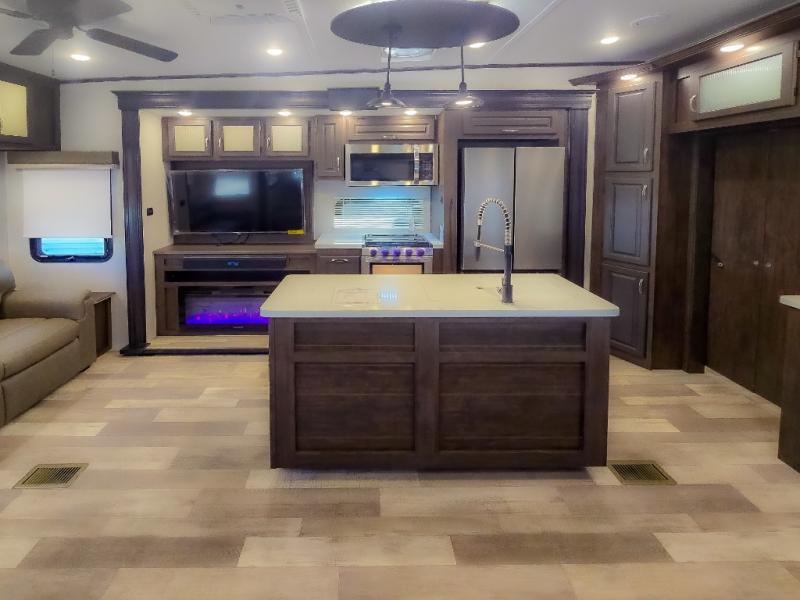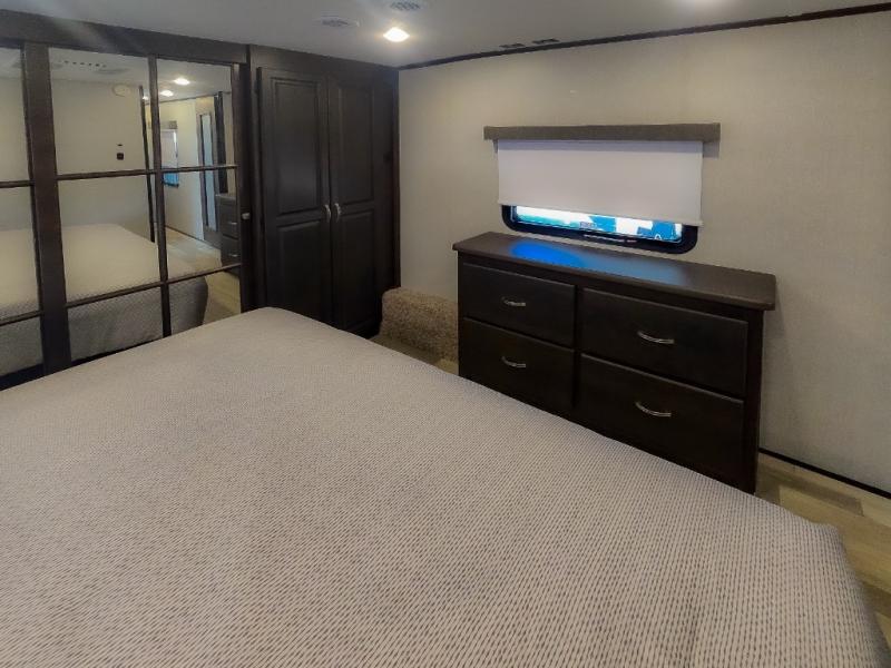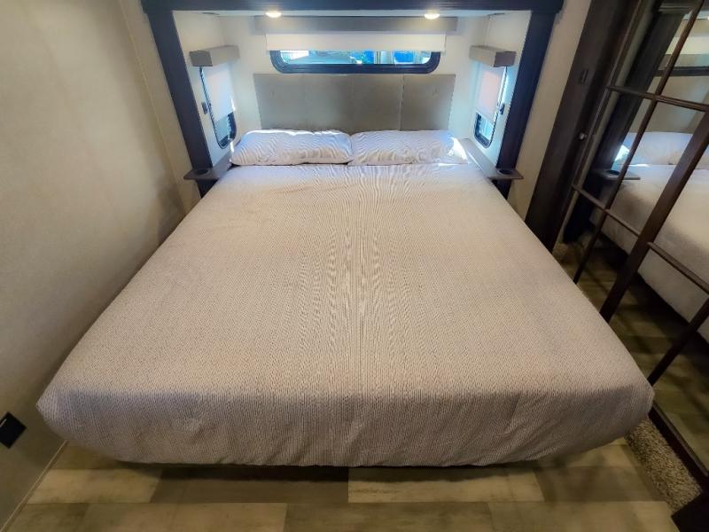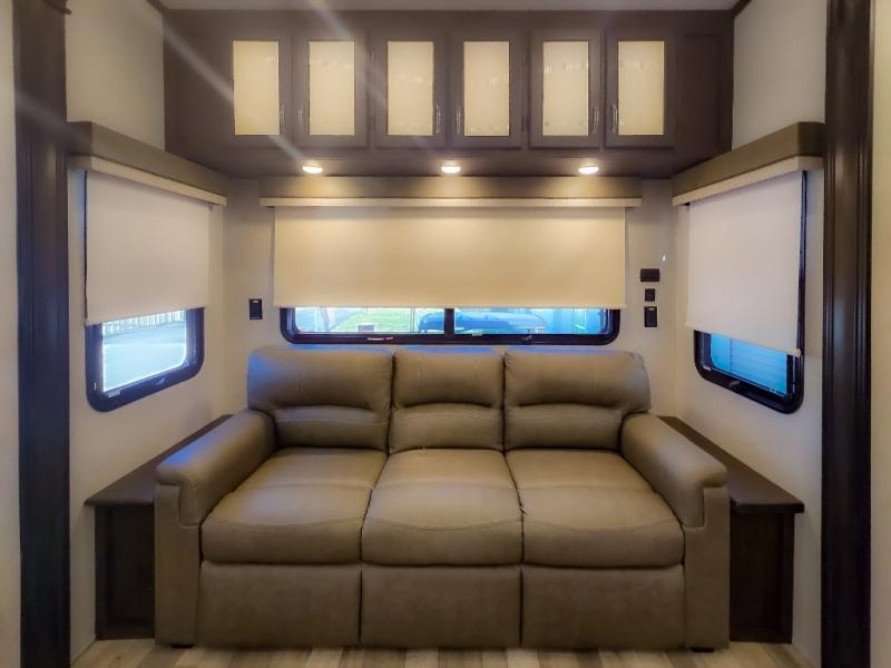 This family-friendly fifth wheel can sleep six comfortably between the queen bed, the tri-fold sofa, and the middle bunkhouse with a loft above! There is plenty of counter space in the bunkhouse, plus a sofa with a removable table and a wardrobe for clothes. The kitchen is any chef's dream with its residential cooktop, residential refrigerator, and kitchen island for more counter space. While dinner is being made, you can play a game of cards at the free-standing table, relax on the tri-fold sofa, or visit outdoors under the 20' power awning with LED lights. You won't be left wanting for storage space in this model thanks to the overhead cabinets, plus the bedroom dresser and large wardrobe. There is even a wardrobe with washer and dryer prep if you choose to go full-time!