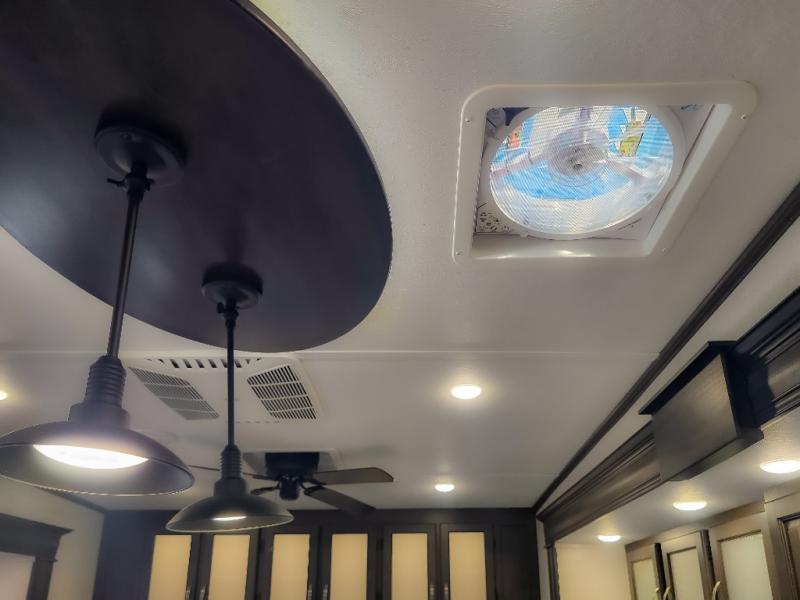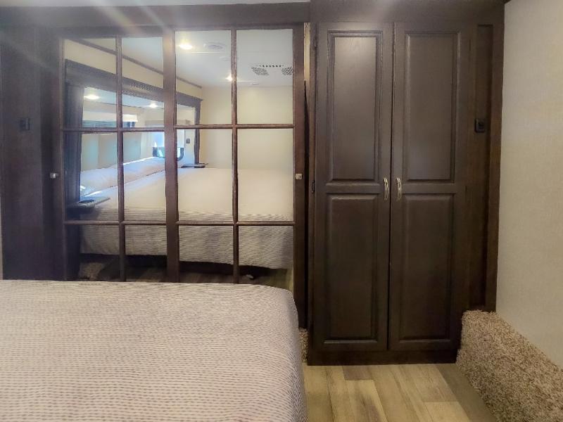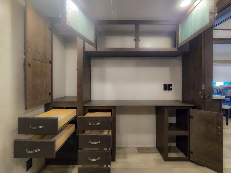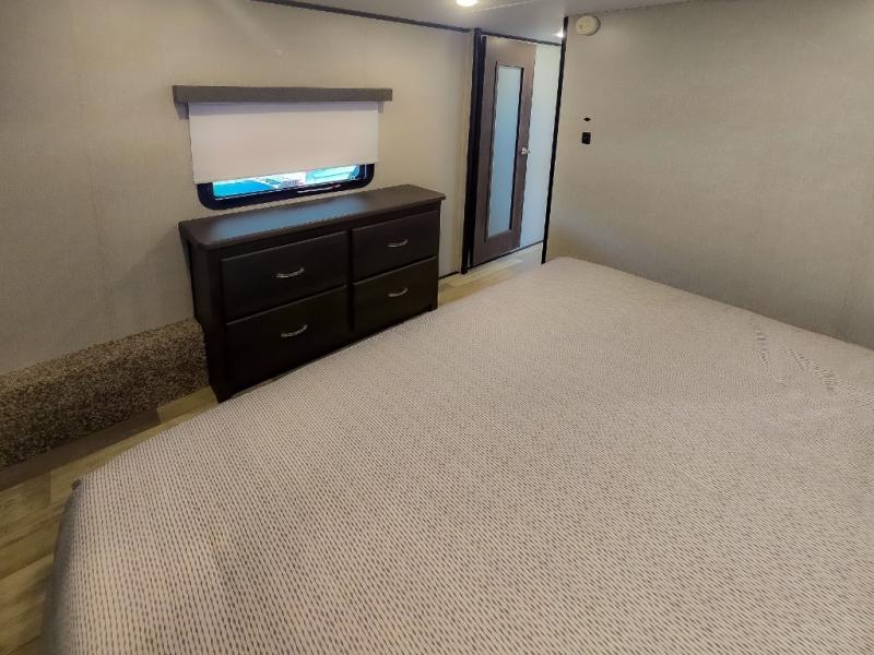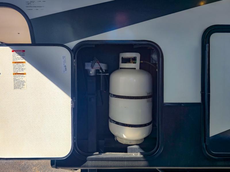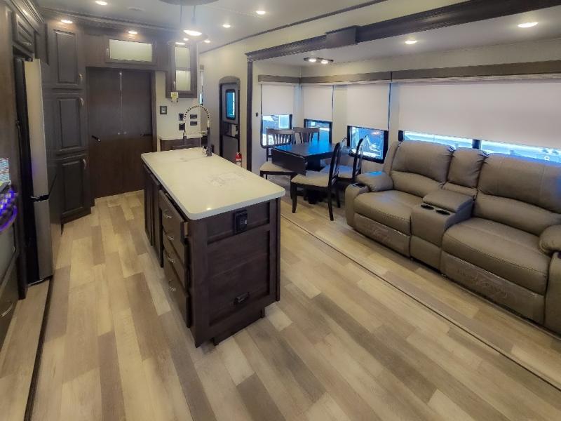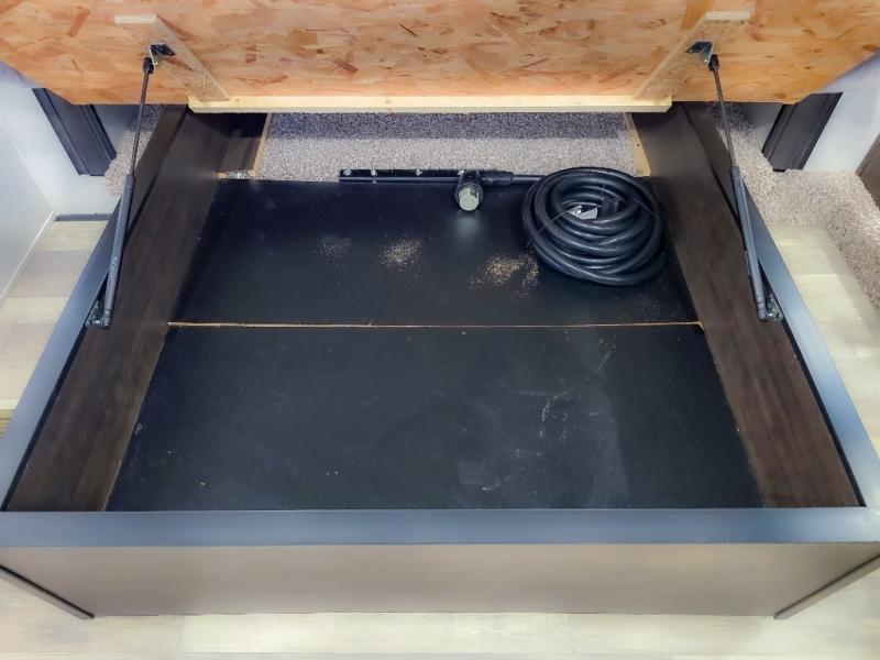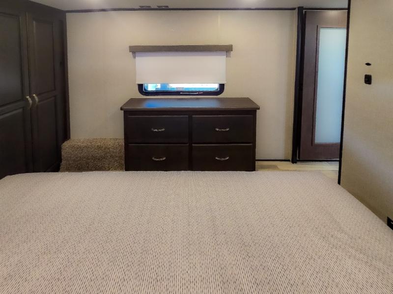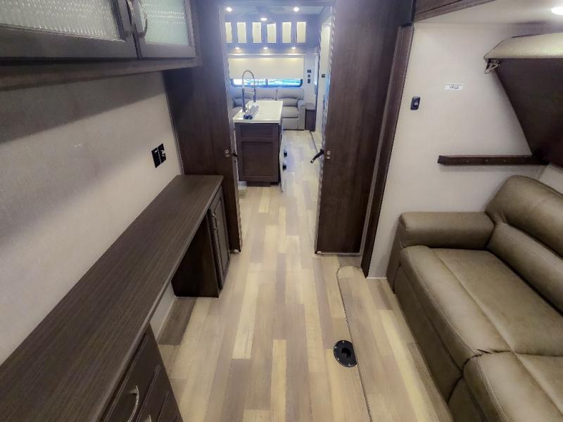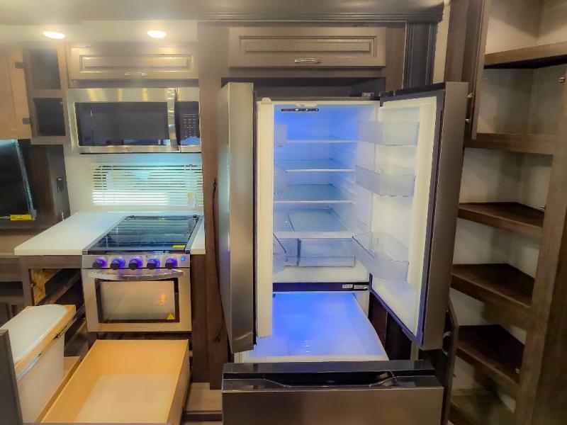 This family-friendly fifth wheel can sleep six comfortably between the queen bed, the tri-fold sofa, and the middle bunkhouse with a loft above! There is plenty of counter space in the bunkhouse, plus a sofa with a removable table and a wardrobe for clothes. The kitchen is any chef's dream with its residential cooktop, residential refrigerator, and kitchen island for more counter space. While dinner is being made, you can play a game of cards at the free-standing table, relax on the tri-fold sofa, or visit outdoors under the 20' power awning with LED lights. You won't be left wanting for storage space in this model thanks to the overhead cabinets, plus the bedroom dresser and large wardrobe. There is even a wardrobe with washer and dryer prep if you choose to go full-time!