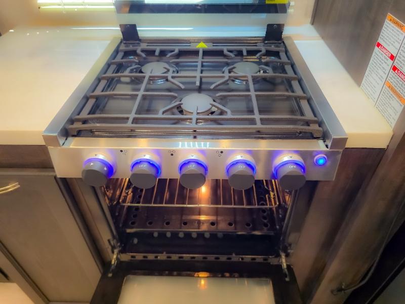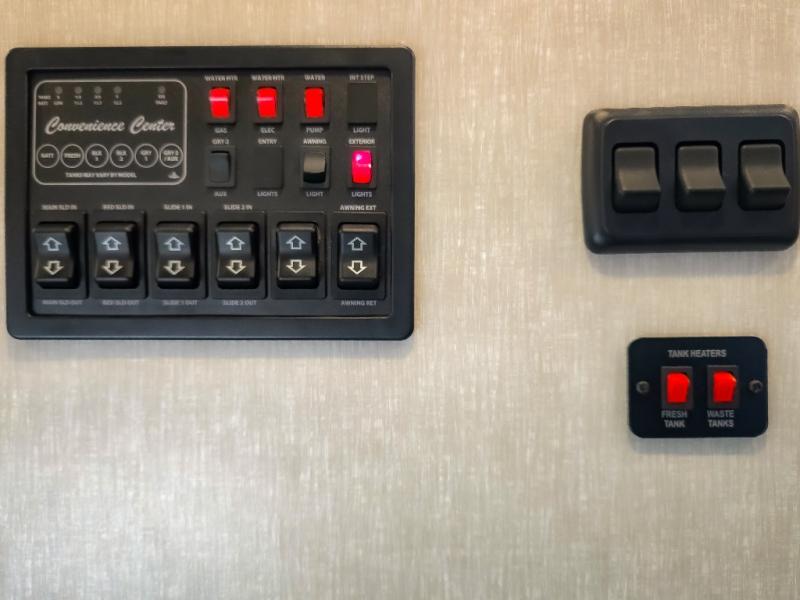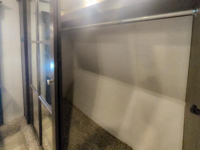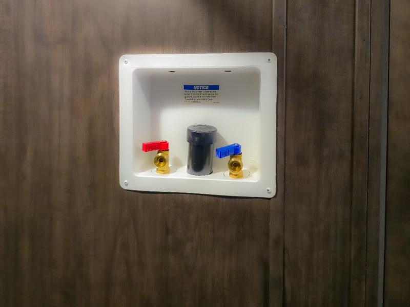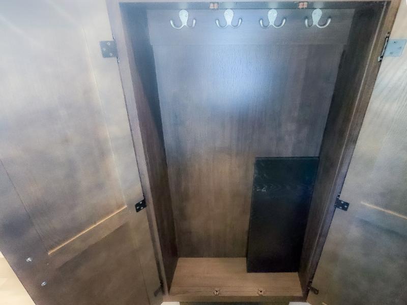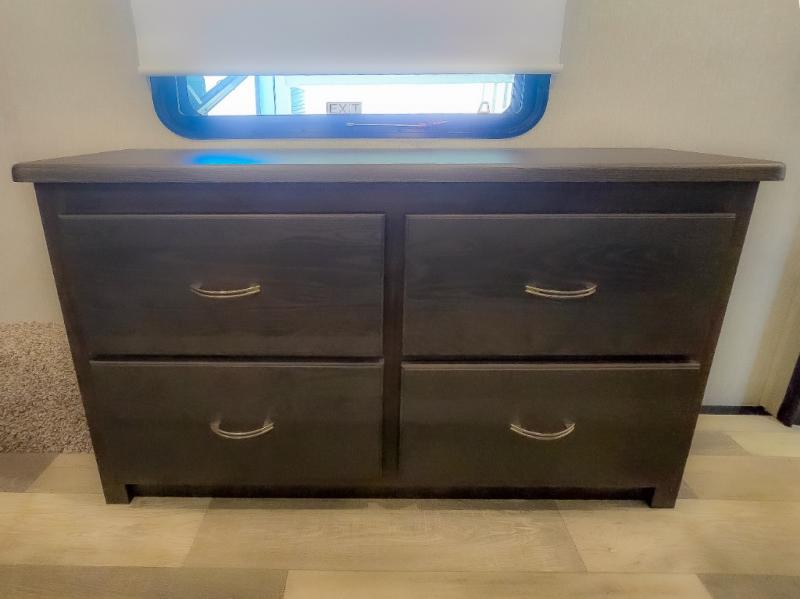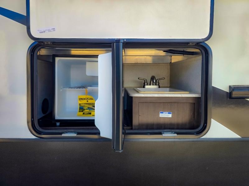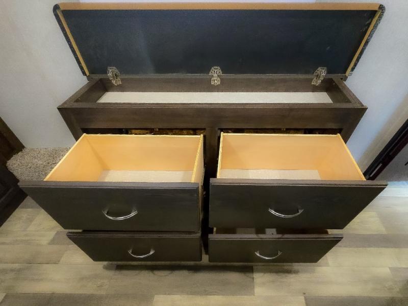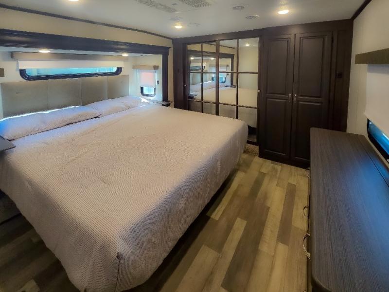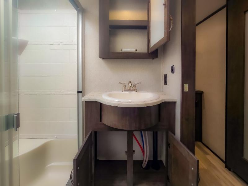 This family-friendly fifth wheel can sleep six comfortably between the queen bed, the tri-fold sofa, and the middle bunkhouse with a loft above! There is plenty of counter space in the bunkhouse, plus a sofa with a removable table and a wardrobe for clothes. The kitchen is any chef's dream with its residential cooktop, residential refrigerator, and kitchen island for more counter space. While dinner is being made, you can play a game of cards at the free-standing table, relax on the tri-fold sofa, or visit outdoors under the 20' power awning with LED lights. You won't be left wanting for storage space in this model thanks to the overhead cabinets, plus the bedroom dresser and large wardrobe. There is even a wardrobe with washer and dryer prep if you choose to go full-time!