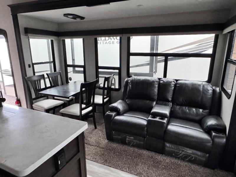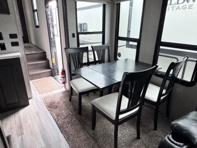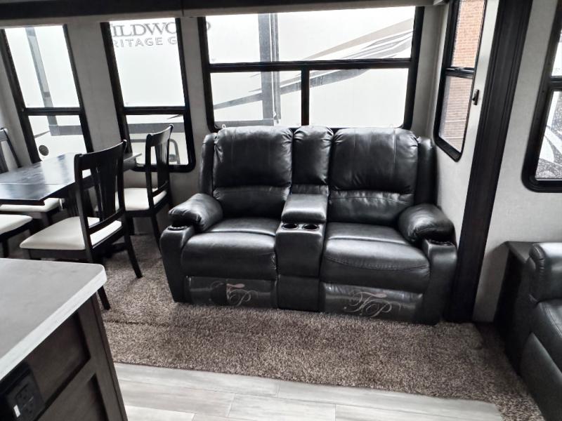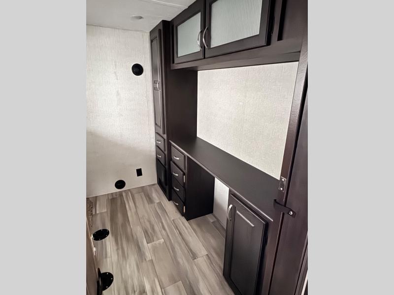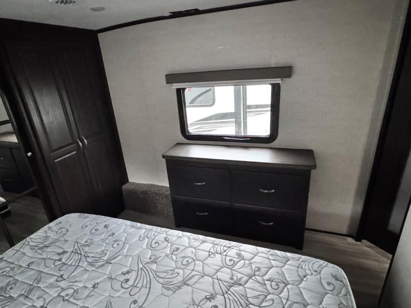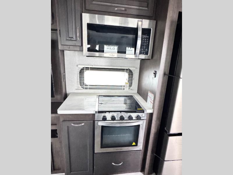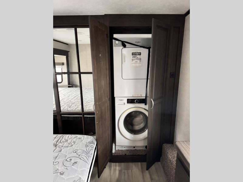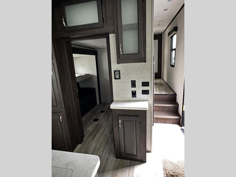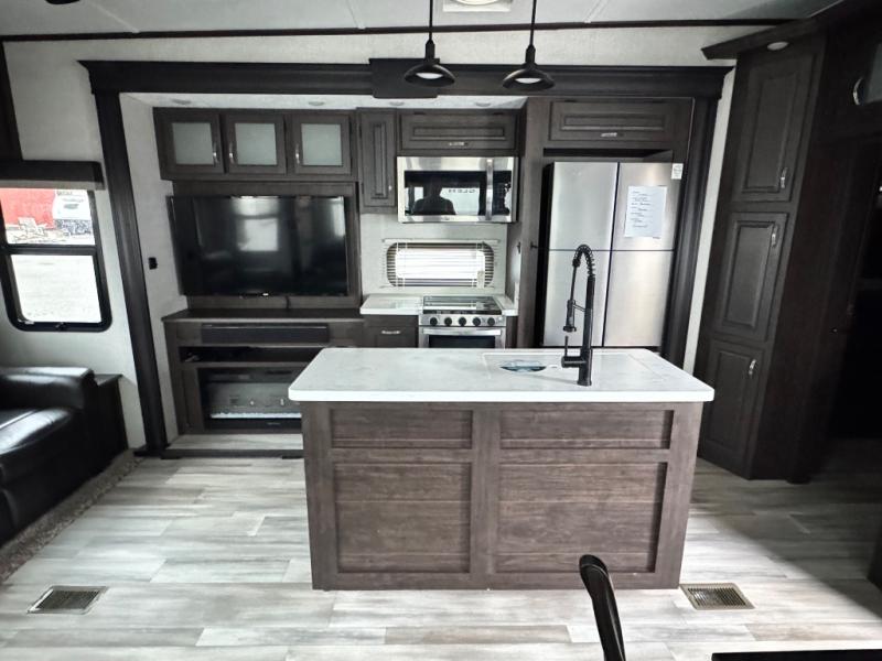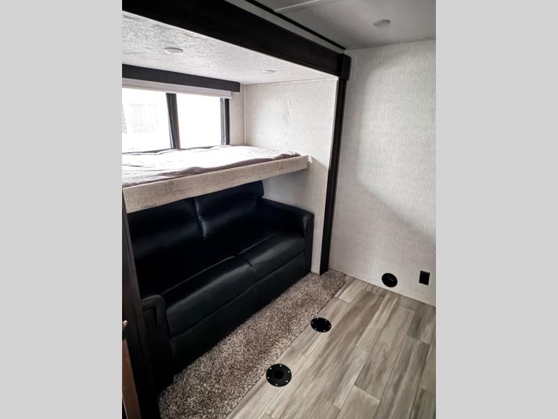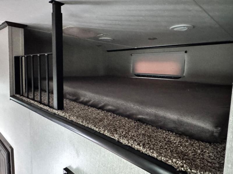 This family-friendly fifth wheel can sleep six comfortably between the queen bed, the tri-fold sofa, and the middle bunkhouse with a loft above! There is plenty of counter space in the bunkhouse, plus a sofa with a removable table and a wardrobe for clothes. The kitchen is any chef's dream with its residential cooktop, residential refrigerator, and kitchen island for more counter space. While dinner is being made, you can play a game of cards at the free-standing table, relax on the tri-fold sofa, or visit outdoors under the 20' power awning with LED lights. You won't be left wanting for storage space in this model thanks to the overhead cabinets, plus the bedroom dresser and large wardrobe. There is even a wardrobe with washer and dryer prep if you choose to go full-time!