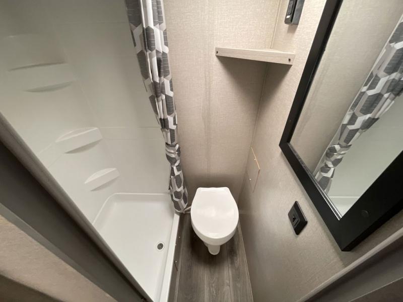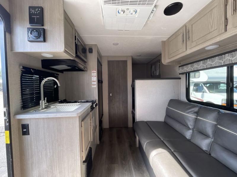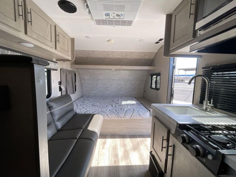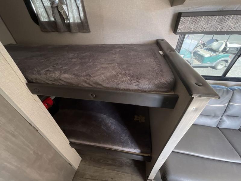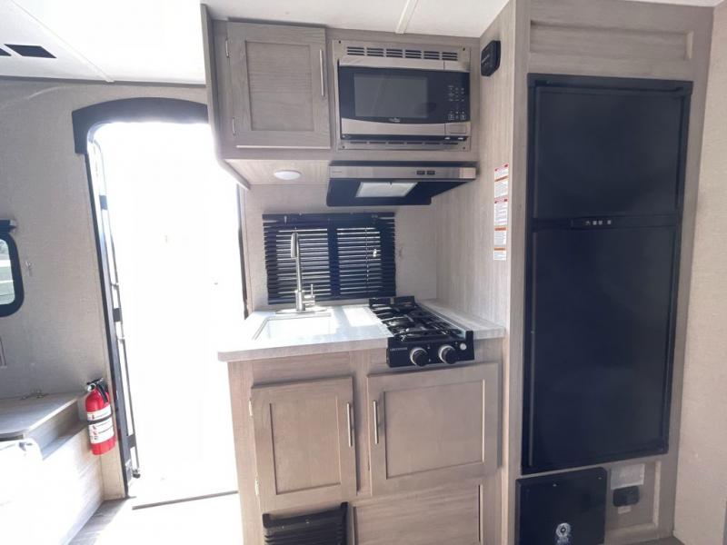This travel trailers is perfect for a young family. You can easily sleep four or more with the rear set of bunk beds and queen bed up front. There is also a 60" jiffy sofa for inside down-time, as well as complete kitchen and bath amenities so you can cook and stay clean while traveling. The rear corner bath features a toilet and 36" x 30" shower, and it's conveniently located next to the bunk beds which is great for little ones at night. Cooking inside will be easy with a two-burner cooktop and single sink, plus there is also a microwave oven for snacks and things that you can easily warm up. If you plan to spend most of your time outdoors, you will find plenty of storage space in the front pass-through compartment and beneath the bunks in back for outdoor toys and gear. There is also plenty of storage inside as well.
