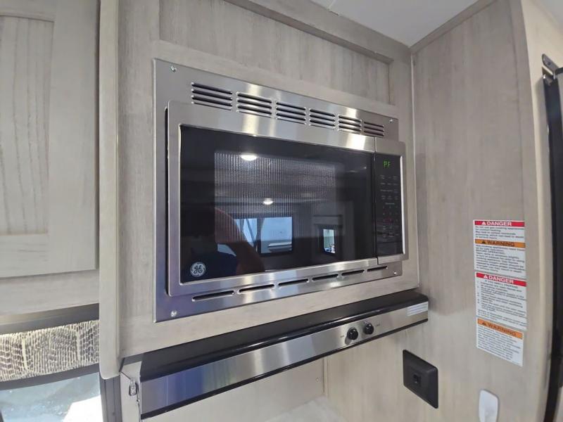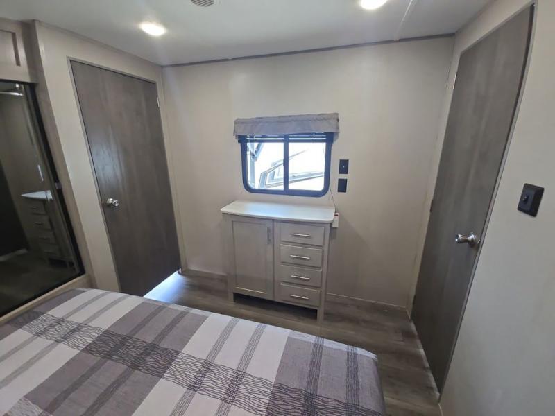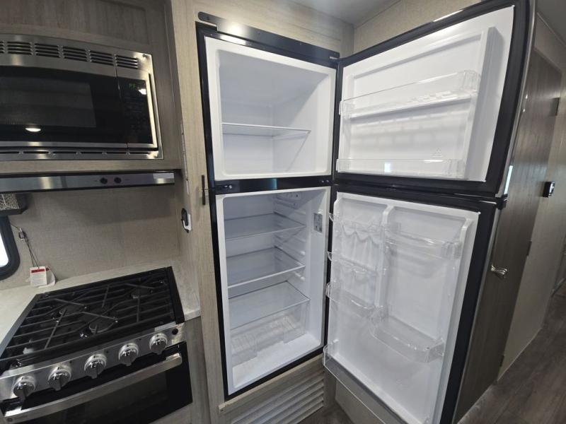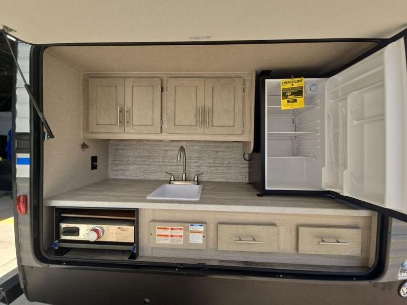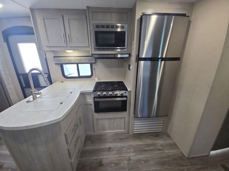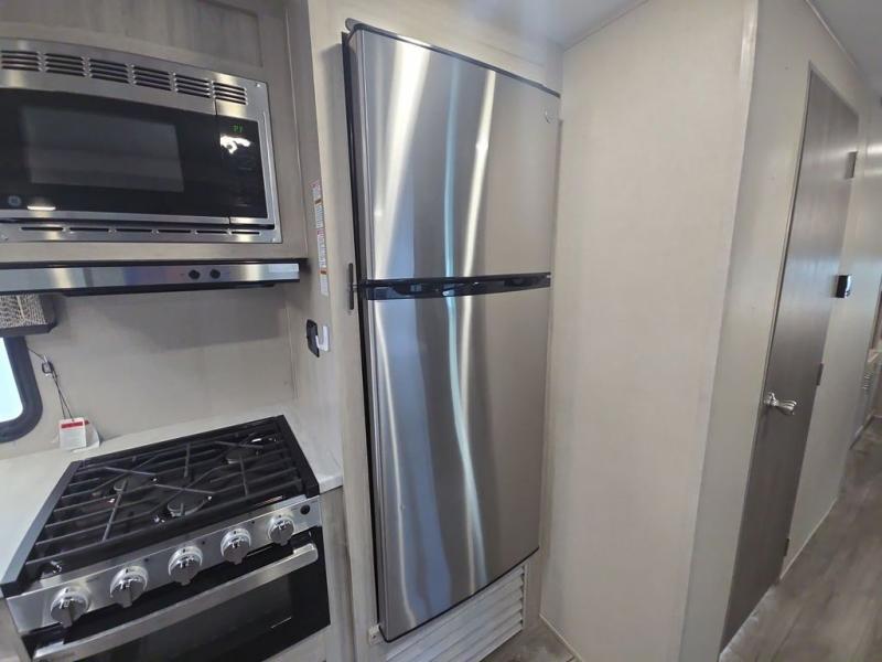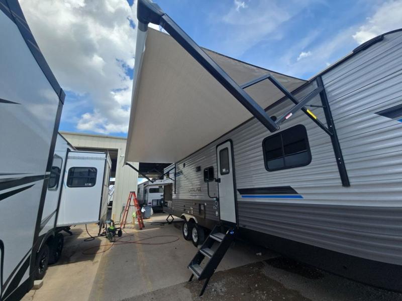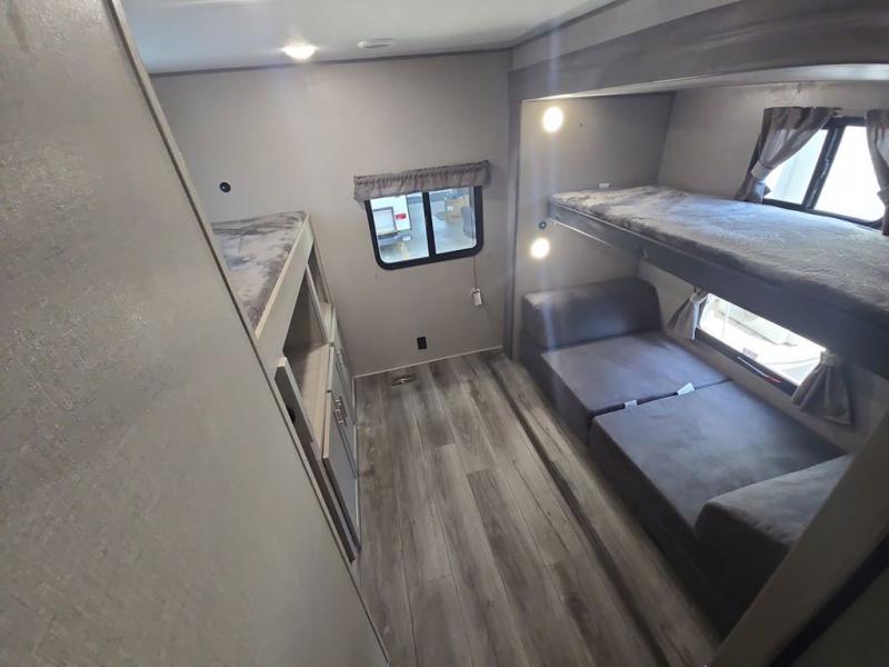 This family-friendly trailer offers lots of floor space thanks to the triple slides throughout! You and your family will love the combined living and kitchen area with a slide out booth dinette and a sofa with drink holders. The L-shaped kitchen counter allows the cook to make meals without moving for anyone trying to get to the full bathroom or the rear bunkhouse. The kids will have their own privacy, two bunk beds, a COA cube futon and the slide offers more floor space to spread out. The front private bedroom allows you to sleep like a queen, and offers a large closet for your clothing and another closet prepped for a washer/dryer. And don't forget about the full size camper kitchen and the 21' power awning with multicolor LED lights when you are outside.