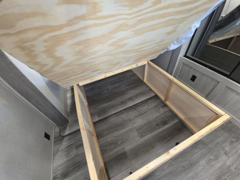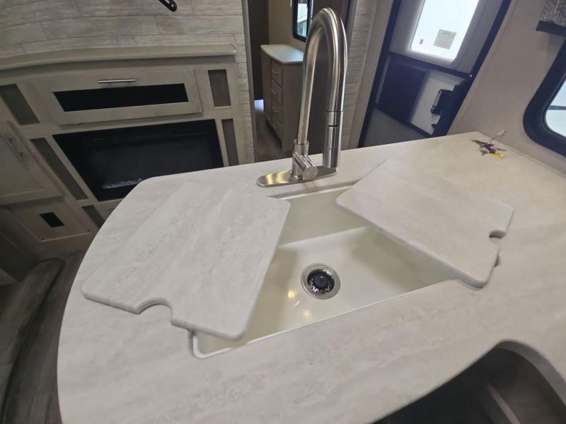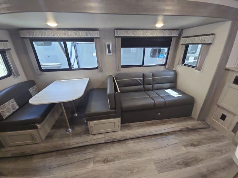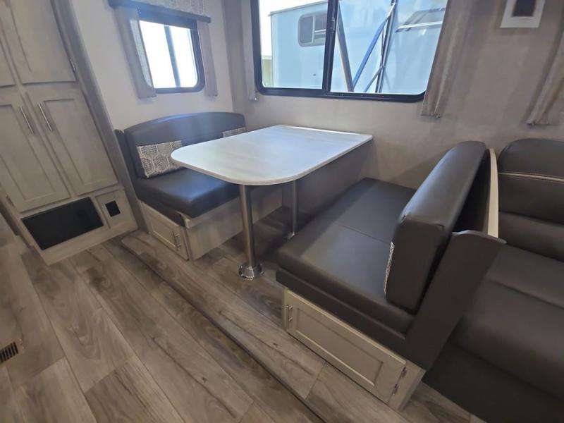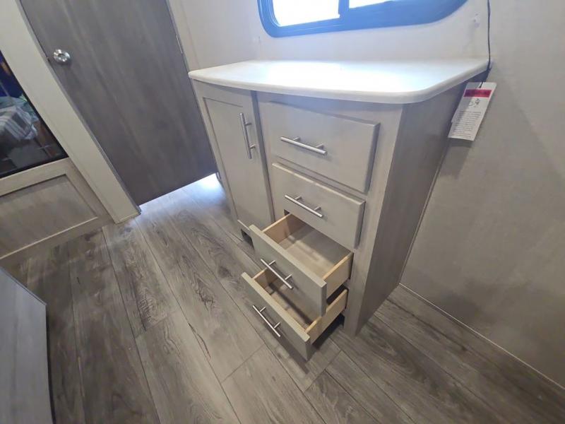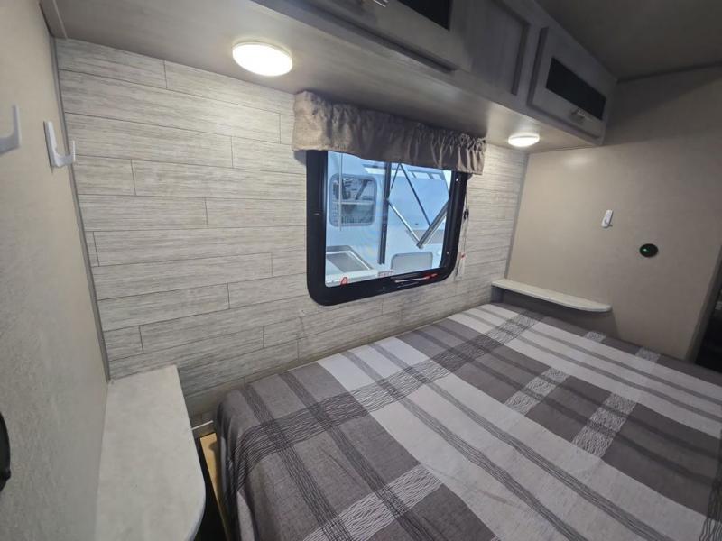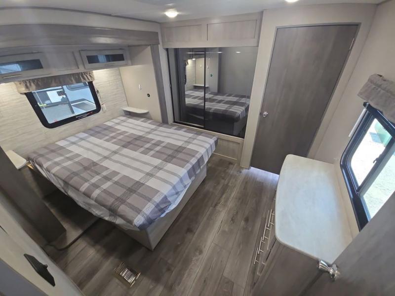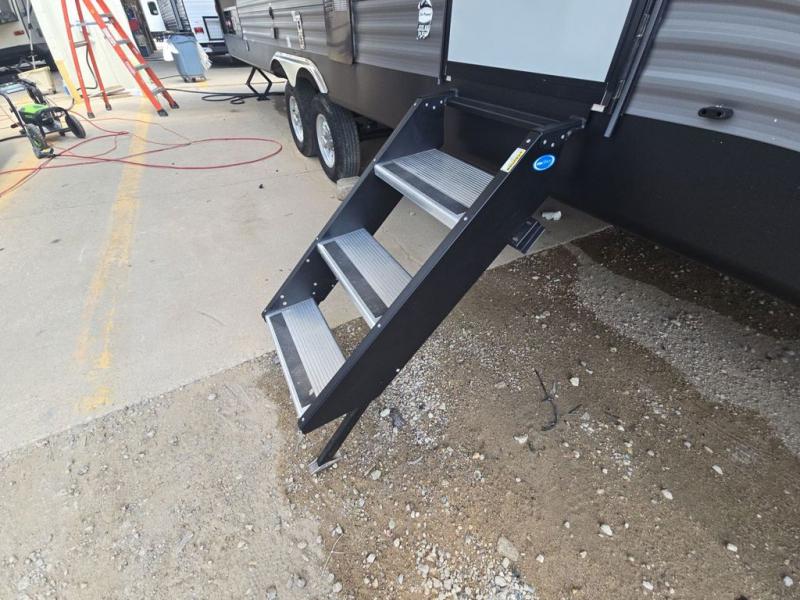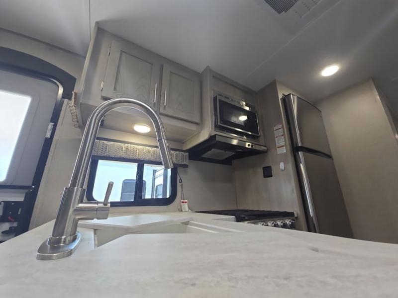 This family-friendly trailer offers lots of floor space thanks to the triple slides throughout! You and your family will love the combined living and kitchen area with a slide out booth dinette and a sofa with drink holders. The L-shaped kitchen counter allows the cook to make meals without moving for anyone trying to get to the full bathroom or the rear bunkhouse. The kids will have their own privacy, two bunk beds, a COA cube futon and the slide offers more floor space to spread out. The front private bedroom allows you to sleep like a queen, and offers a large closet for your clothing and another closet prepped for a washer/dryer. And don't forget about the full size camper kitchen and the 21' power awning with multicolor LED lights when you are outside.