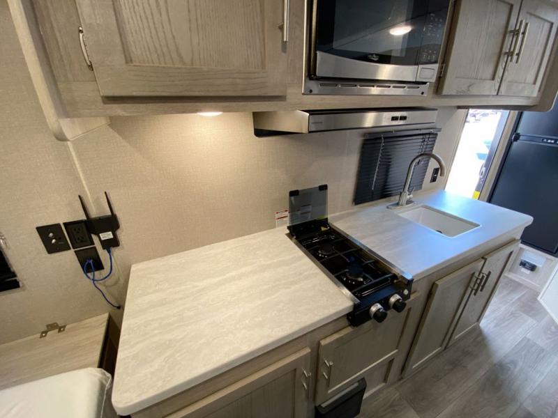 Get ready for adventure either at a local RV park or off-grid as you enjoy the outdoors. You will be able to return to your own accommodations in this trailer with a spacious interior thanks to the single slide that offers more elbow room and floor space to move about, and plenty of space to stretch your legs, and dine. This area is also great for an overnight guest or two small children to sleep on. Spend your days outside swimming at the lake or hiking trails to return to a rear corner bath with a 32" x 32" radius shower that will allow you to get cleaned up before bed. You will find an RV queen bed with a countertop at the foot of the bed which is a perfect spot to drop your phones for the night or stash your reading material, alarm clock and/or purse/wallet. This model also includes a heavy-duty table to use indoors or outdoors!