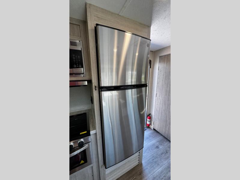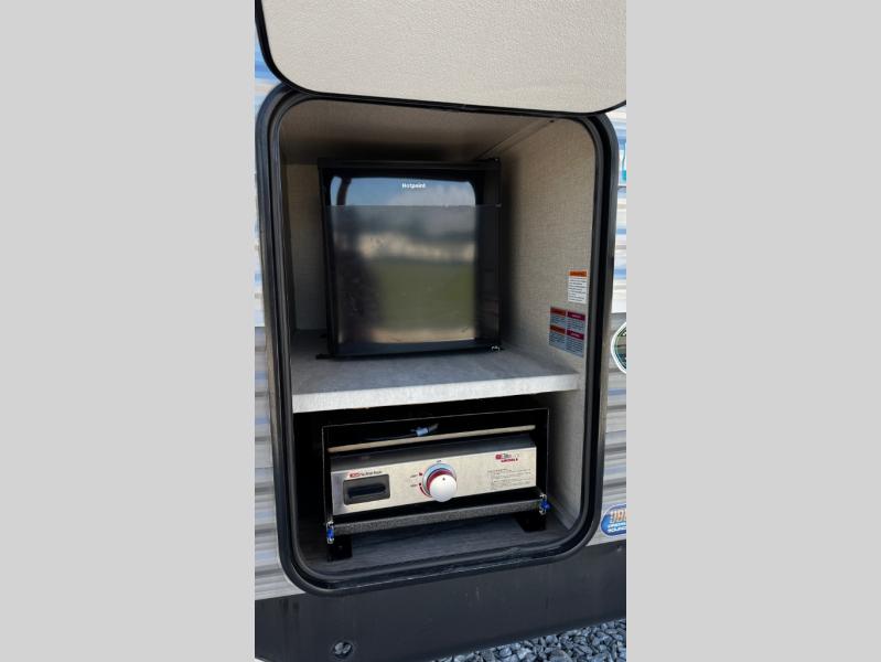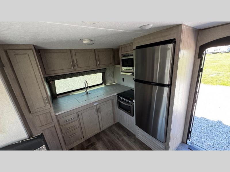 Step into comfort with this front kitchen travel trailer! You will love the amount of counter space you have to prep and cook meals. There is also an outdoor camper kitchen with a griddle and mini refrigerator for breakfast outdoors. There is plenty of storage space for all your belongings, including two kitchen pantries, overhead cabinets, a closet and a wardrobe, plus a pass-through storage. Your crew can get comfortable on the 70" sofa and booth dinette within the large slide out, and there is an entertainment center if you plan to bring your own TV. And don't overlook the rear master bedroom with a queen bed slide out, a wardrobe, plus its own exterior entry door!