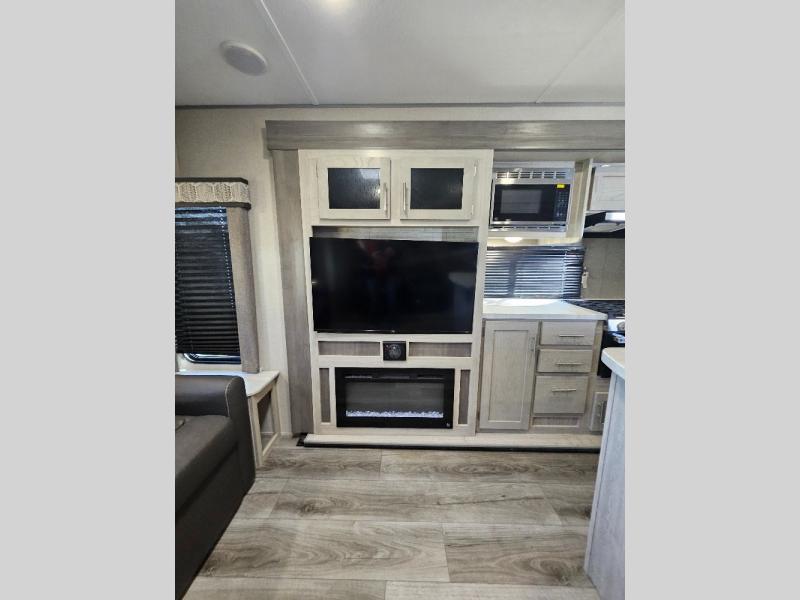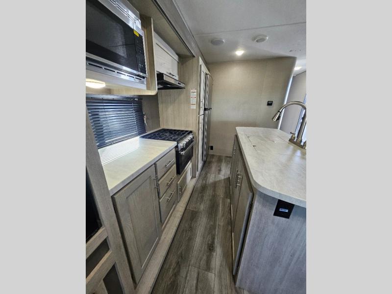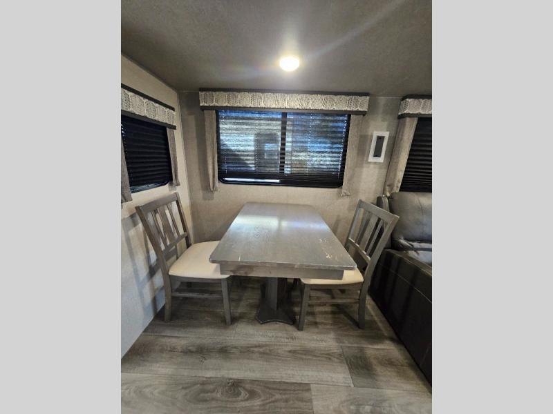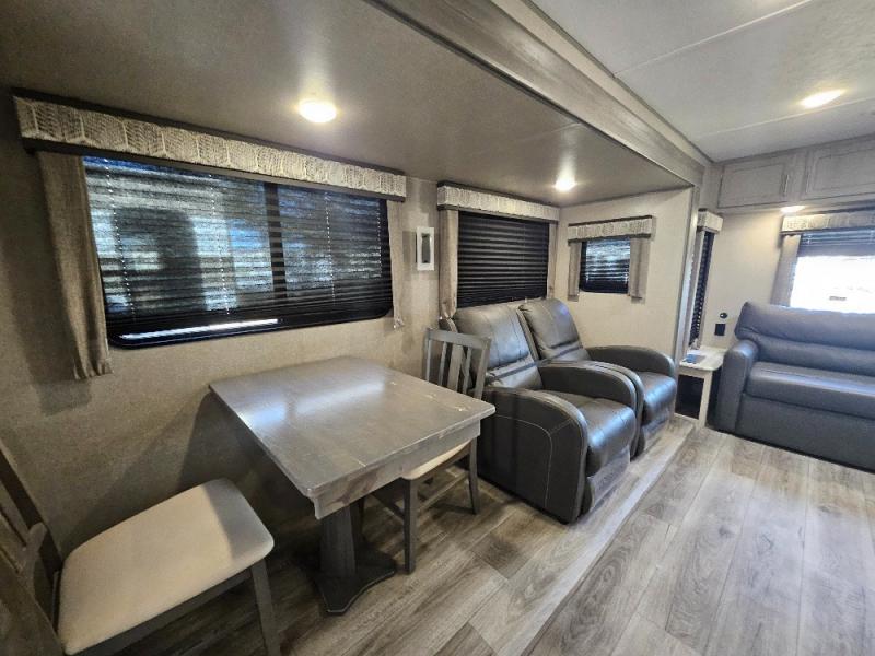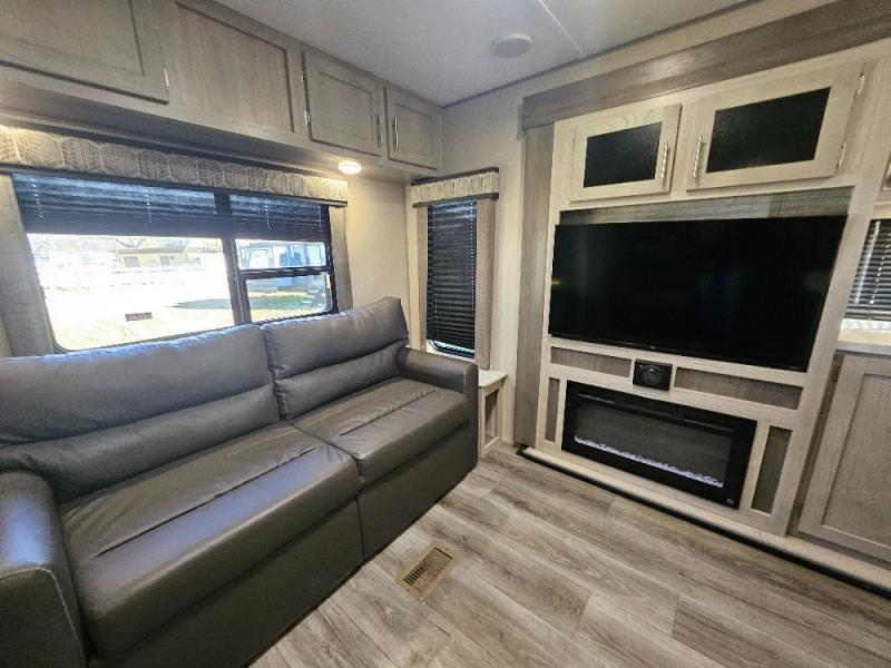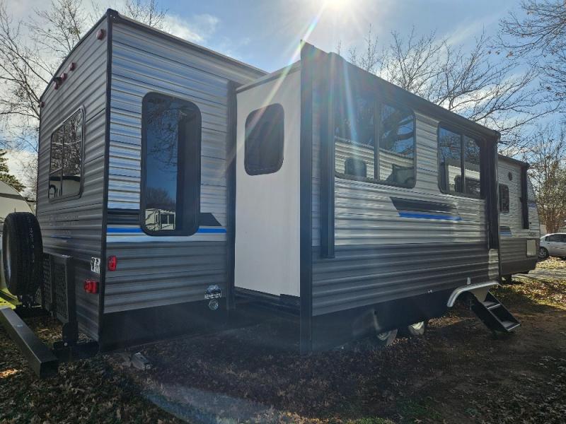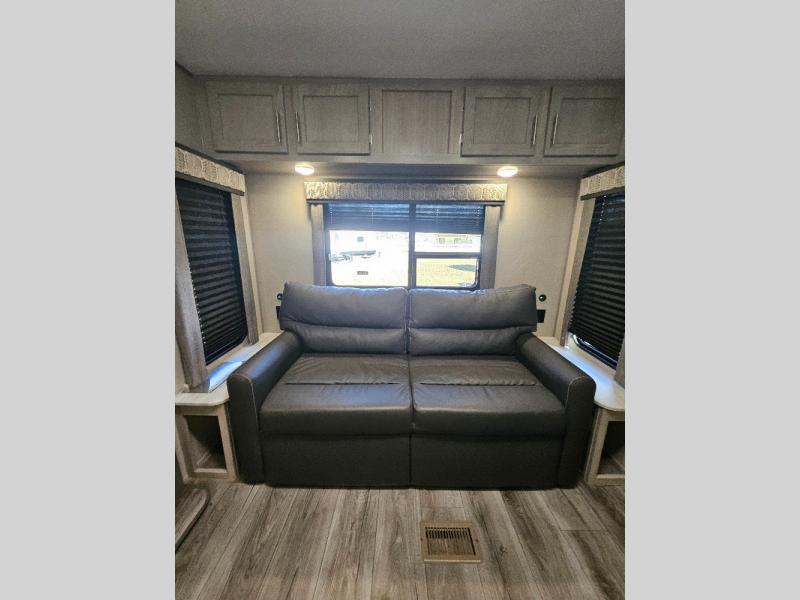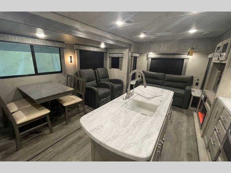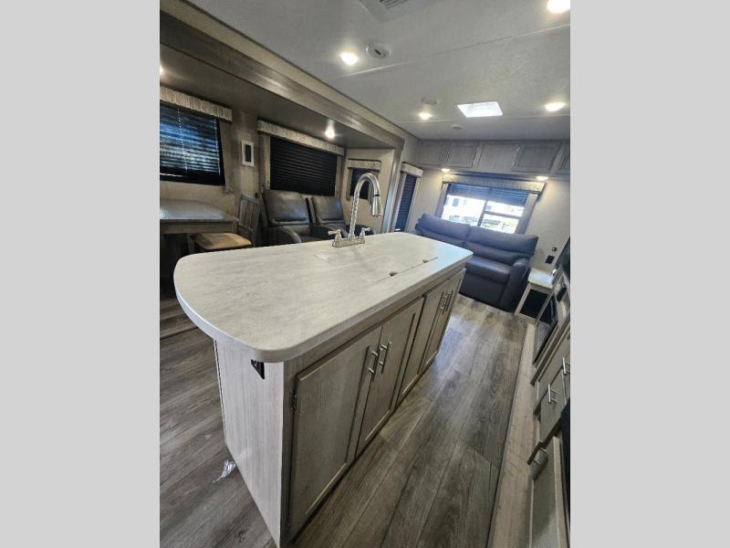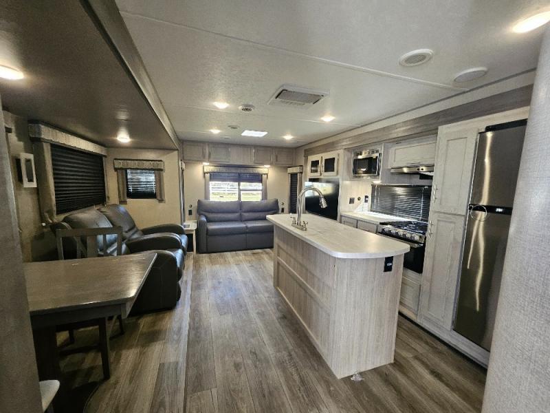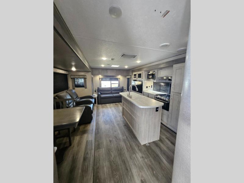 It's not hard to find comfort in this travel trailer with its triple slides, two lounge chairs, and spacious full bath. Once your crew is settled and unpacked, head outdoors to relax under the two power awnings with multicolored LED lights, or grab the fishing poles from the exterior storage and head to the water. If you'd rather spend your day inside you'll find all the comforts of home; dual lounge chairs, a sofa and booth dinette, plus a fully equipped kitchen, complete with a kitchen island! You will love having your own space in the front bedroom that includes a queen bed slide out, a dresser, plus two closets. There is even washer and dryer prep if you plan to go full-time!