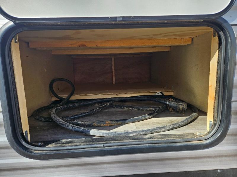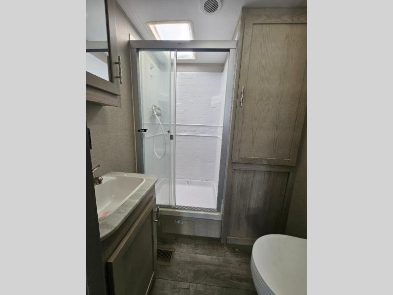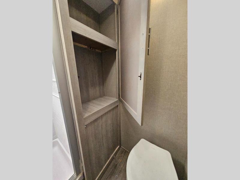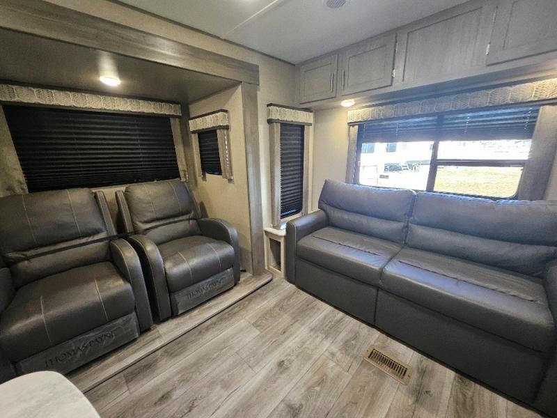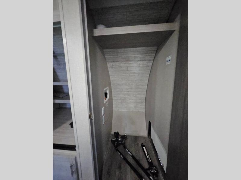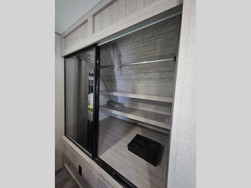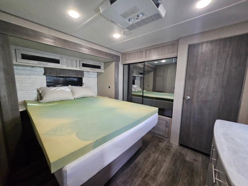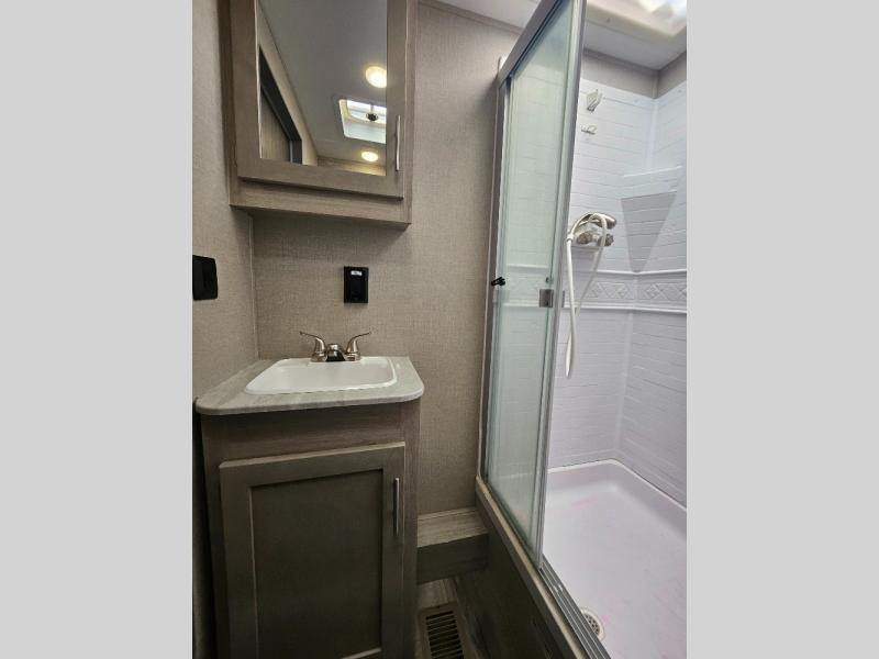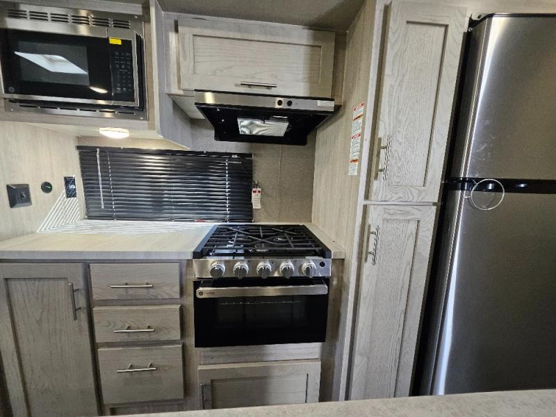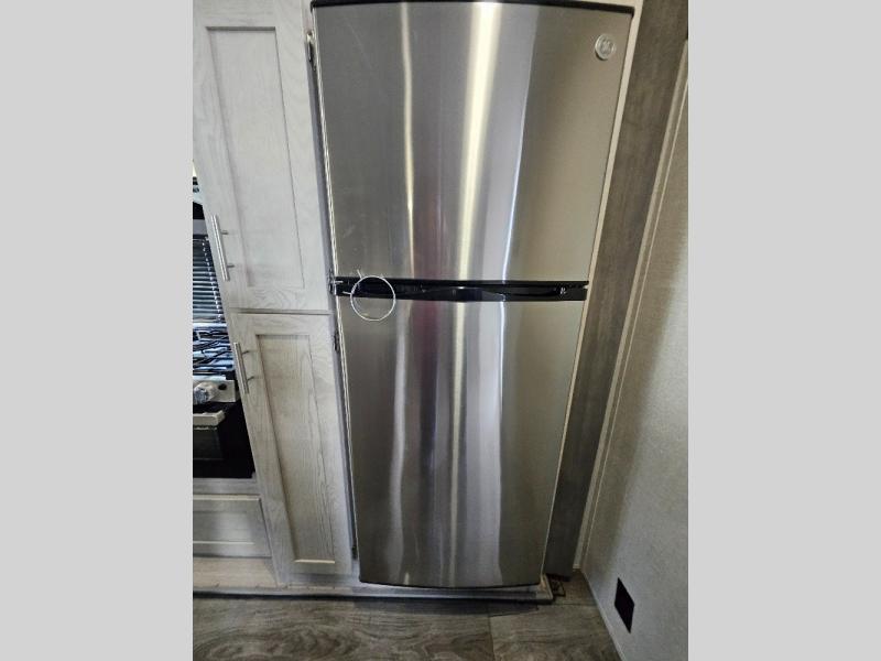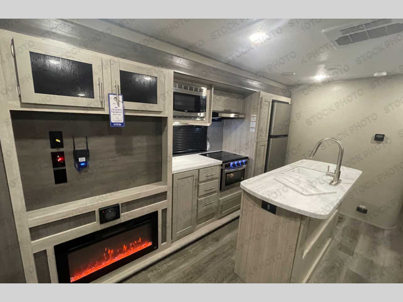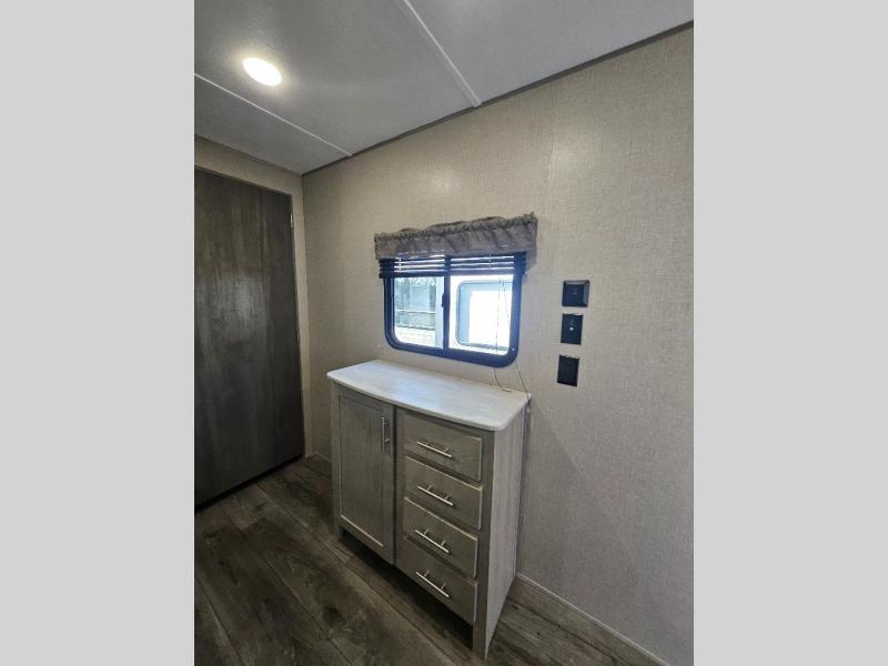It's not hard to find comfort in this travel trailer with its triple slides, two lounge chairs, and spacious full bath. Once your crew is settled and unpacked, head outdoors to relax under the two power awnings with multicolored LED lights, or grab the fishing poles from the exterior storage and head to the water. If you'd rather spend your day inside you'll find all the comforts of home; dual lounge chairs, a sofa and booth dinette, plus a fully equipped kitchen, complete with a kitchen island! You will love having your own space in the front bedroom that includes a queen bed slide out, a dresser, plus two closets. There is even washer and dryer prep if you plan to go full-time!